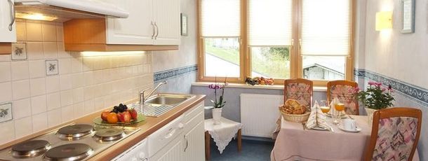 Ebenerdig gelegene Wohnung mit Terrasse, Gartenbestuhlung und Sonnenliegen. Sehr geschmackvolle Ausstattung und angenehmes Ambiente. Neben der gemütlichen Essecke finden Sie eine komplett ausgestattete Küchenzeile mit 2-Platten-Herd, Kaffeemaschine, Wasserkocher, Eierkocher, ausreichend Geschirr, Tisch und Küchenwäsche, sowie Spülmittel vor.