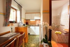 Küche mit kleiner Sitzecke, Mikrowelle, EHerd, Kaffeemaschine, Wasserkocher