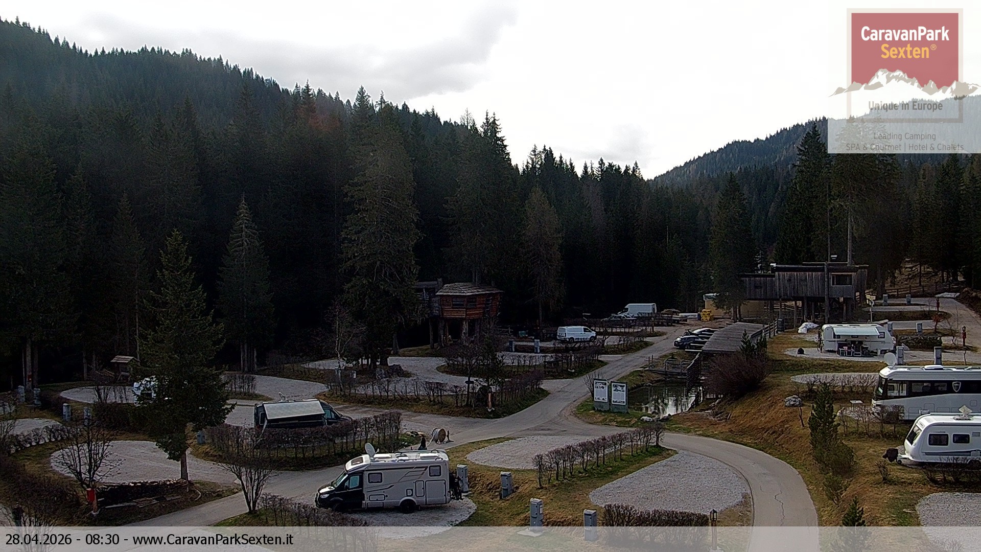 Archived webcam image showing Caravanpark of Sexten - Moos on 28 Apr 2026 at 08:00 07:00