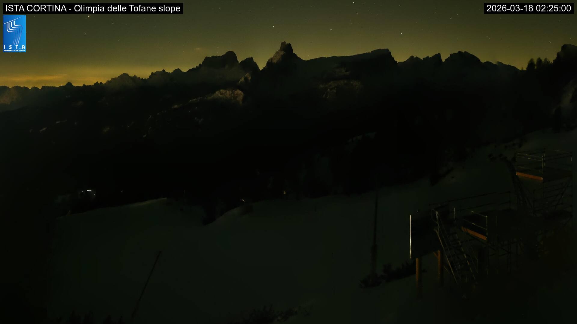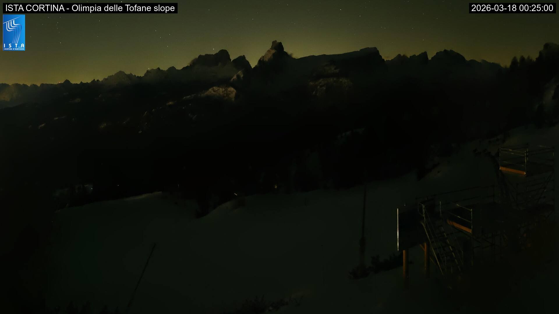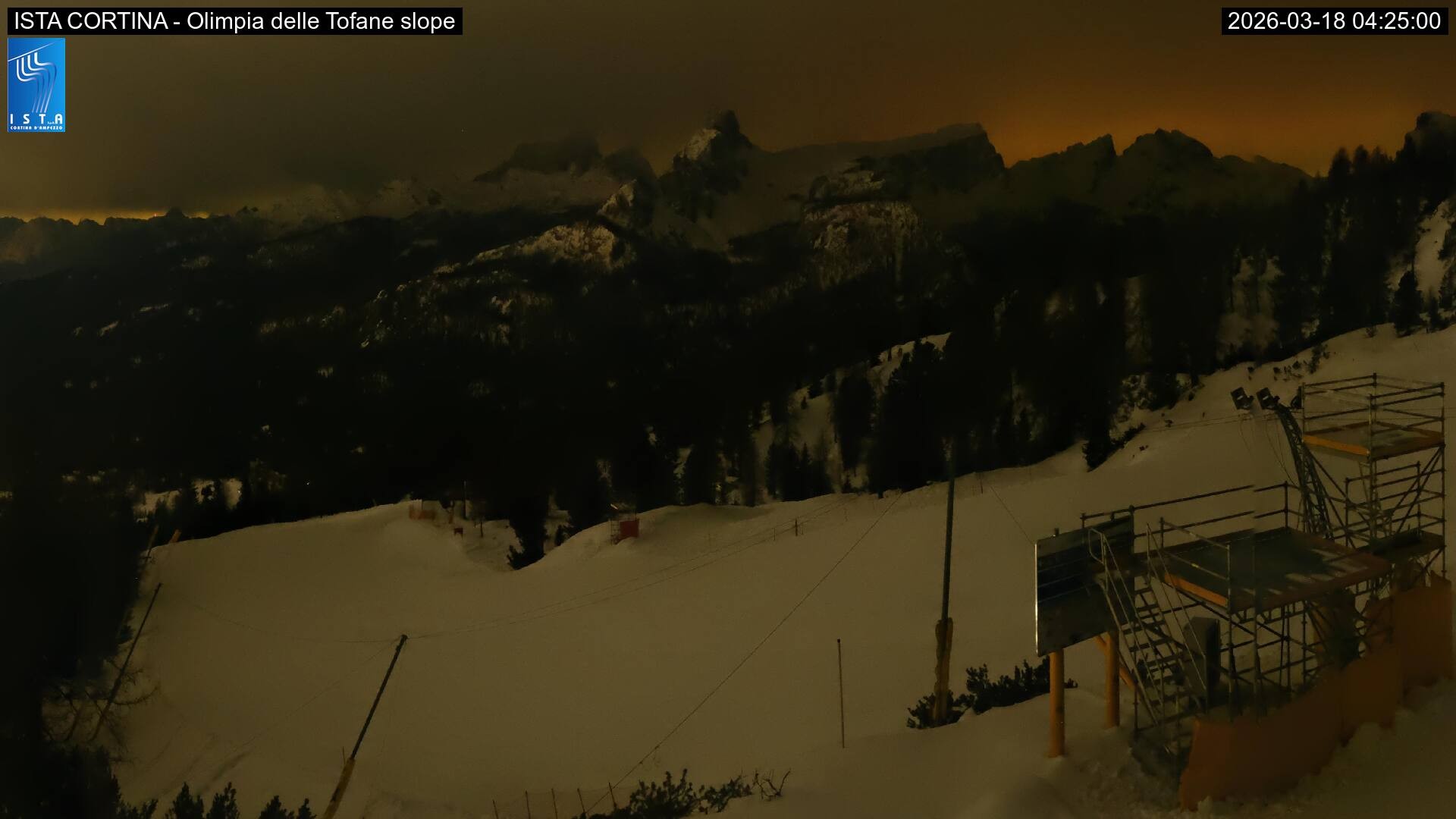 Archived webcam image showing Cortina d'Ampezzo: World Cup slope from Rifugio Duca d'Aosta on 18 Mar 2026 at 00:23 23:00