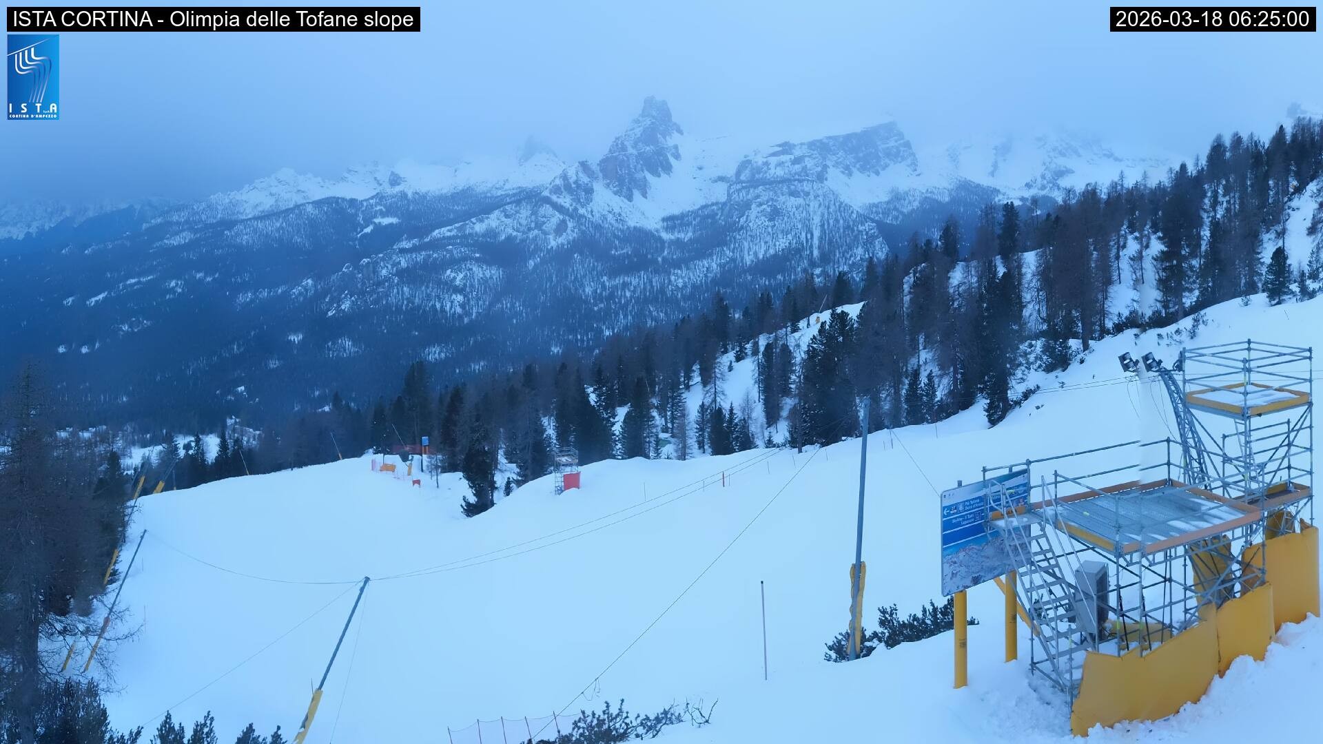 Archived webcam image showing Cortina d'Ampezzo: World Cup slope from Rifugio Duca d'Aosta on 18 Mar 2026 at 06:23 05:00