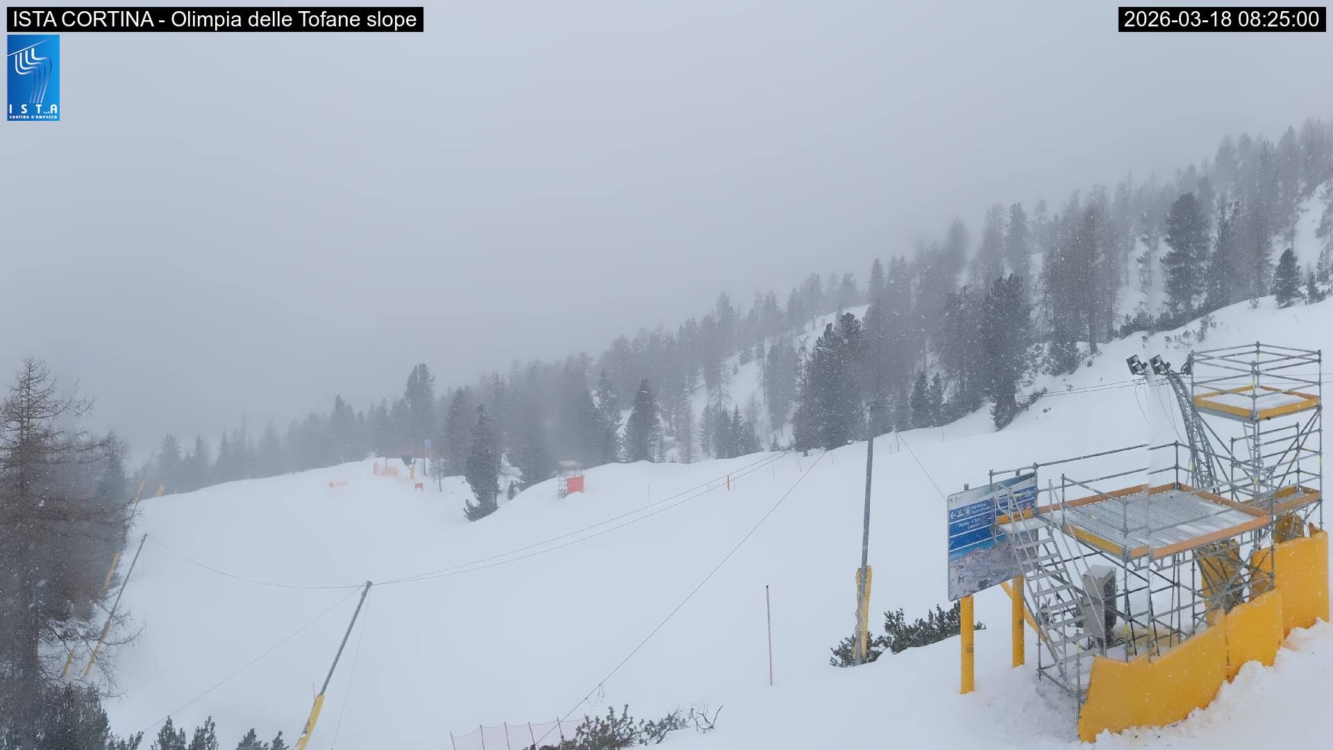 Archived webcam image showing Cortina d'Ampezzo: World Cup slope from Rifugio Duca d'Aosta on 18 Mar 2026 at 08:23 07:00