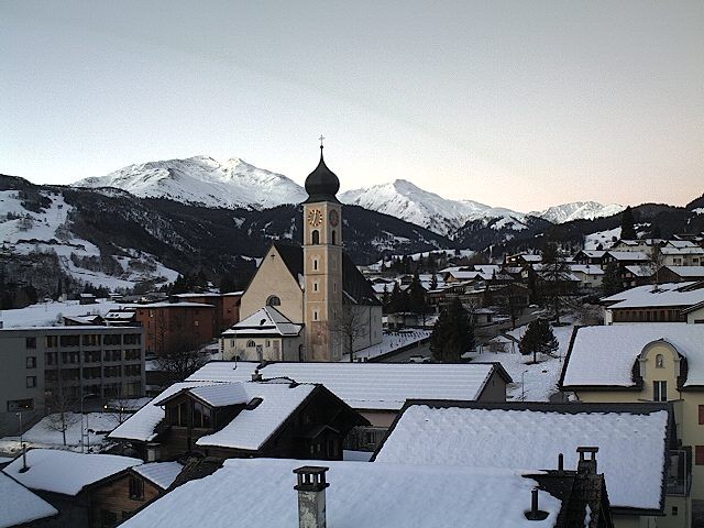 Archived webcam image showing church of Disentis on 26 Feb 2026 at 06:36 05:00