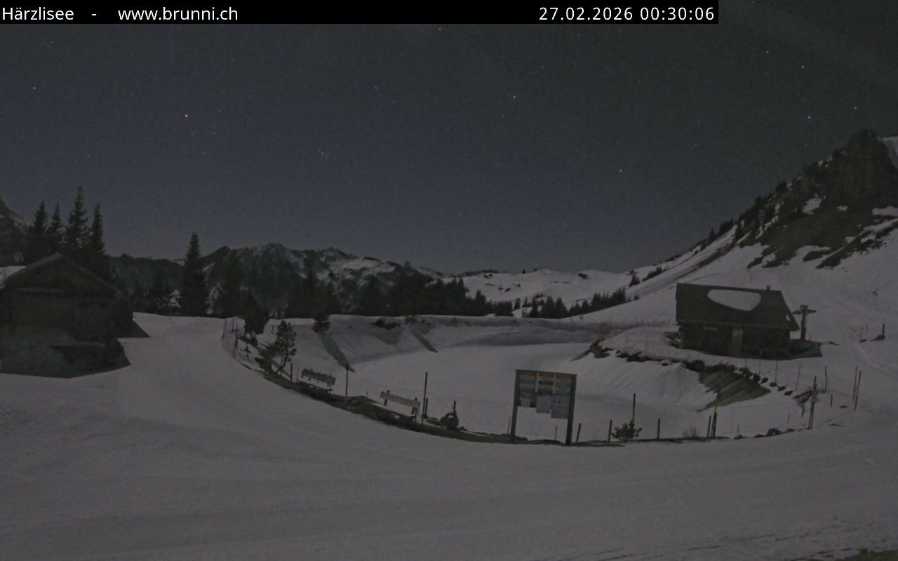 Archived webcam image showing Engelberg: Lake Härzlisee & mountain restaurant Kräuterhütte on 26 Feb 2026 at 00:56 23:00