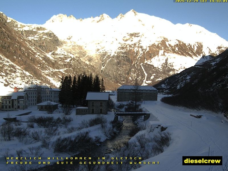 This webcam in Gletsch in the canton of Valais shows the train station of the "Dampfbahn Furka Bergstrecke" steam locomotive.