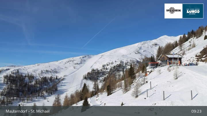 View over the slopes at the top station of the lift Grosseckbahn in Mauterndorf.