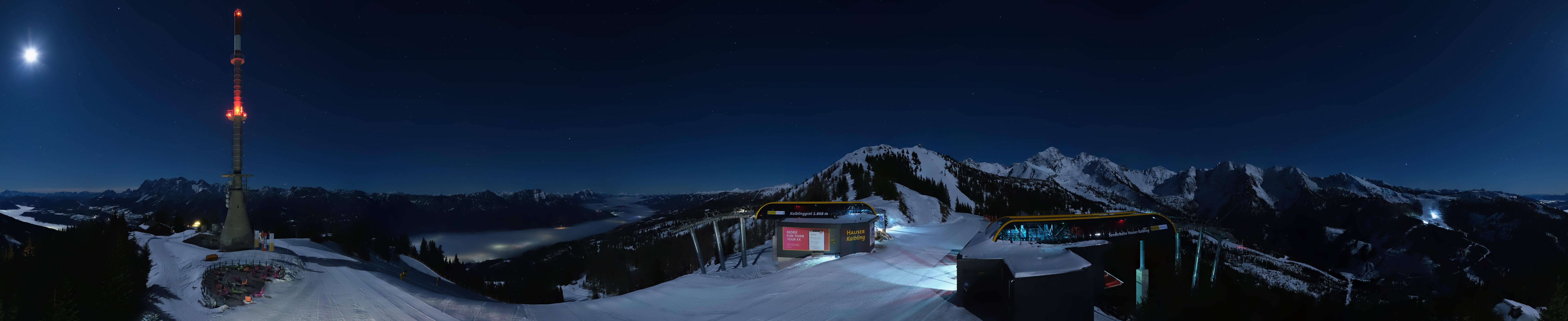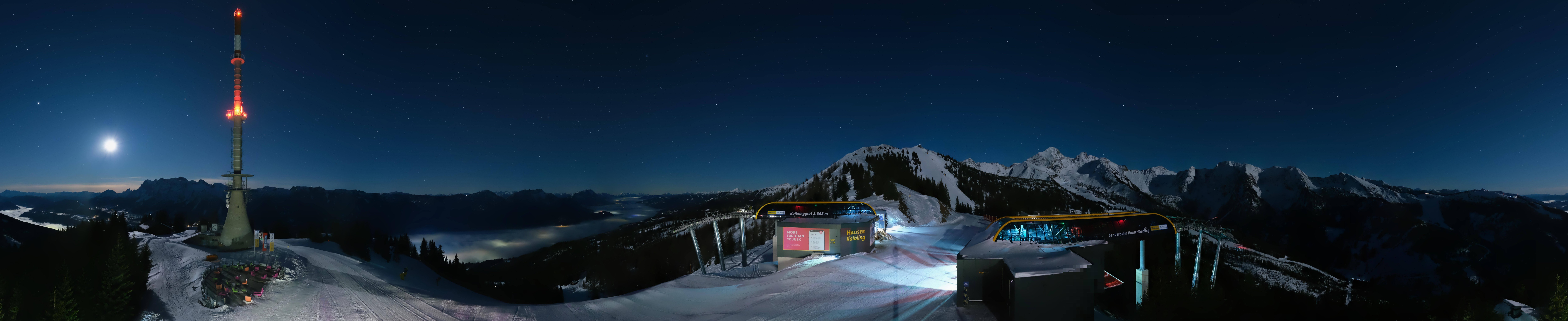 Archived webcam image showing Hauser Kaibling: Panoramic view at top station Senderbahn on 26 Feb 2026 at 00:32 23:00