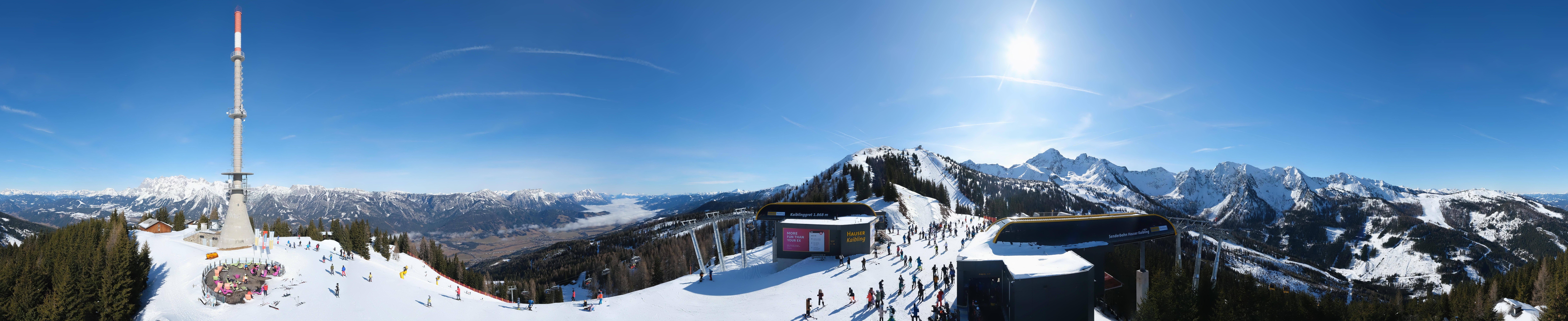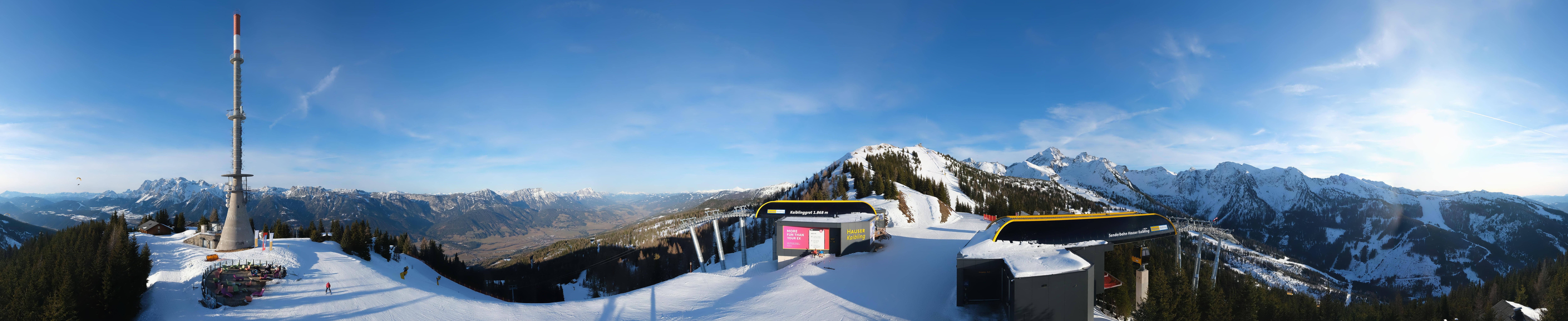 Archived webcam image showing Hauser Kaibling: Panoramic view at top station Senderbahn on 26 Feb 2026 at 16:32 Latest