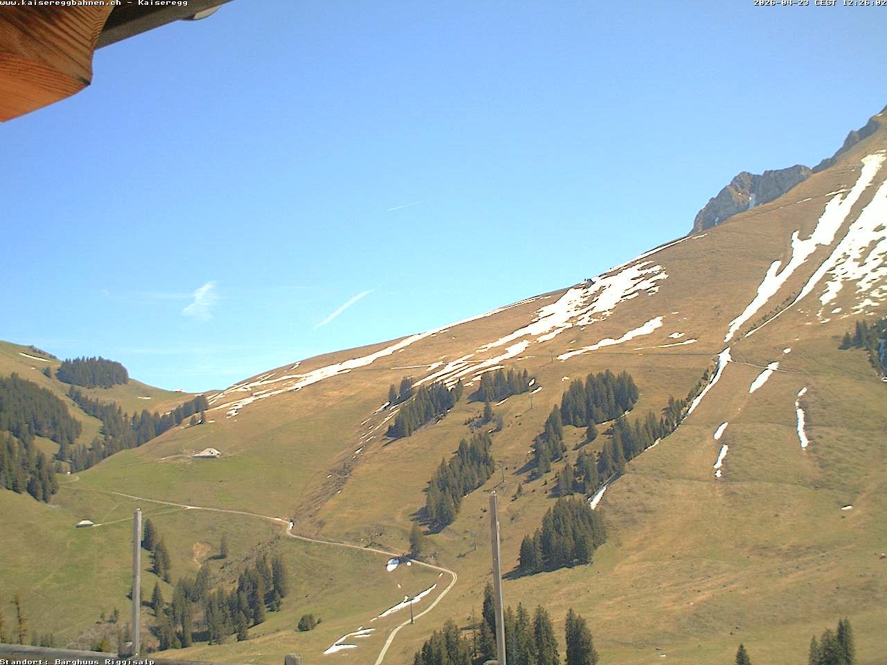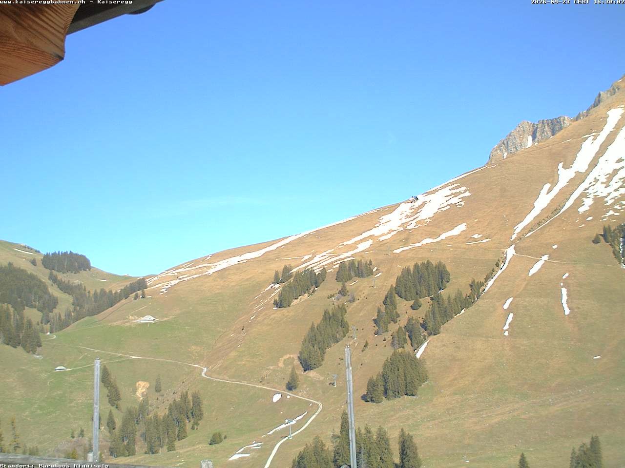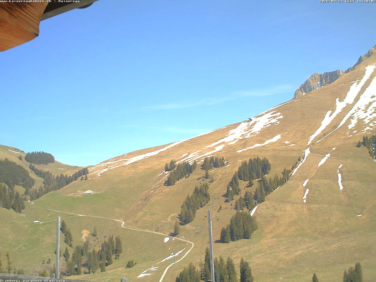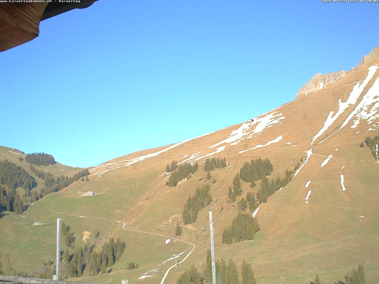 From the mountain hut Bärghuu Riggisalp, this webcam offers the view towards chairlift Kaiseregg. It is located in ski resort Schwarzsee Riggisalp Kaiseregg.