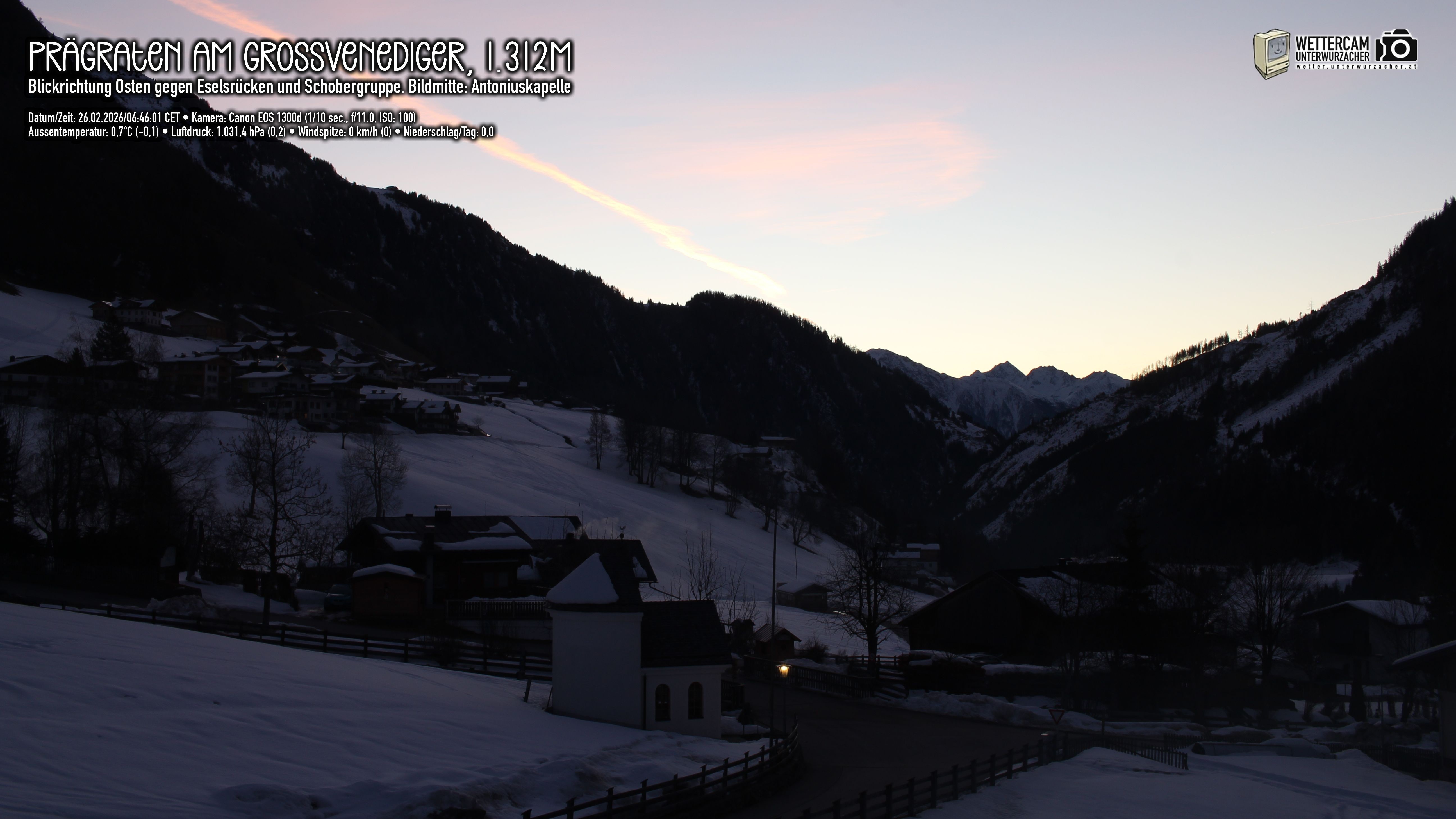 Archived webcam image showing Prägraten in East Tyrol on 26 Feb 2026 at 04:18 03:00