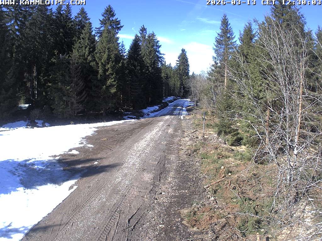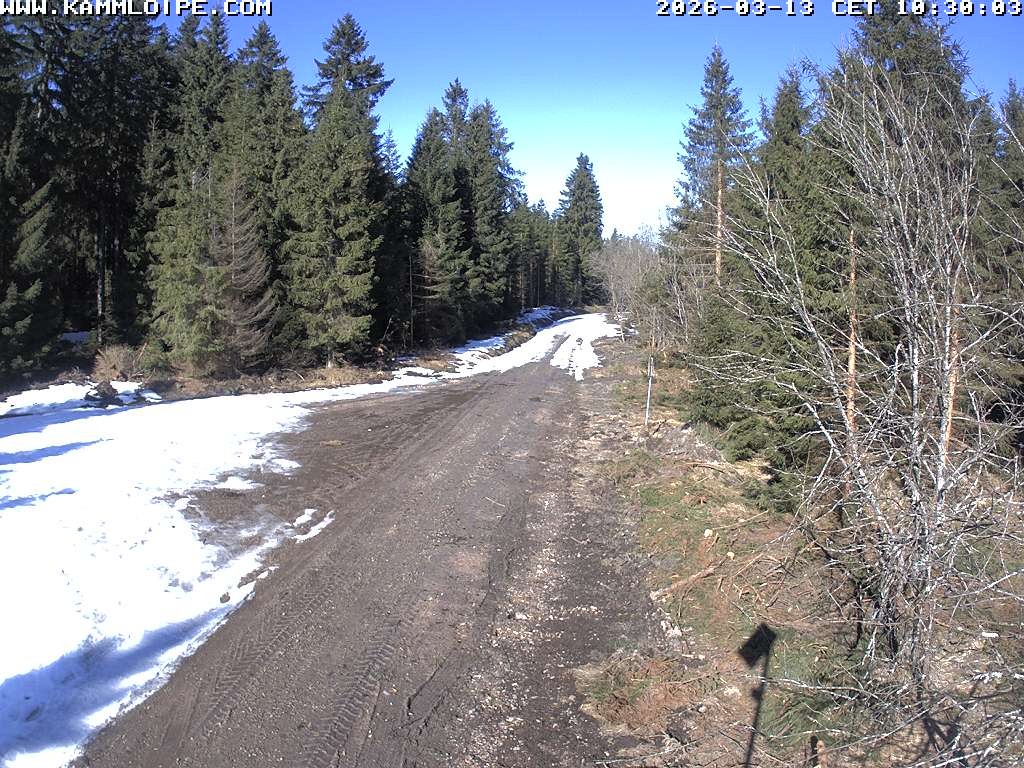 Located at Flößweg near Carlsfeld, the webcam shows the cross-country ski trail Kammloipe.