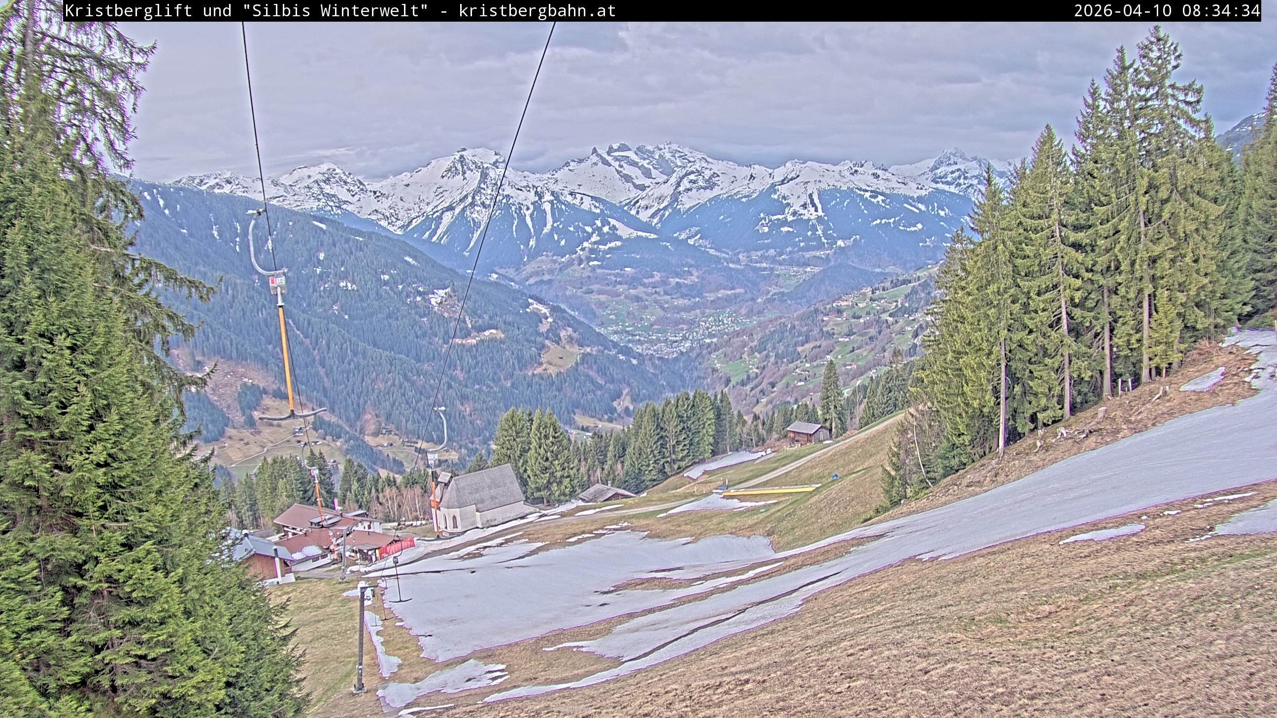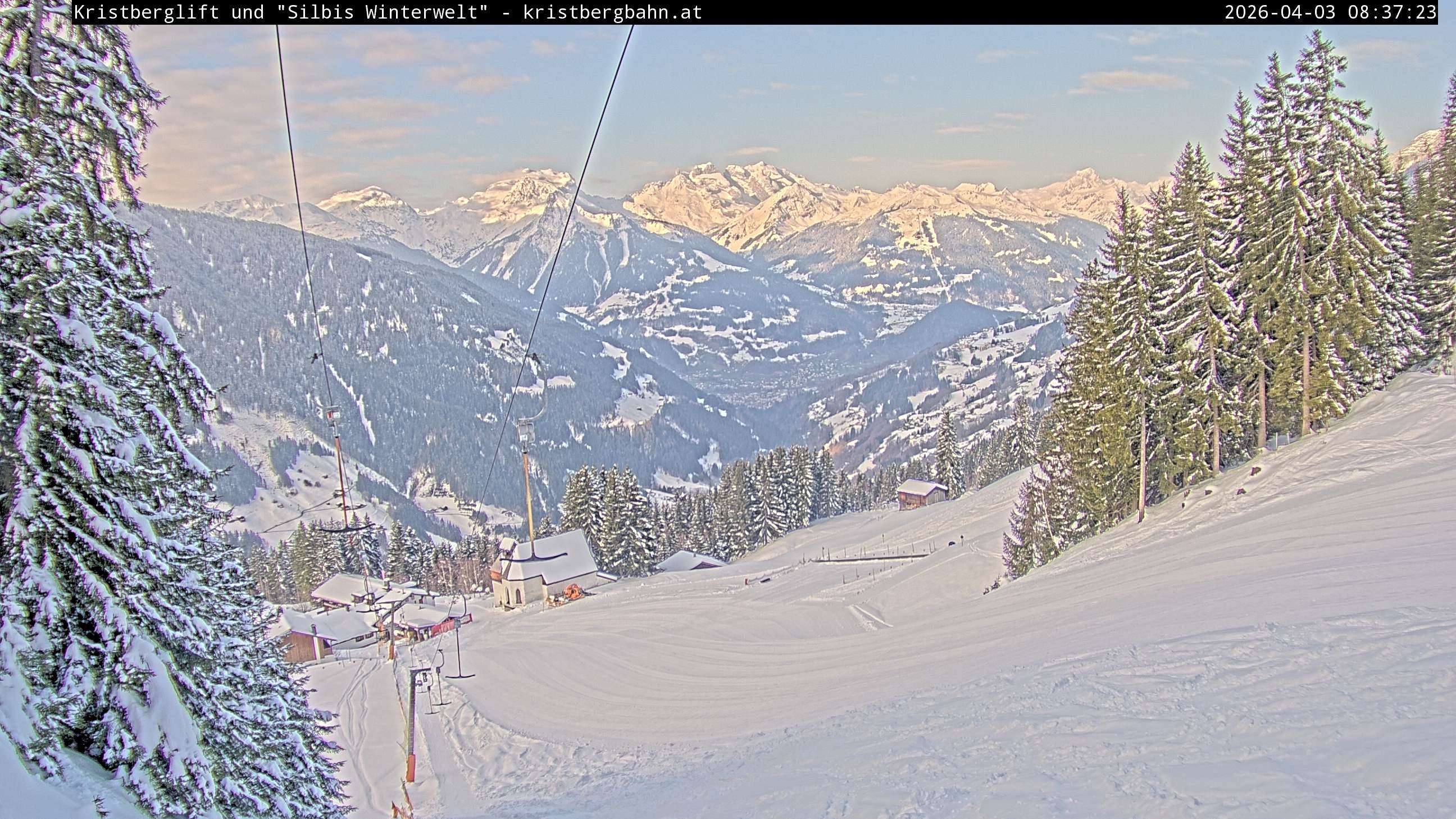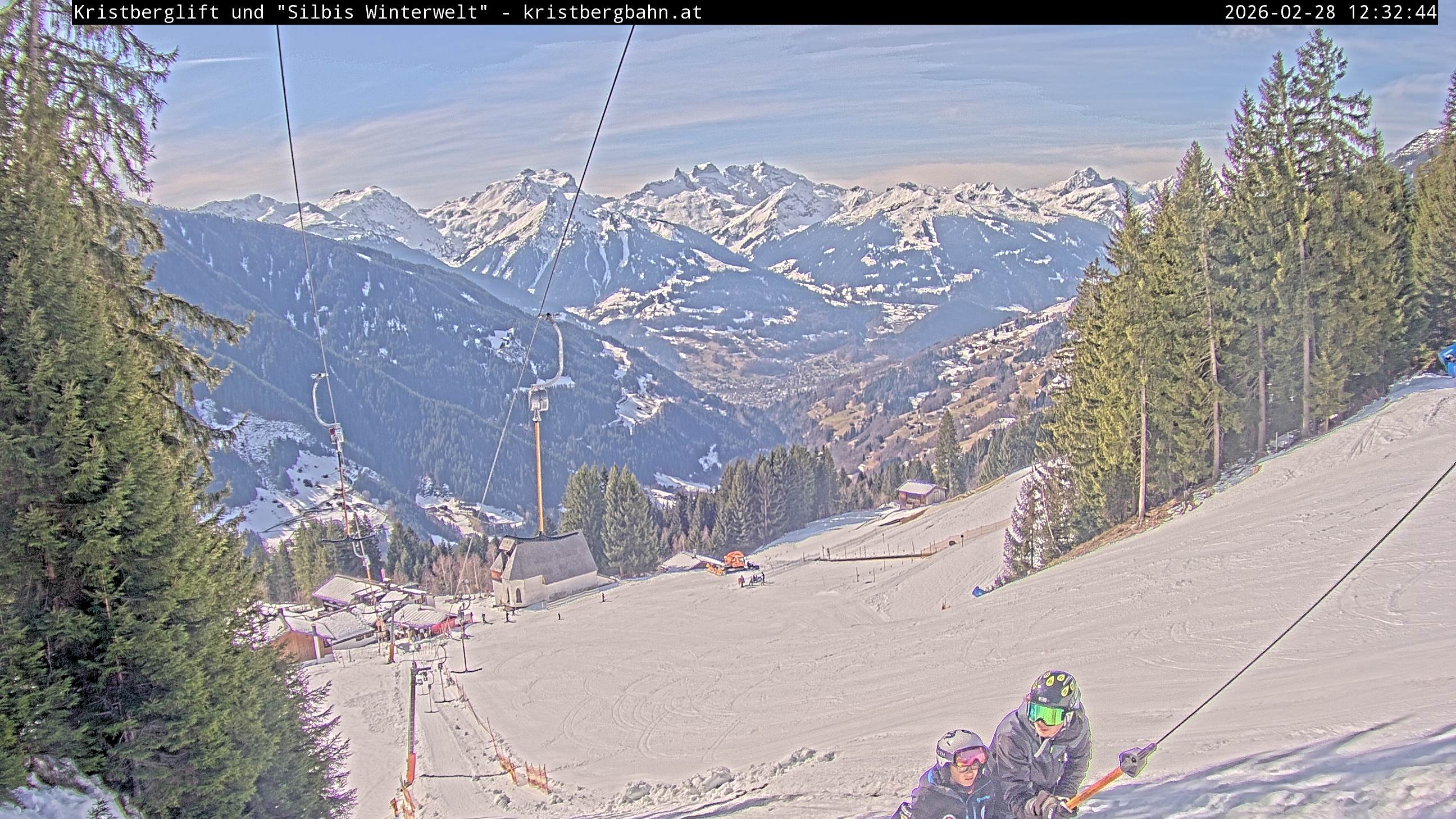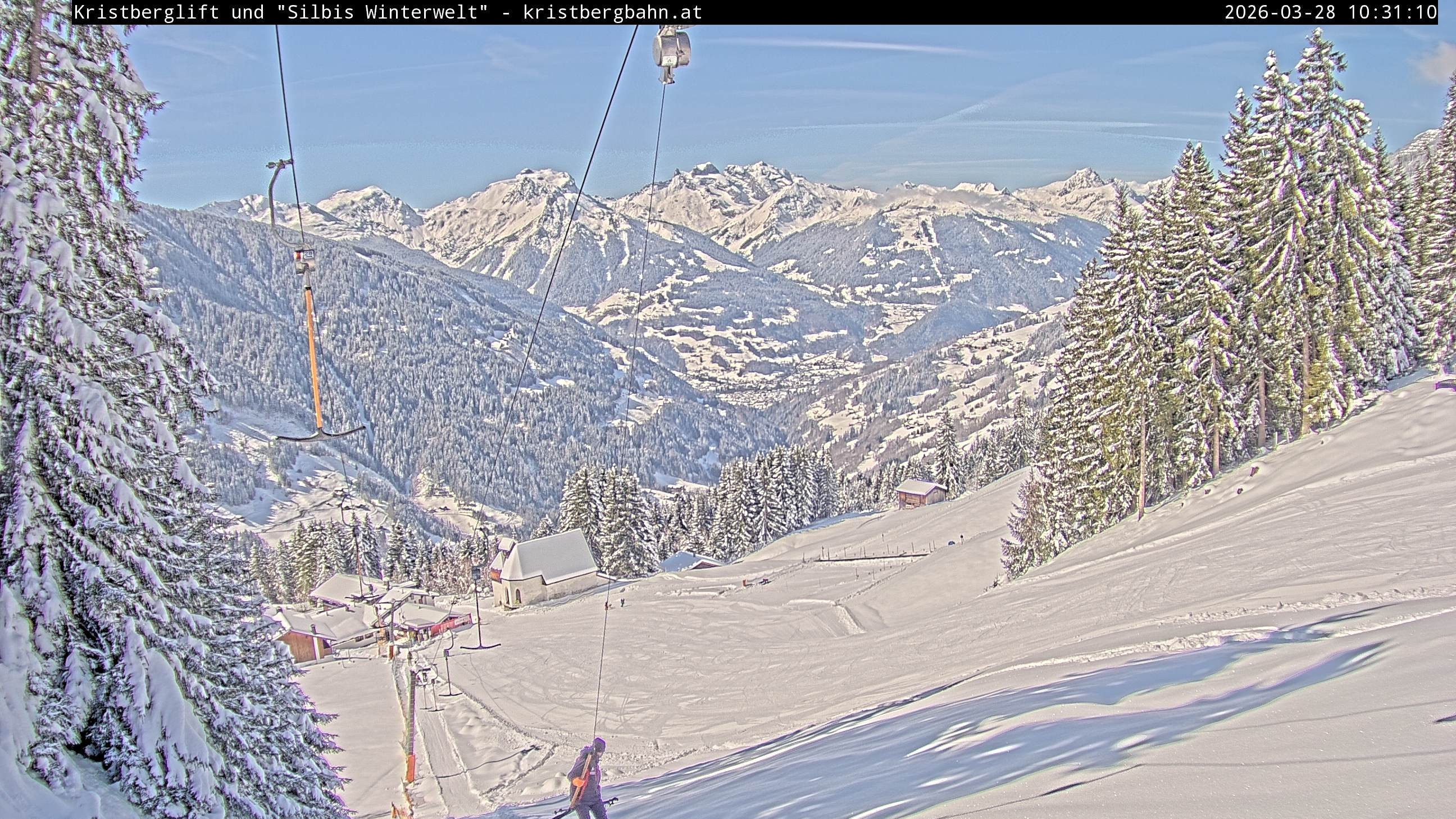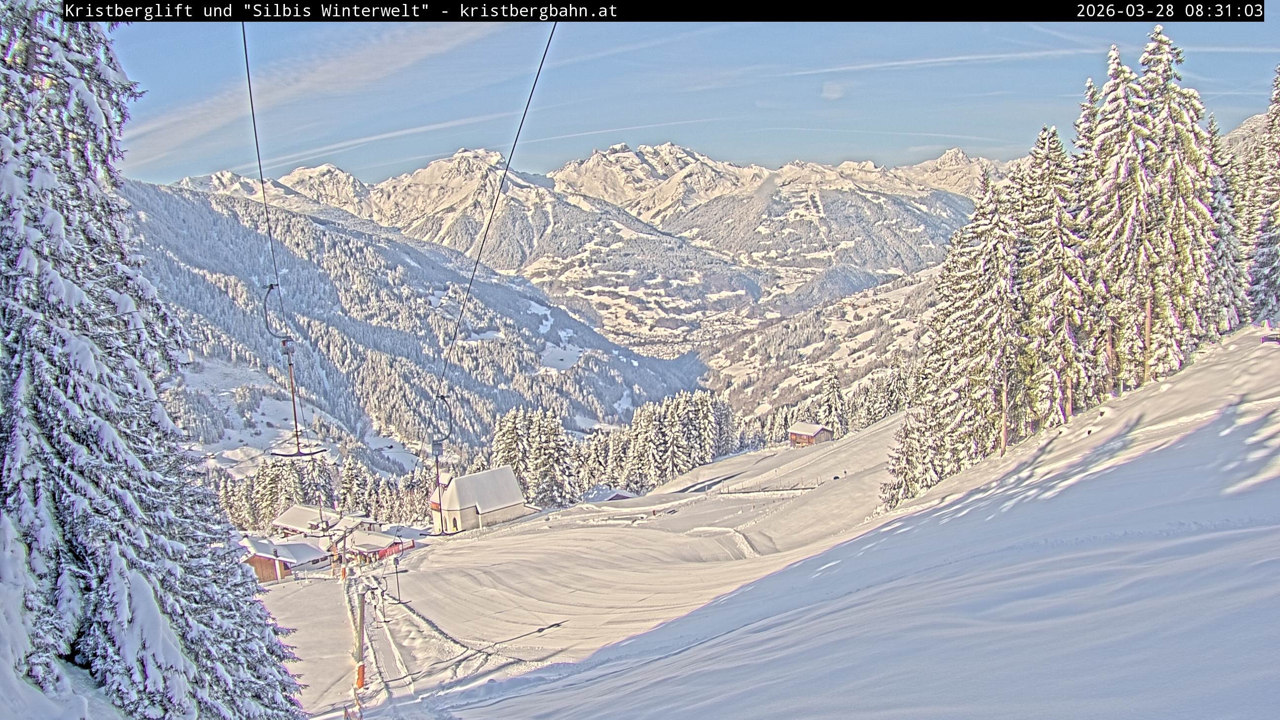 The webcam shows the view at Kristberglift and slope in ski resort Silbertal-Kristberg, Montafon. One also can spot the restaurant "Panoramagasthof Kristberg" and St. Agatha chapel, as well as Verwall-and Rätikon mountain chain.