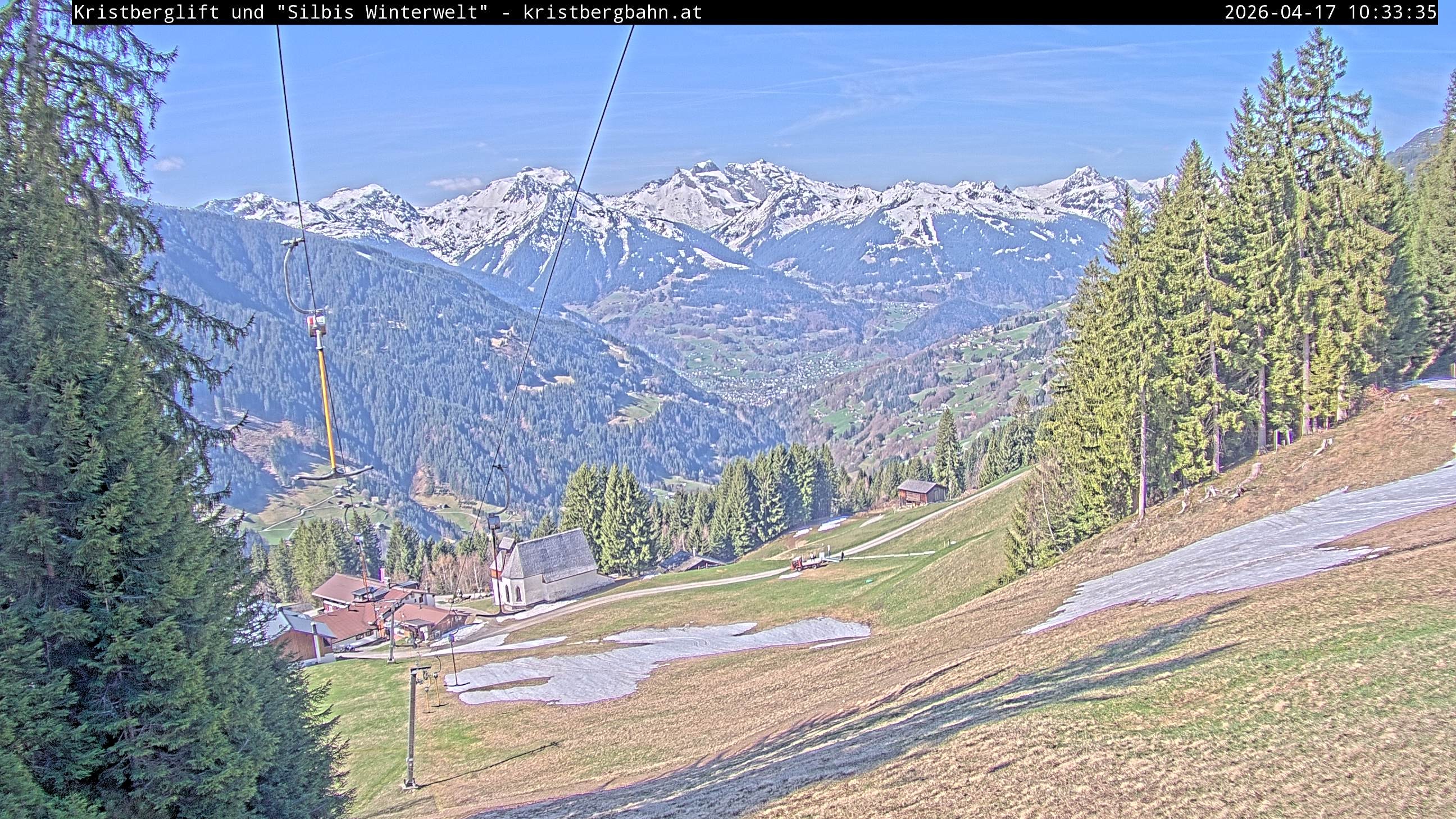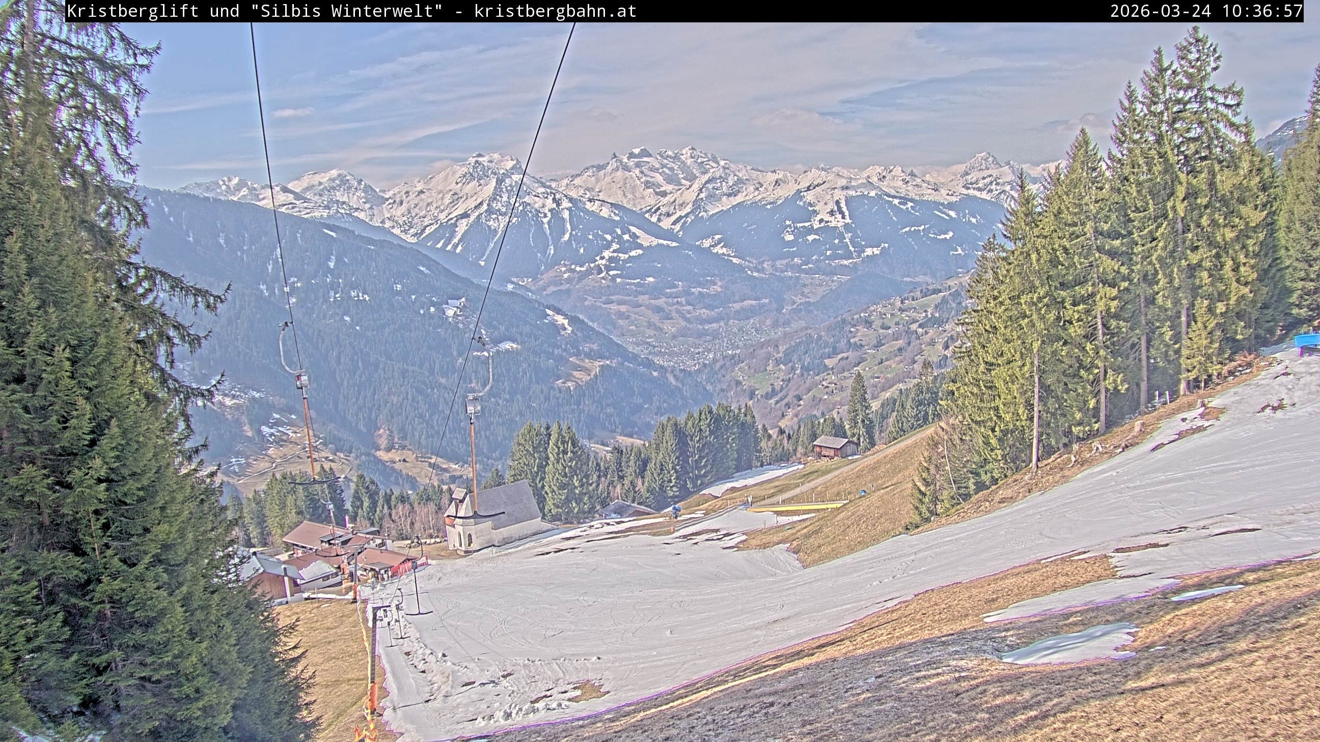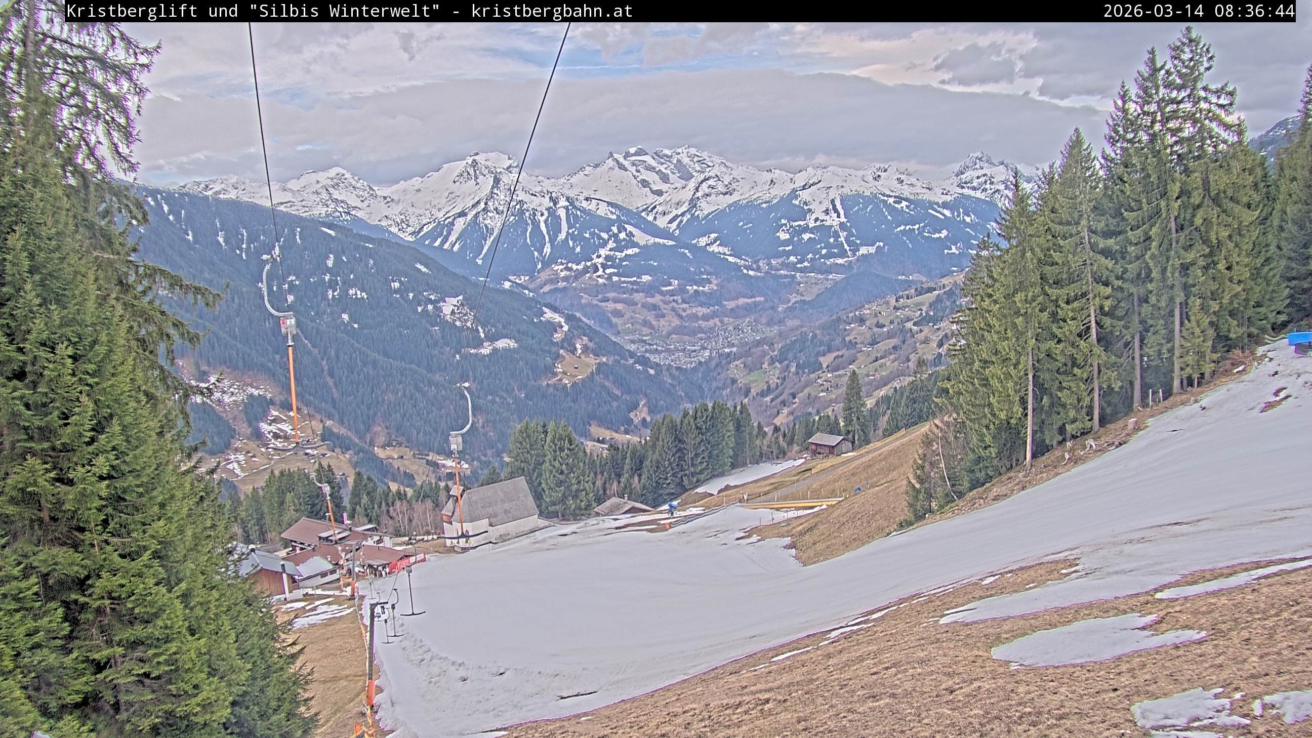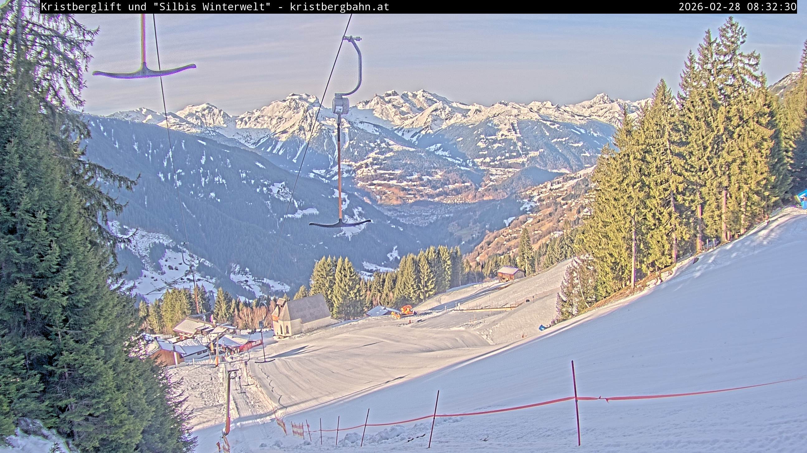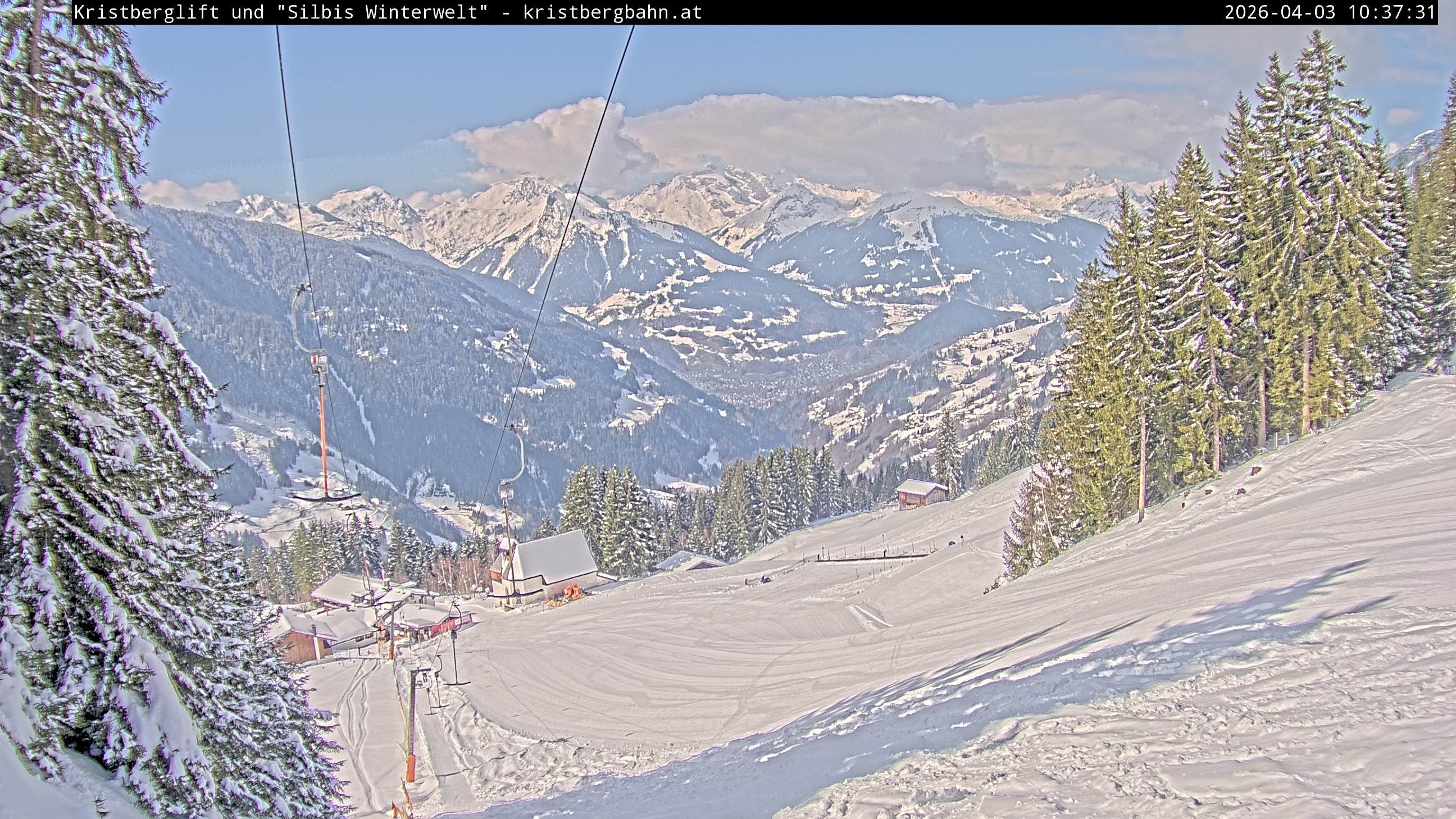 The webcam shows the view at Kristberglift and slope in ski resort Silbertal-Kristberg, Montafon. One also can spot the restaurant "Panoramagasthof Kristberg" and St. Agatha chapel, as well as Verwall-and Rätikon mountain chain.