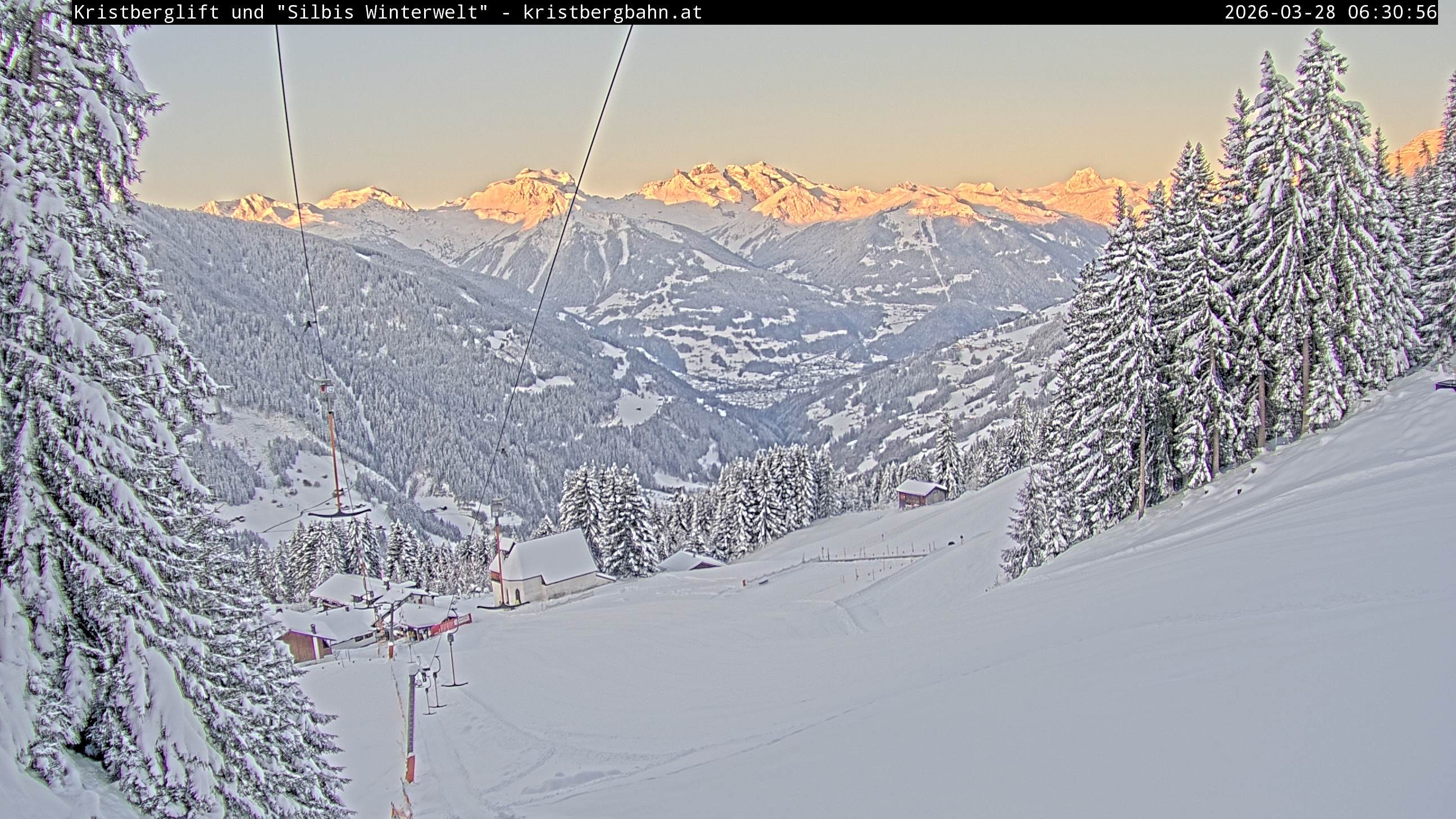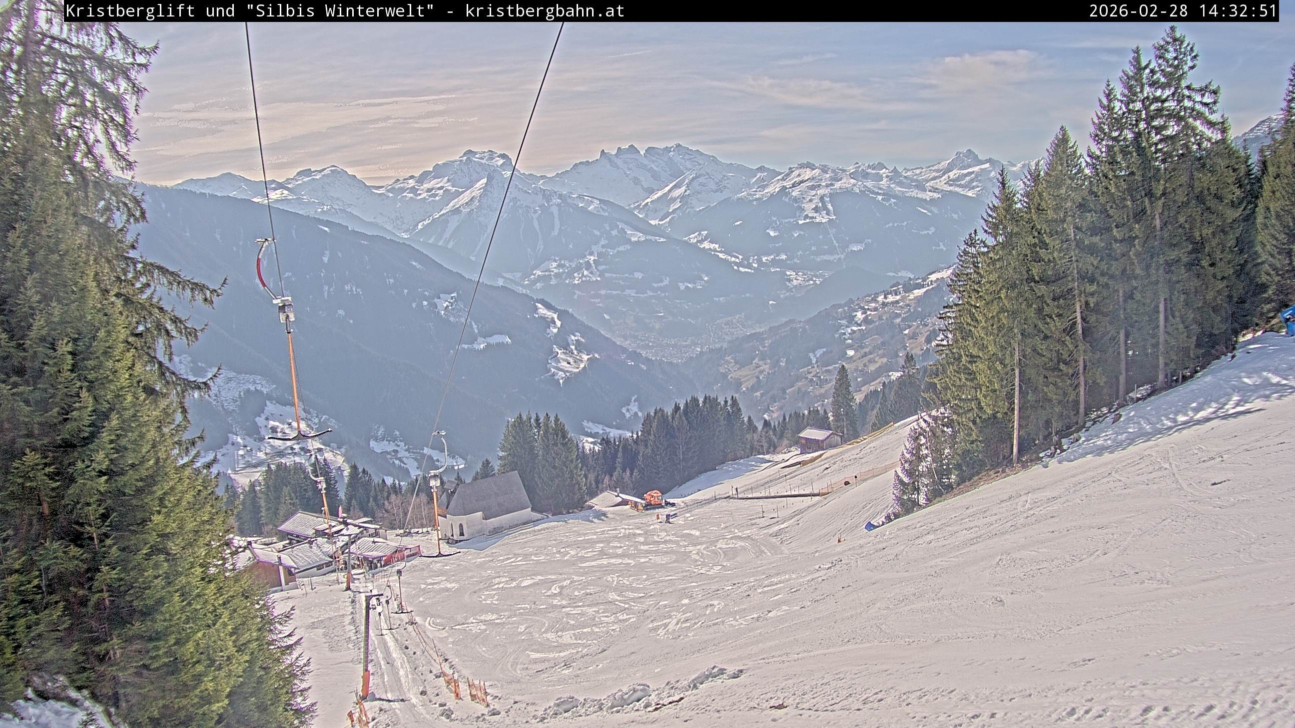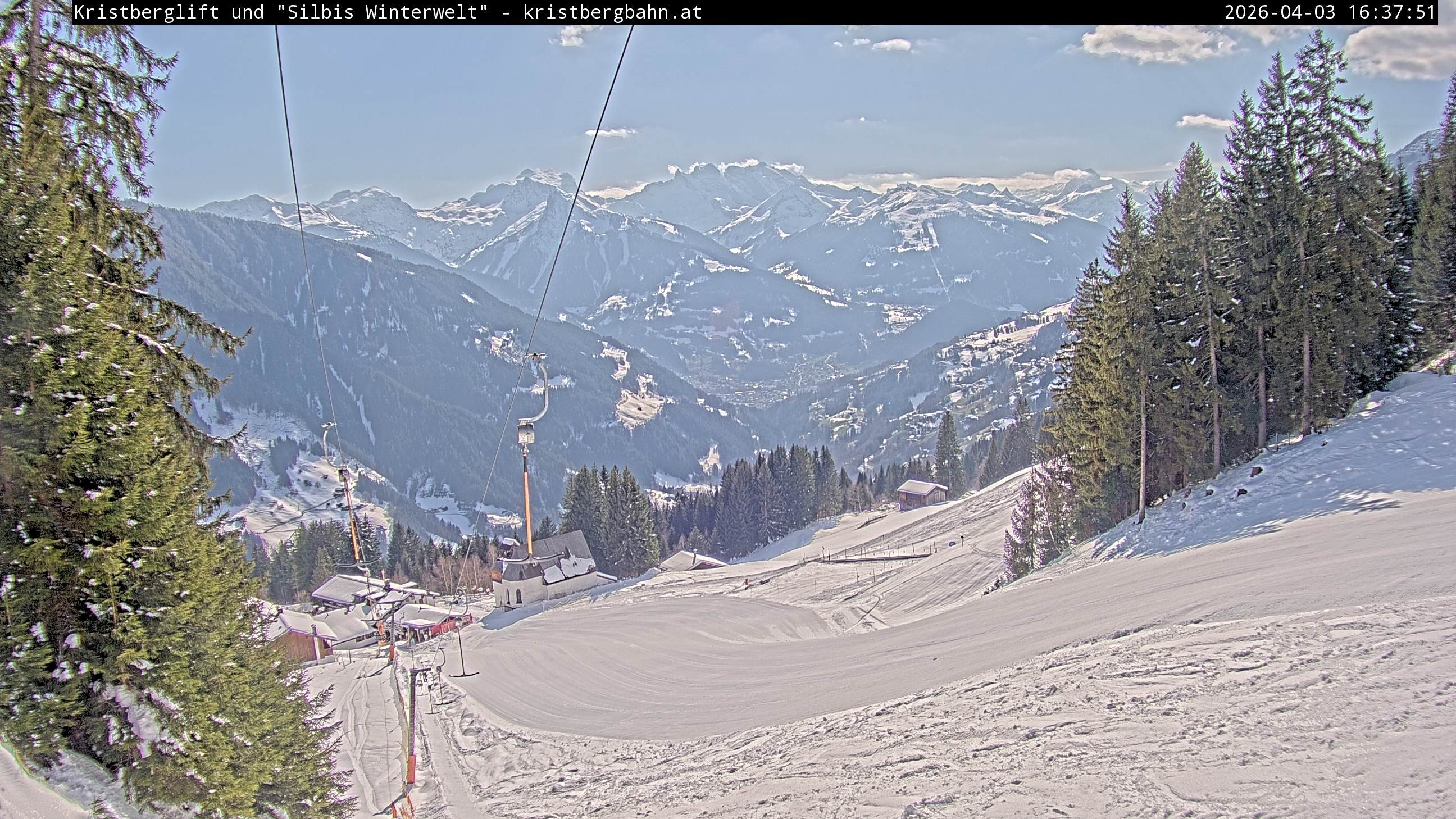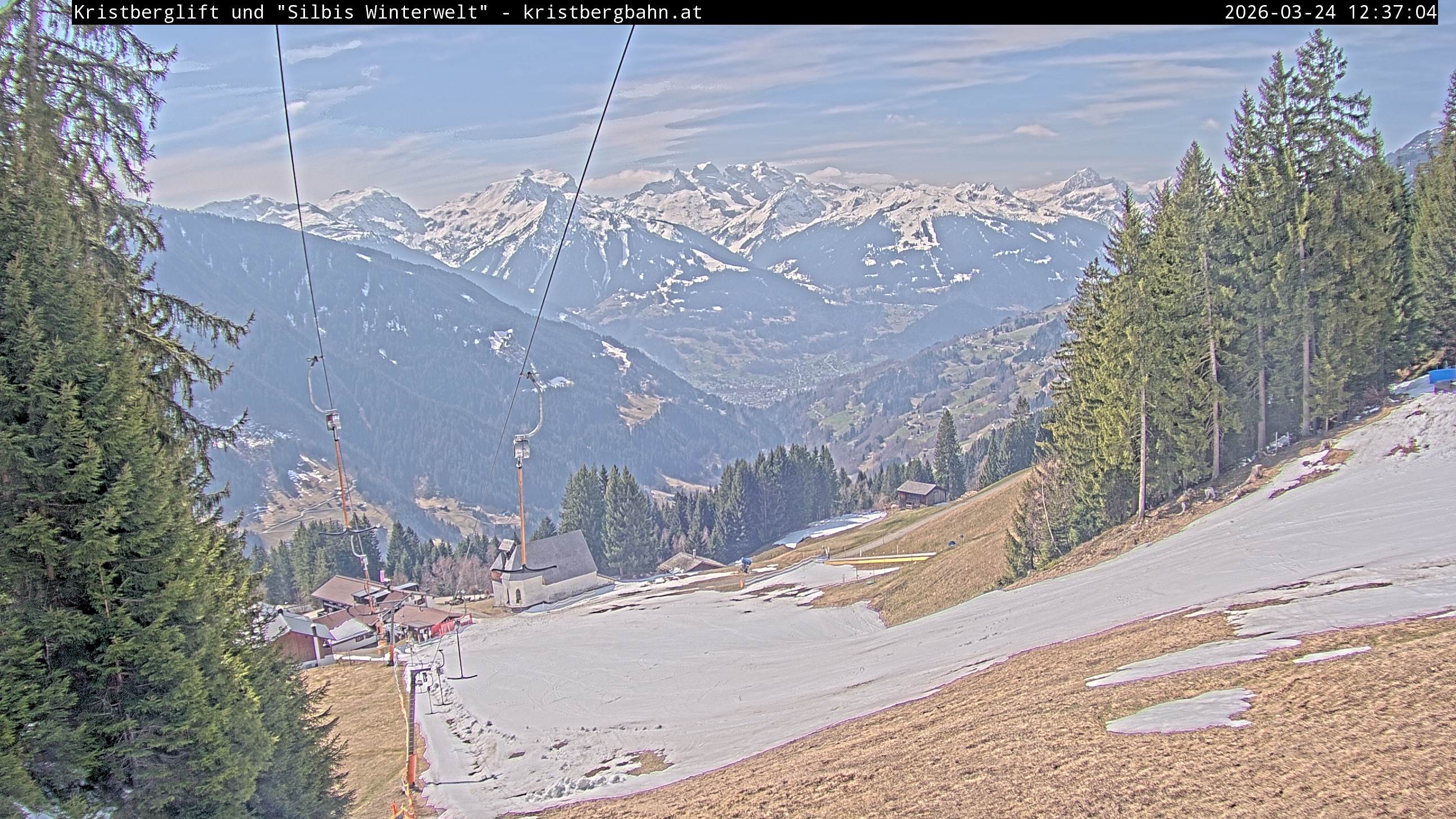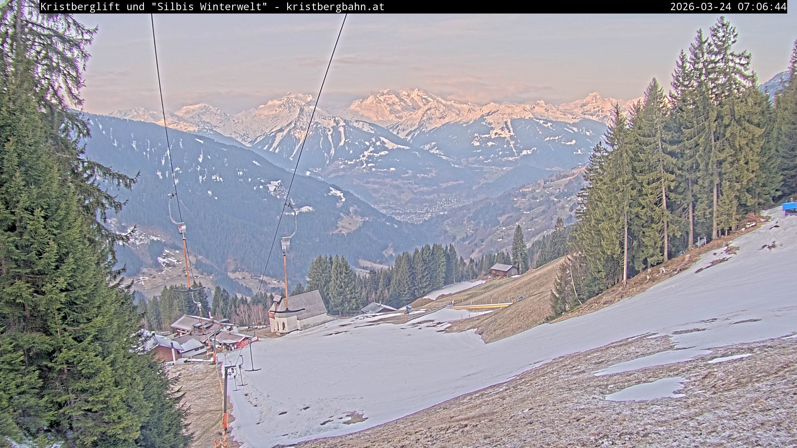 The webcam shows the view at Kristberglift and slope in ski resort Silbertal-Kristberg, Montafon. One also can spot the restaurant "Panoramagasthof Kristberg" and St. Agatha chapel, as well as Verwall-and Rätikon mountain chain.