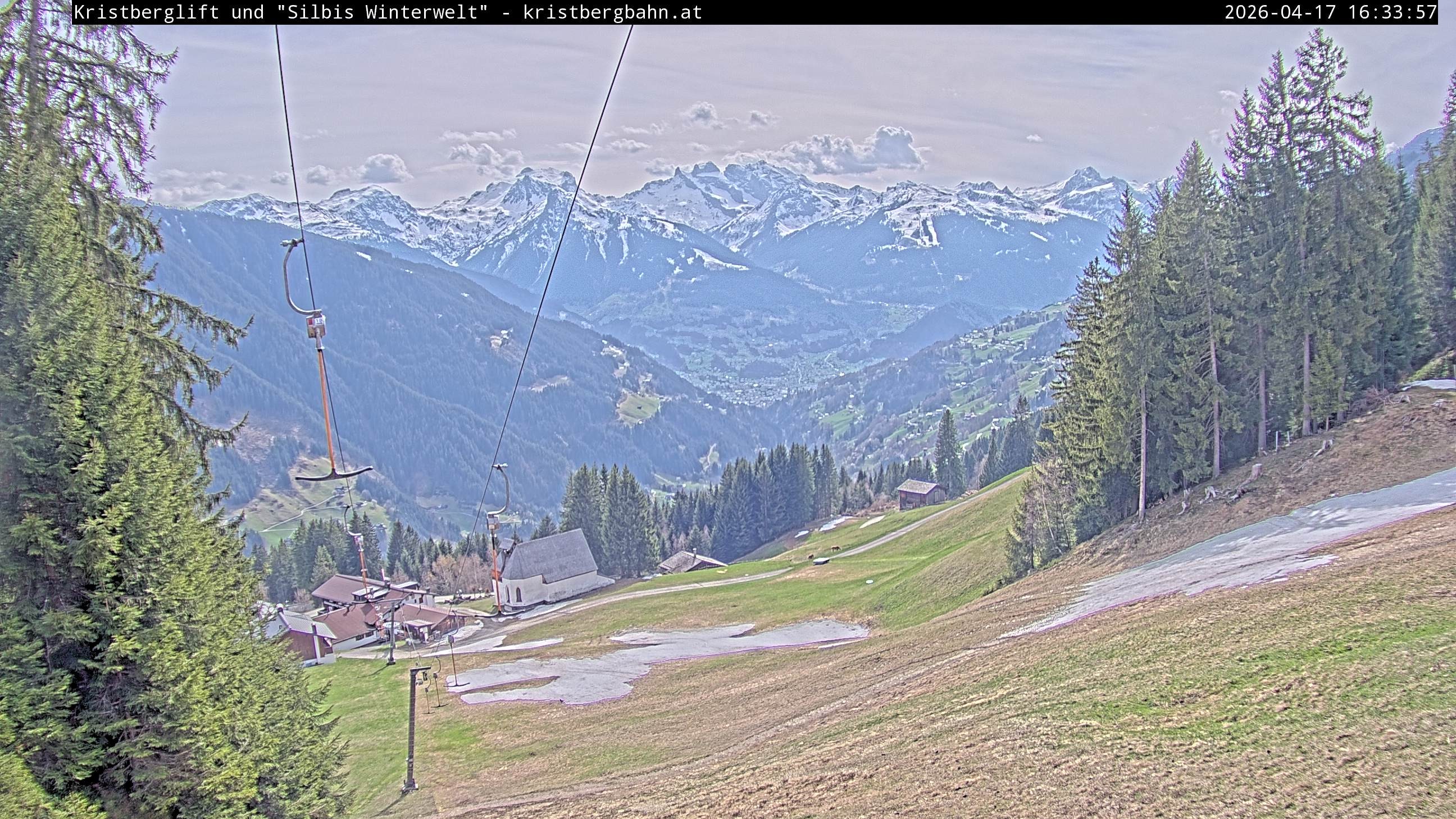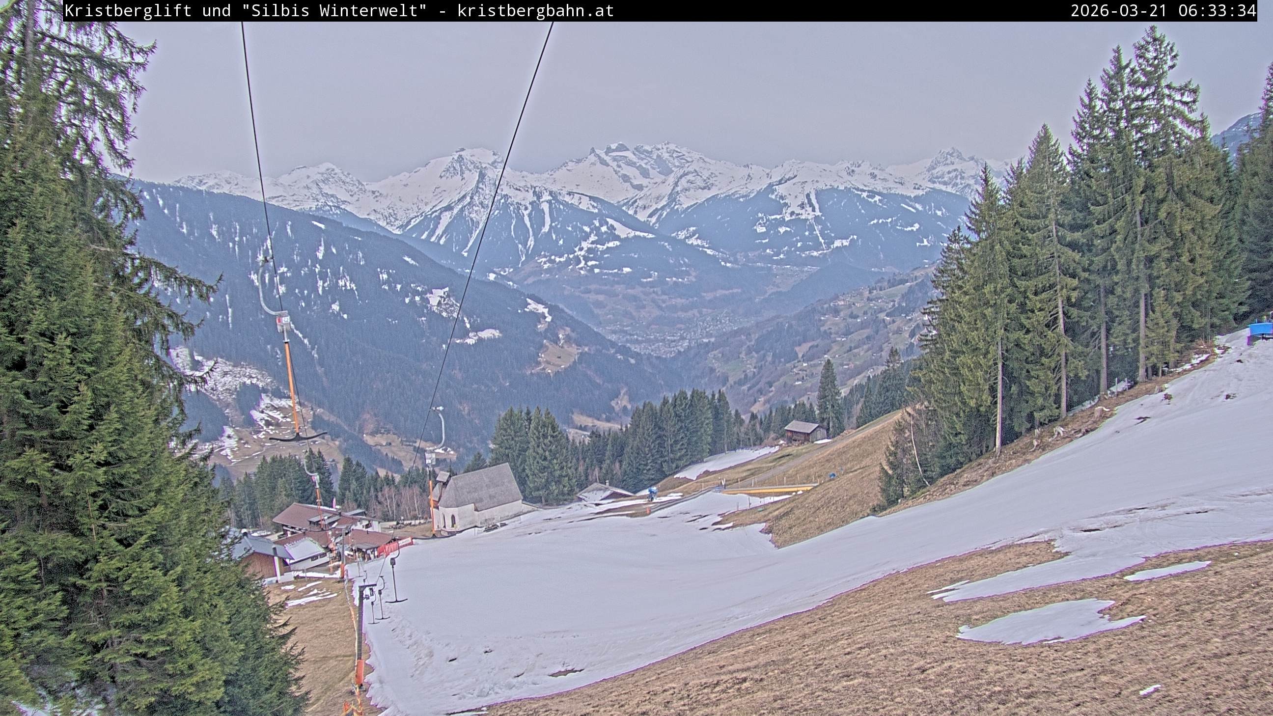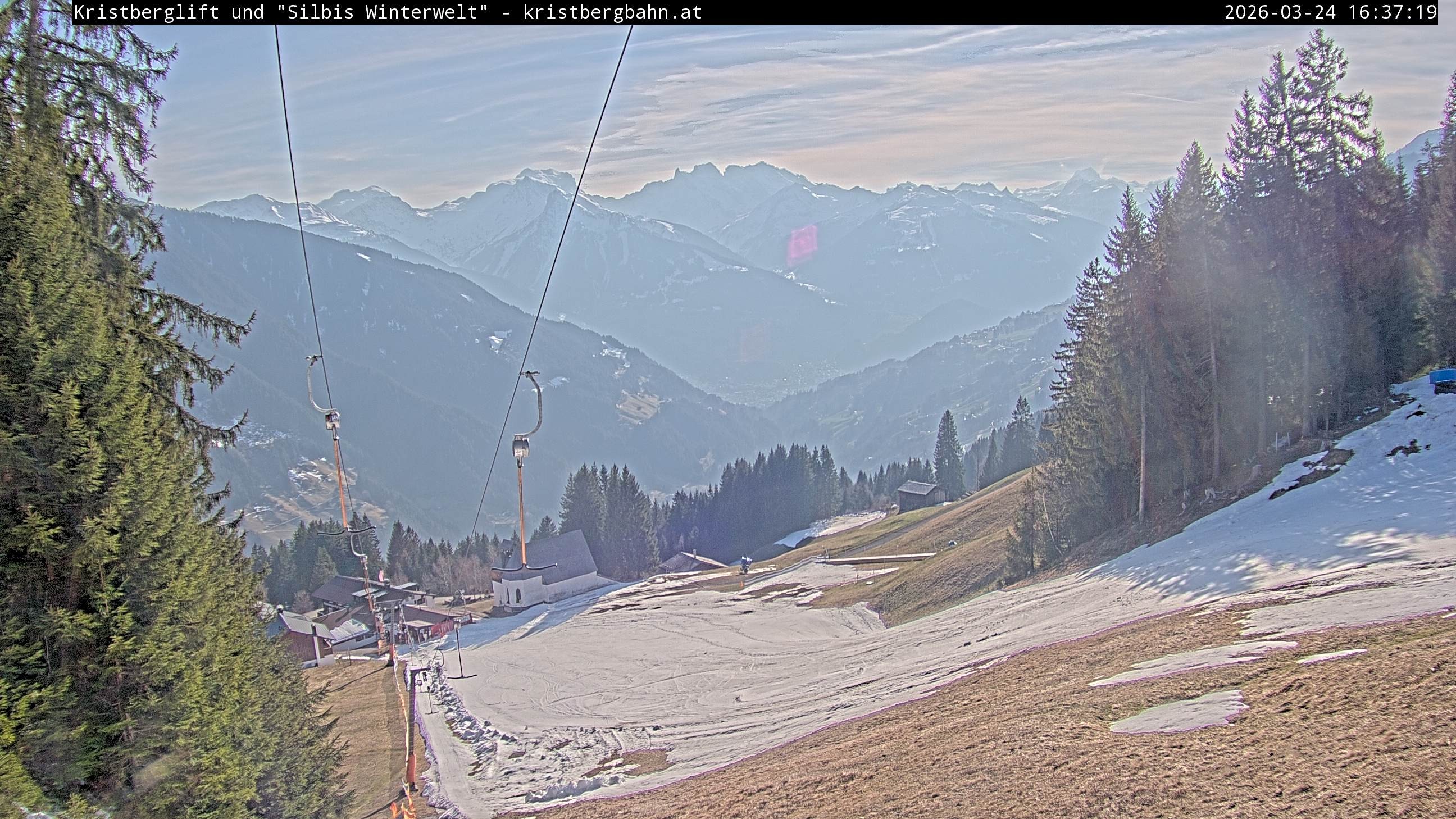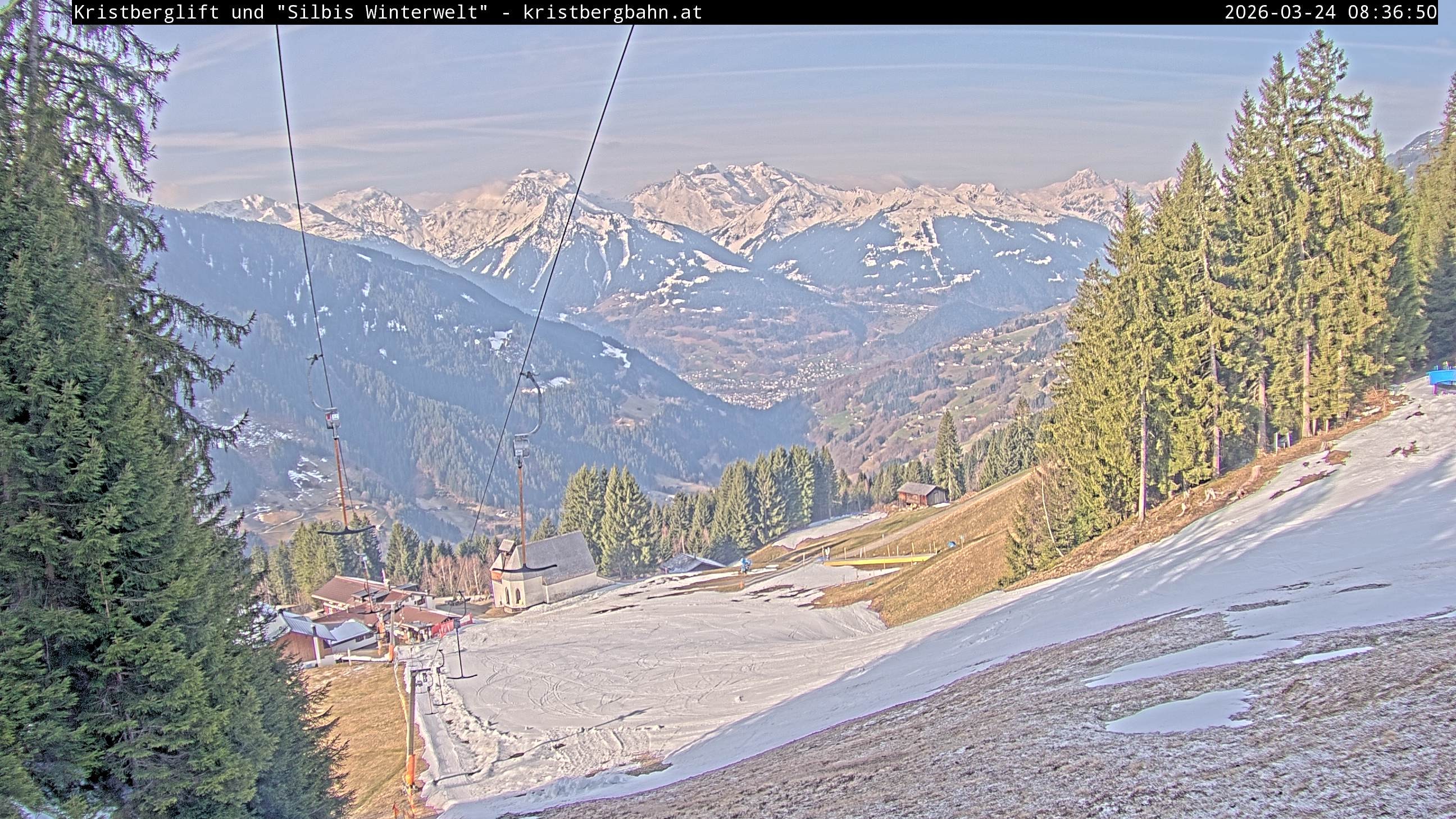 The webcam shows the view at Kristberglift and slope in ski resort Silbertal-Kristberg, Montafon. One also can spot the restaurant "Panoramagasthof Kristberg" and St. Agatha chapel, as well as Verwall-and Rätikon mountain chain.
