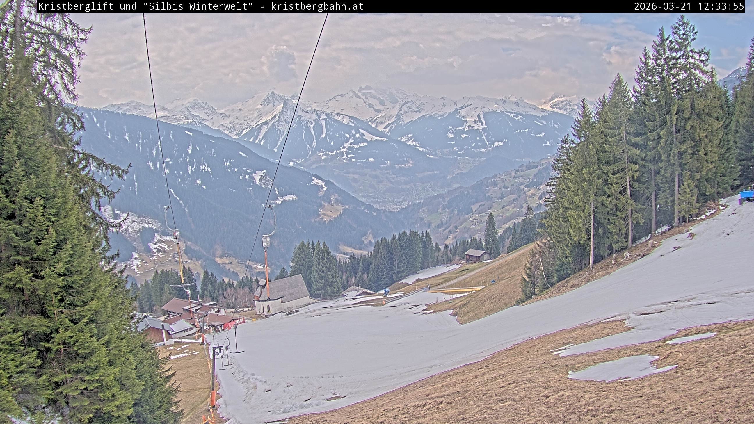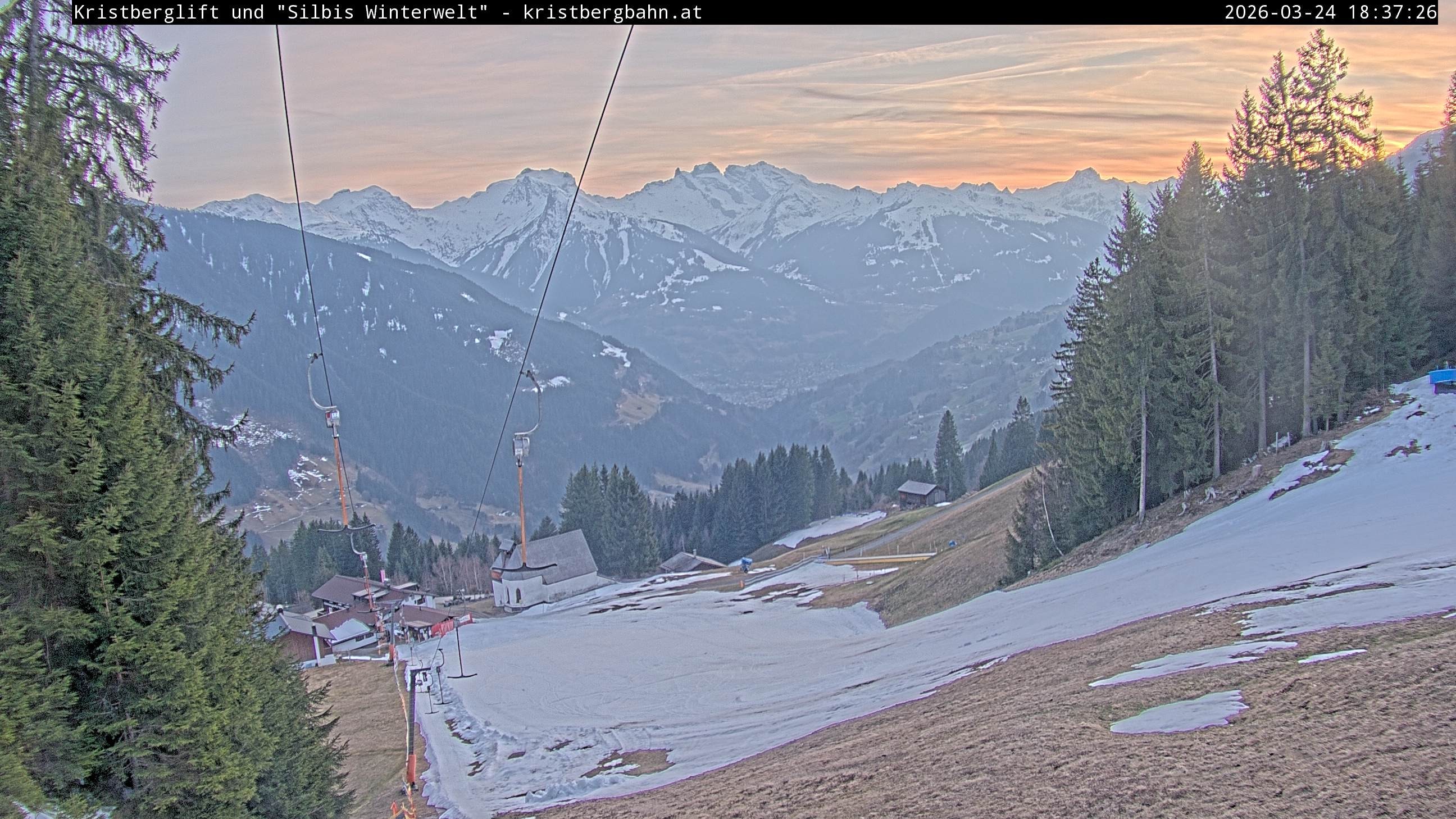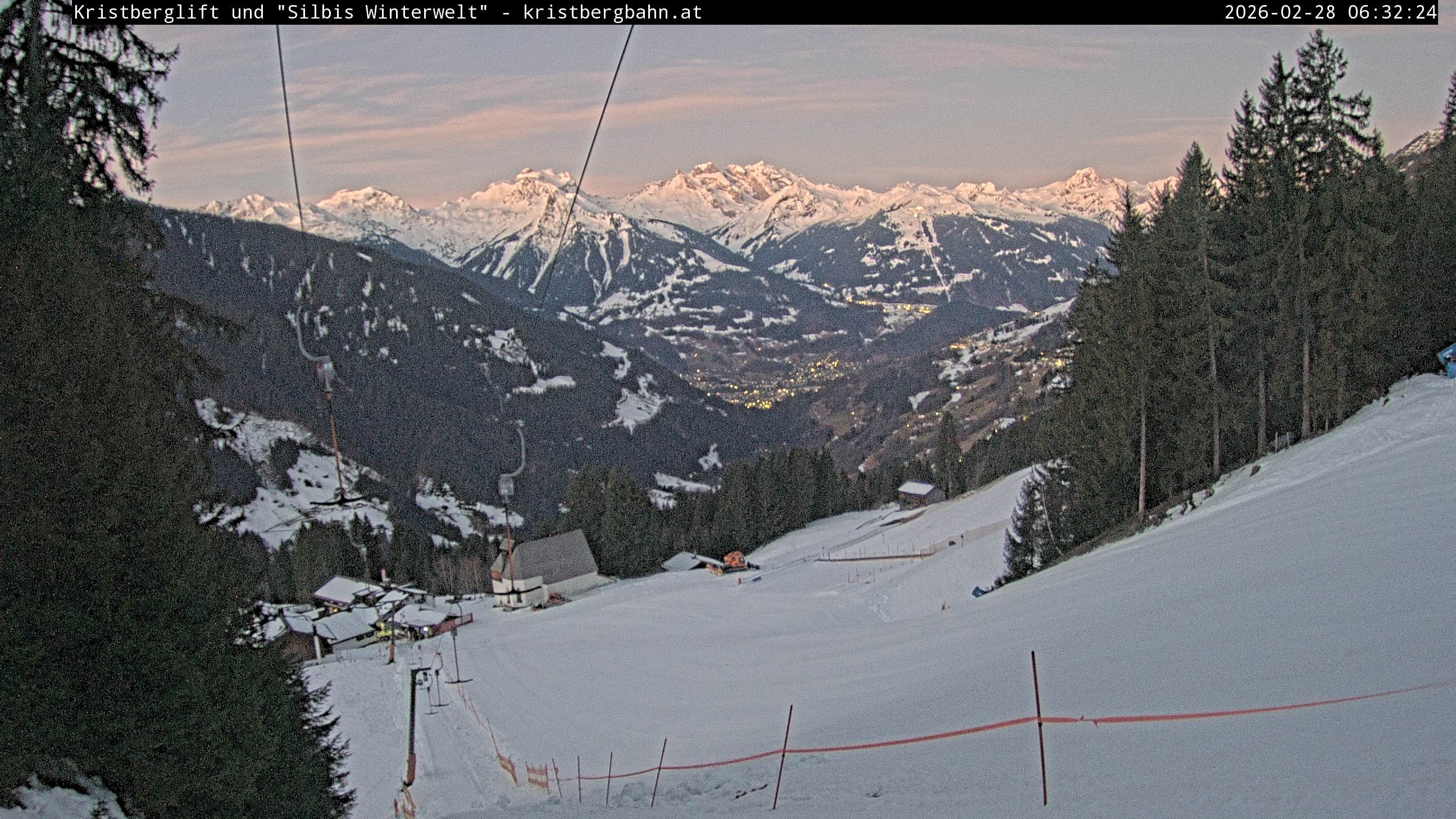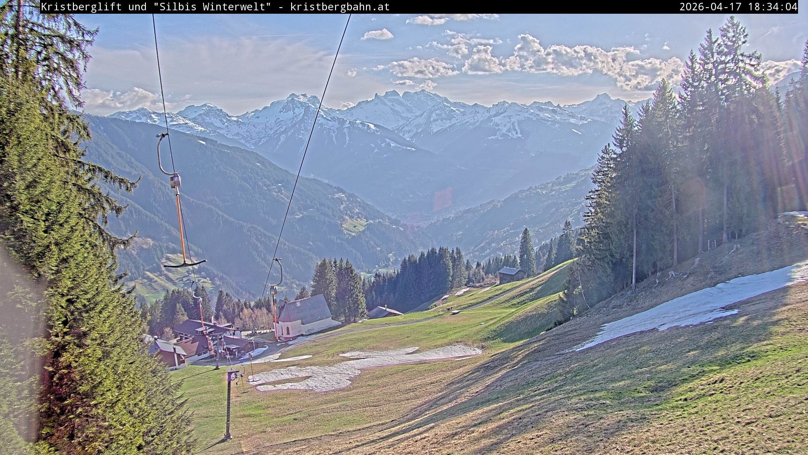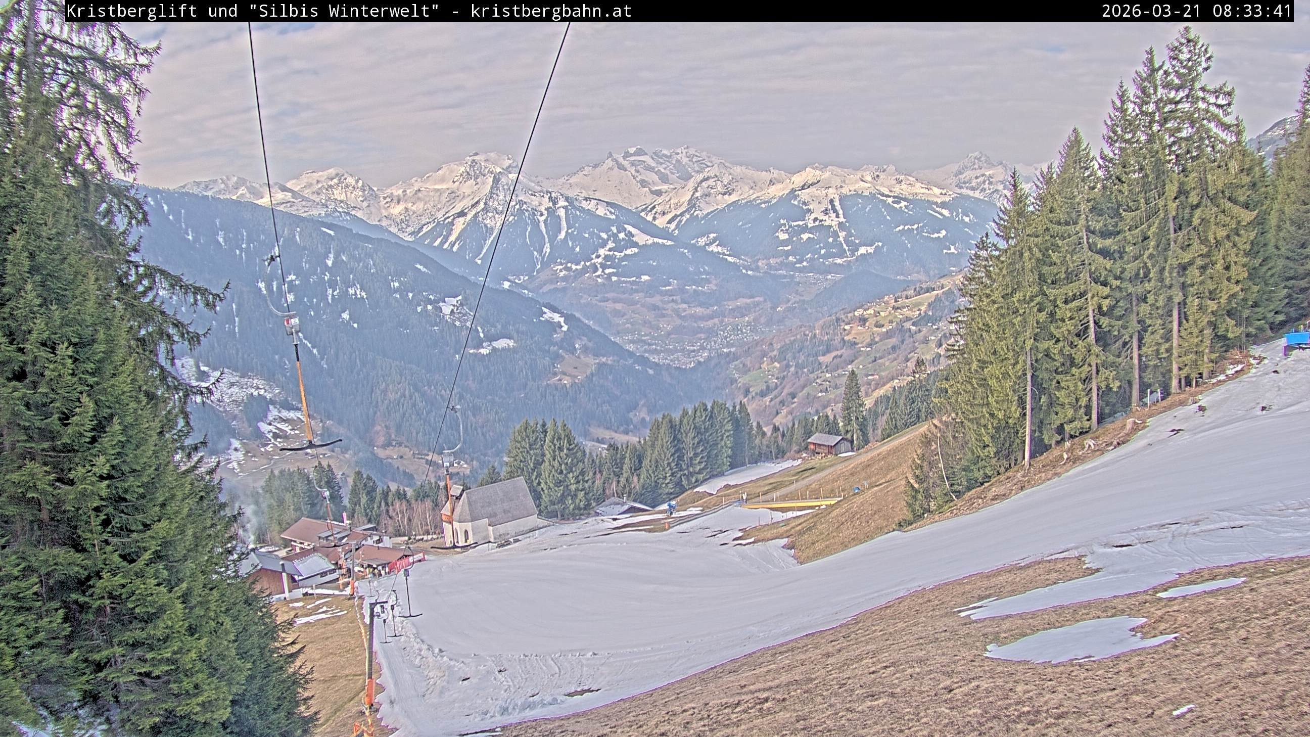 The webcam shows the view at Kristberglift and slope in ski resort Silbertal-Kristberg, Montafon. One also can spot the restaurant "Panoramagasthof Kristberg" and St. Agatha chapel, as well as Verwall-and Rätikon mountain chain.