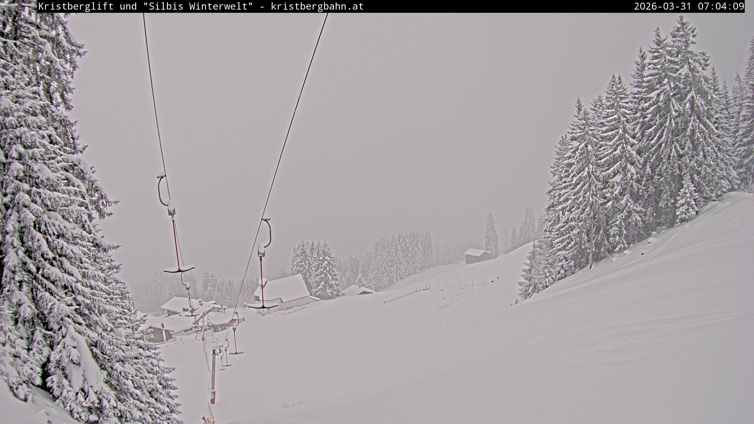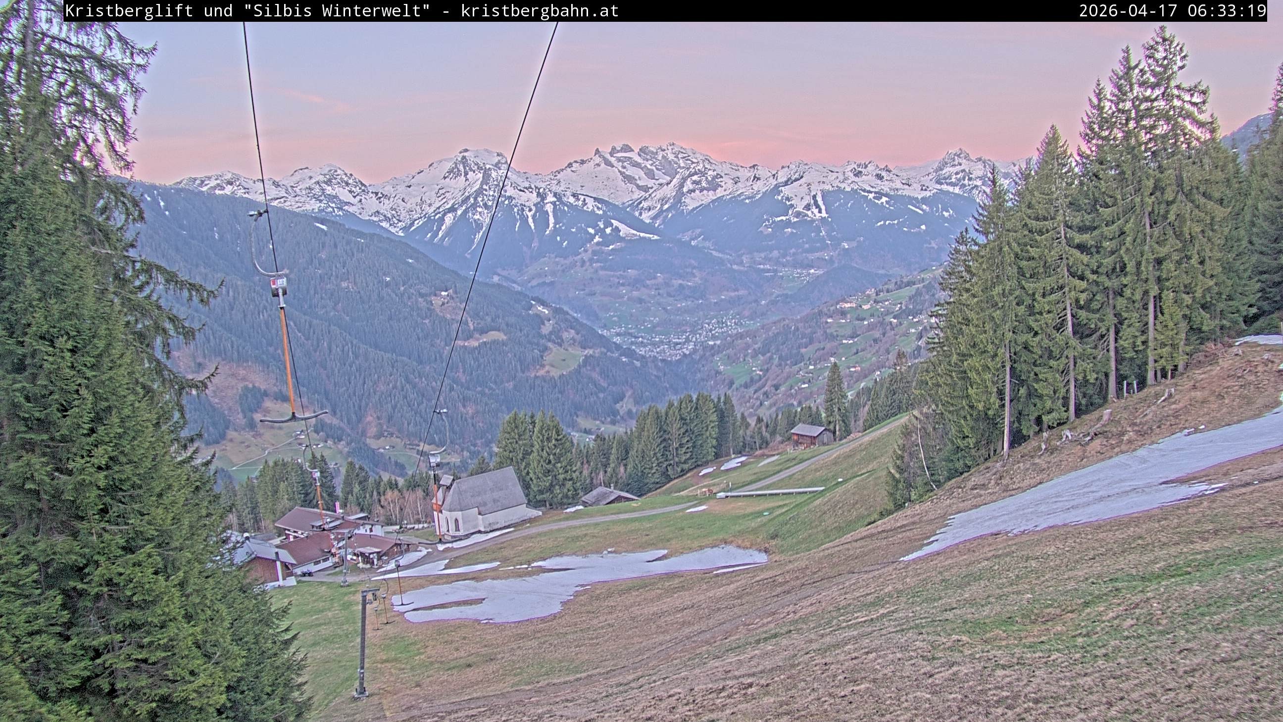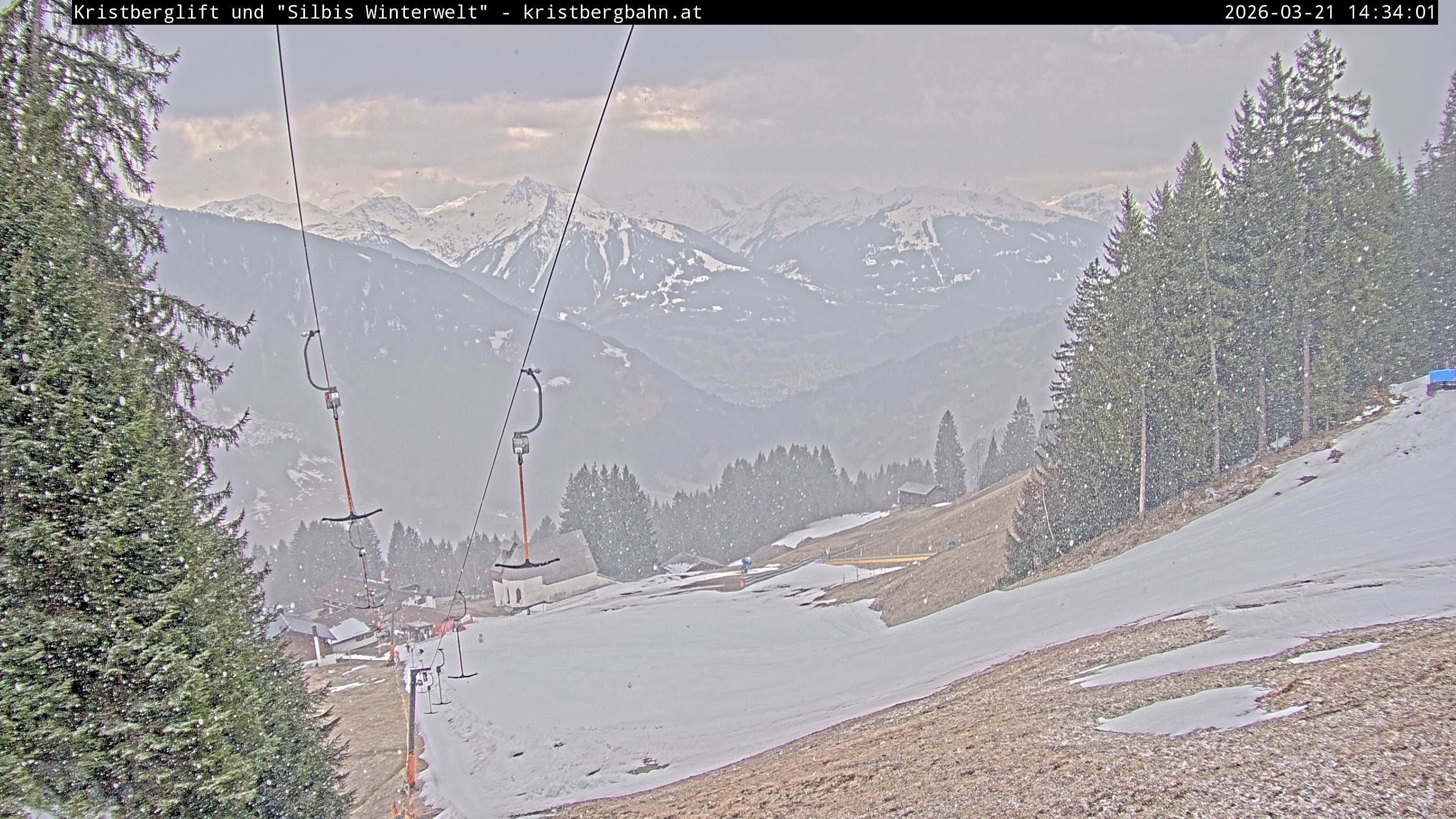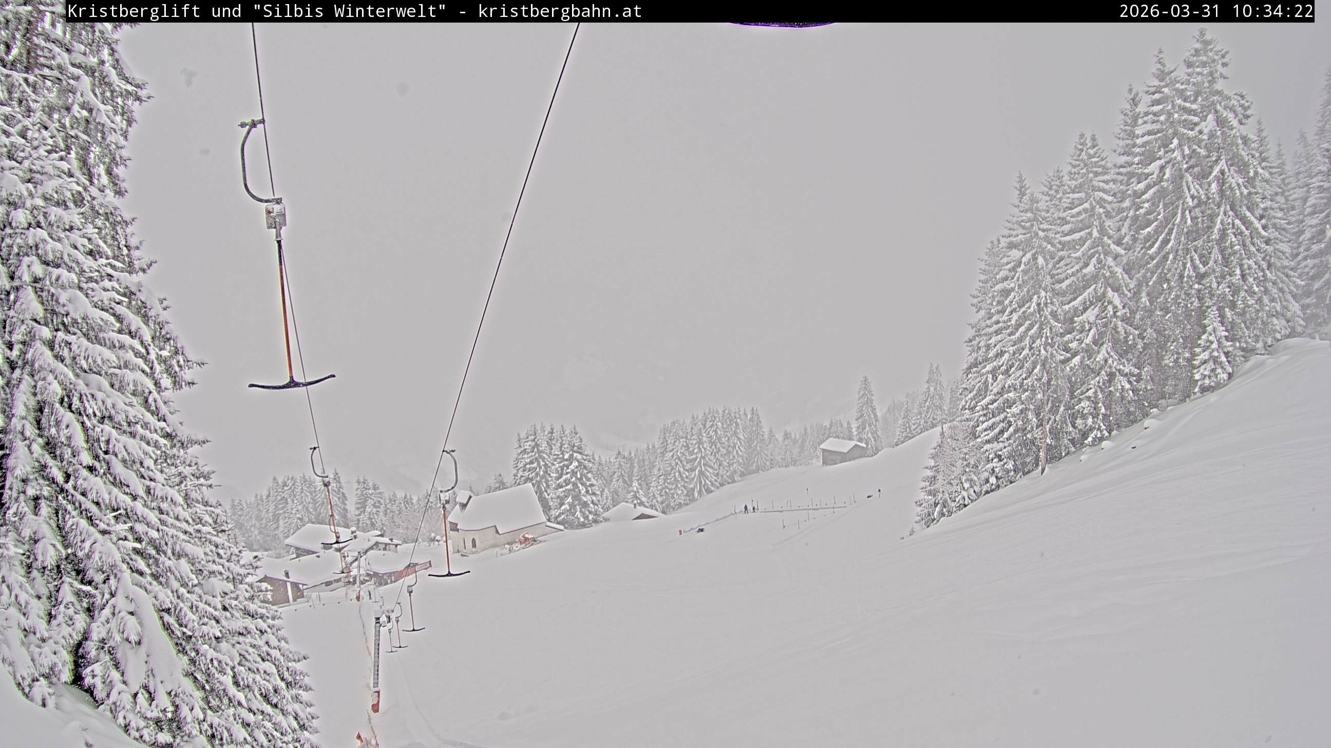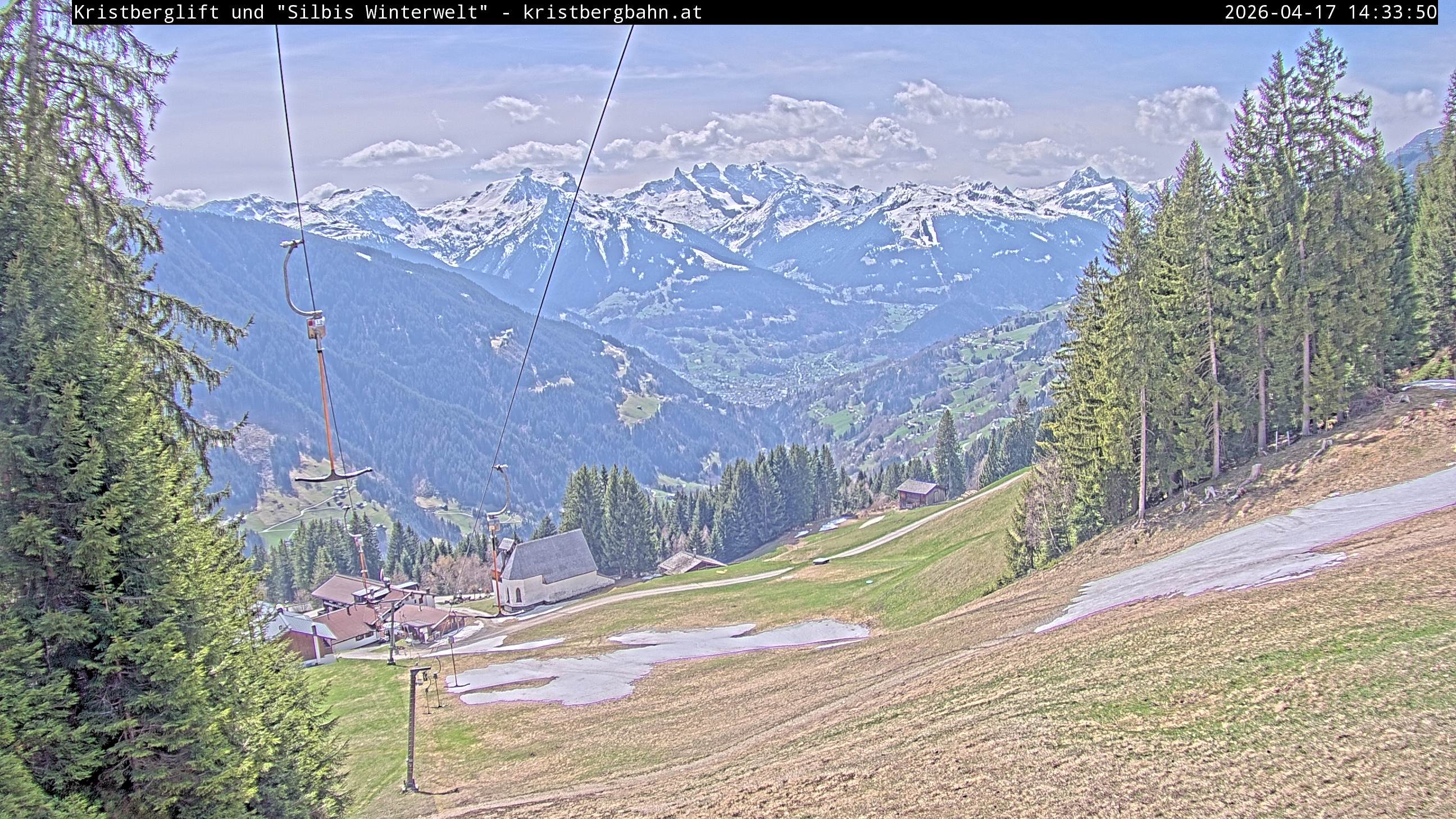 The webcam shows the view at Kristberglift and slope in ski resort Silbertal-Kristberg, Montafon. One also can spot the restaurant "Panoramagasthof Kristberg" and St. Agatha chapel, as well as Verwall-and Rätikon mountain chain.
