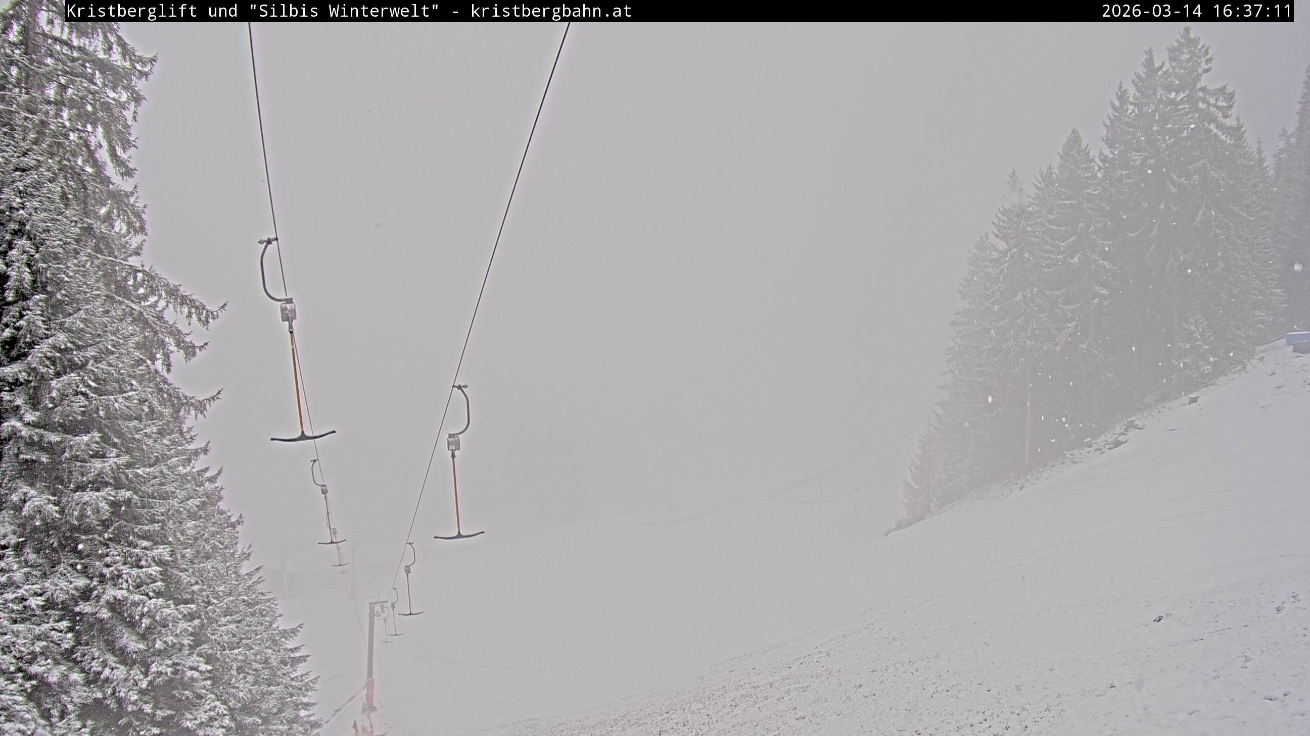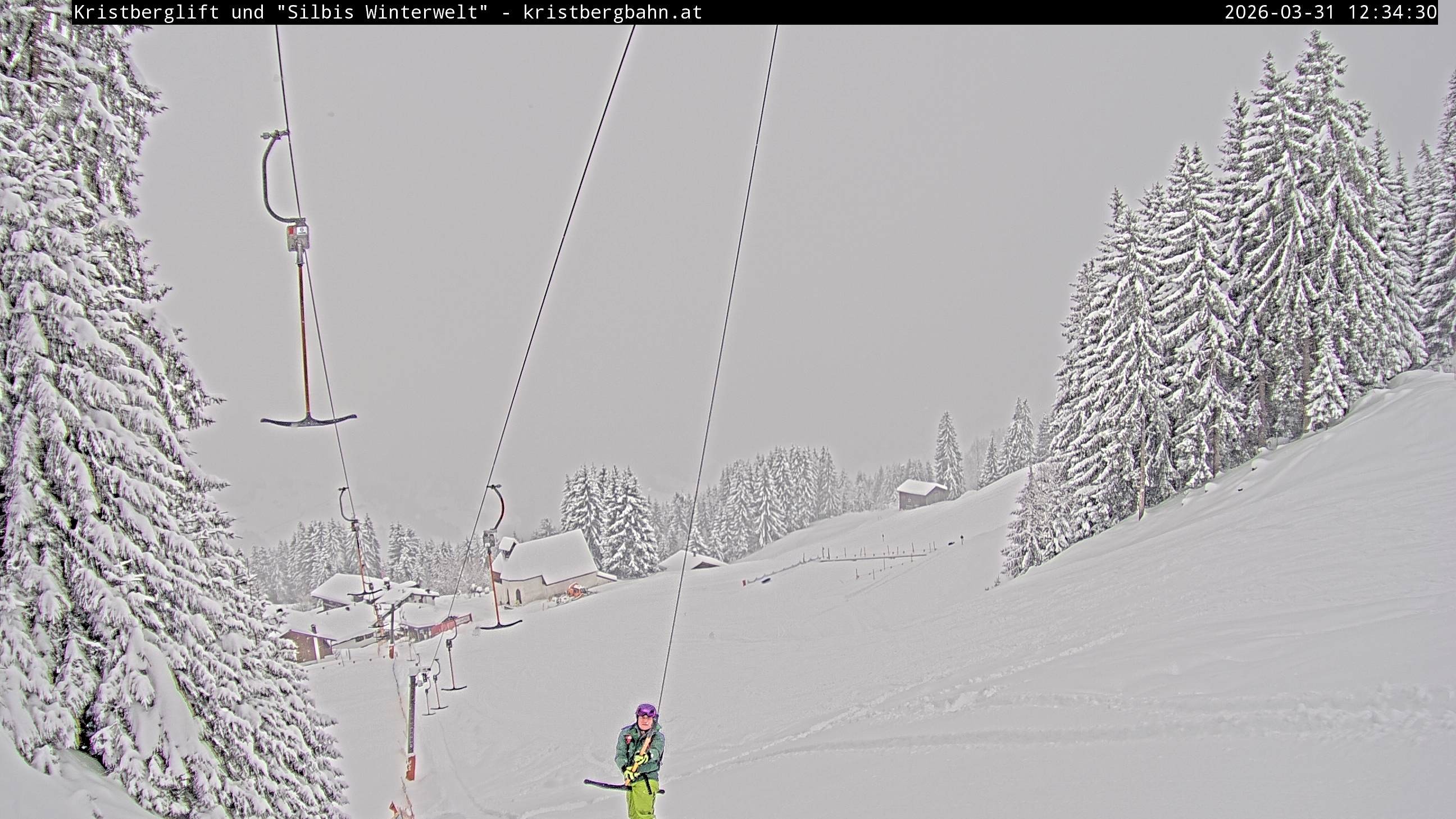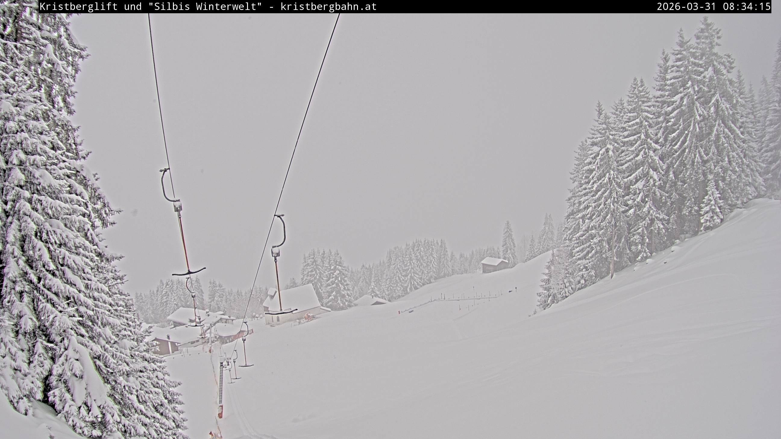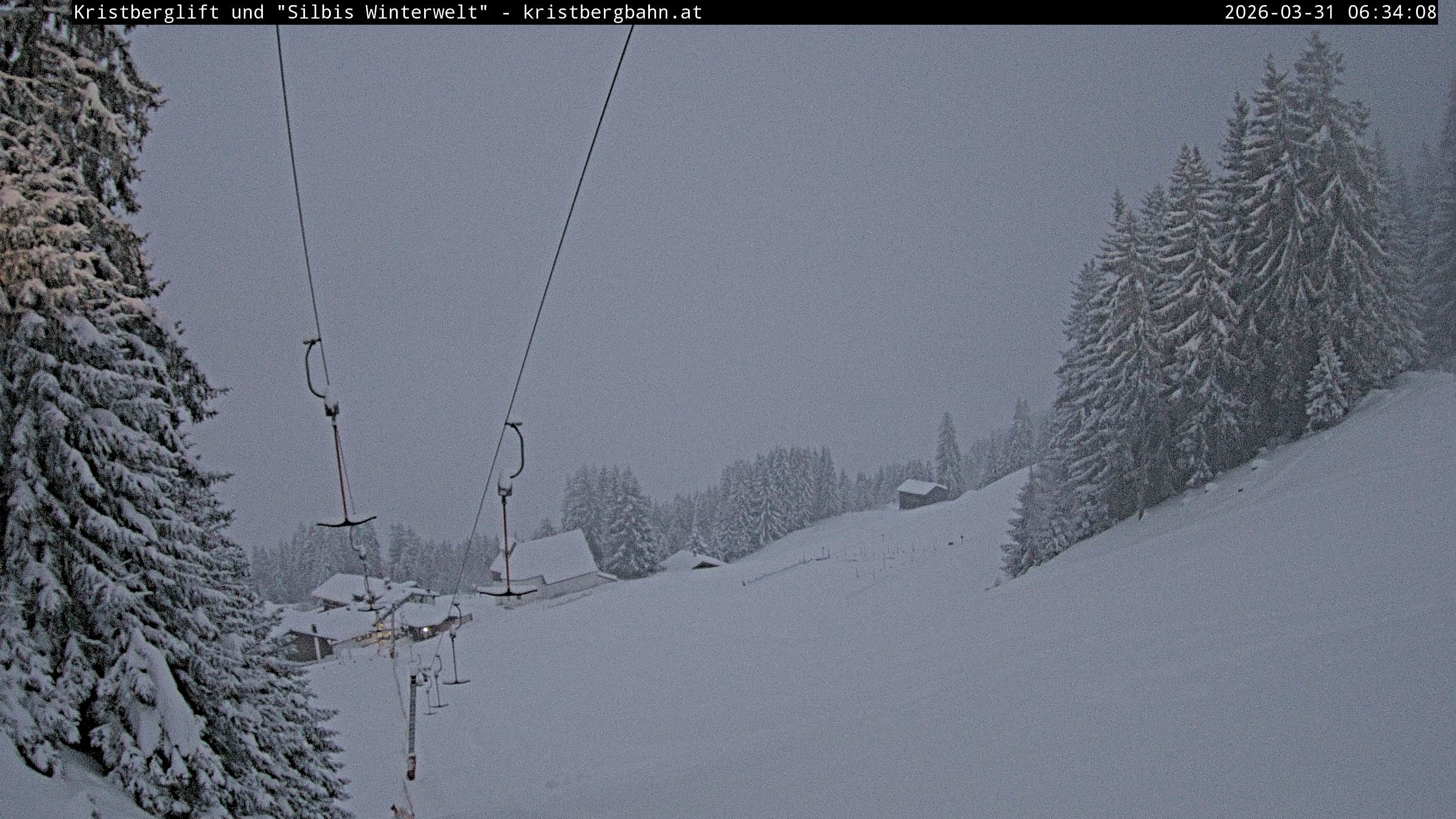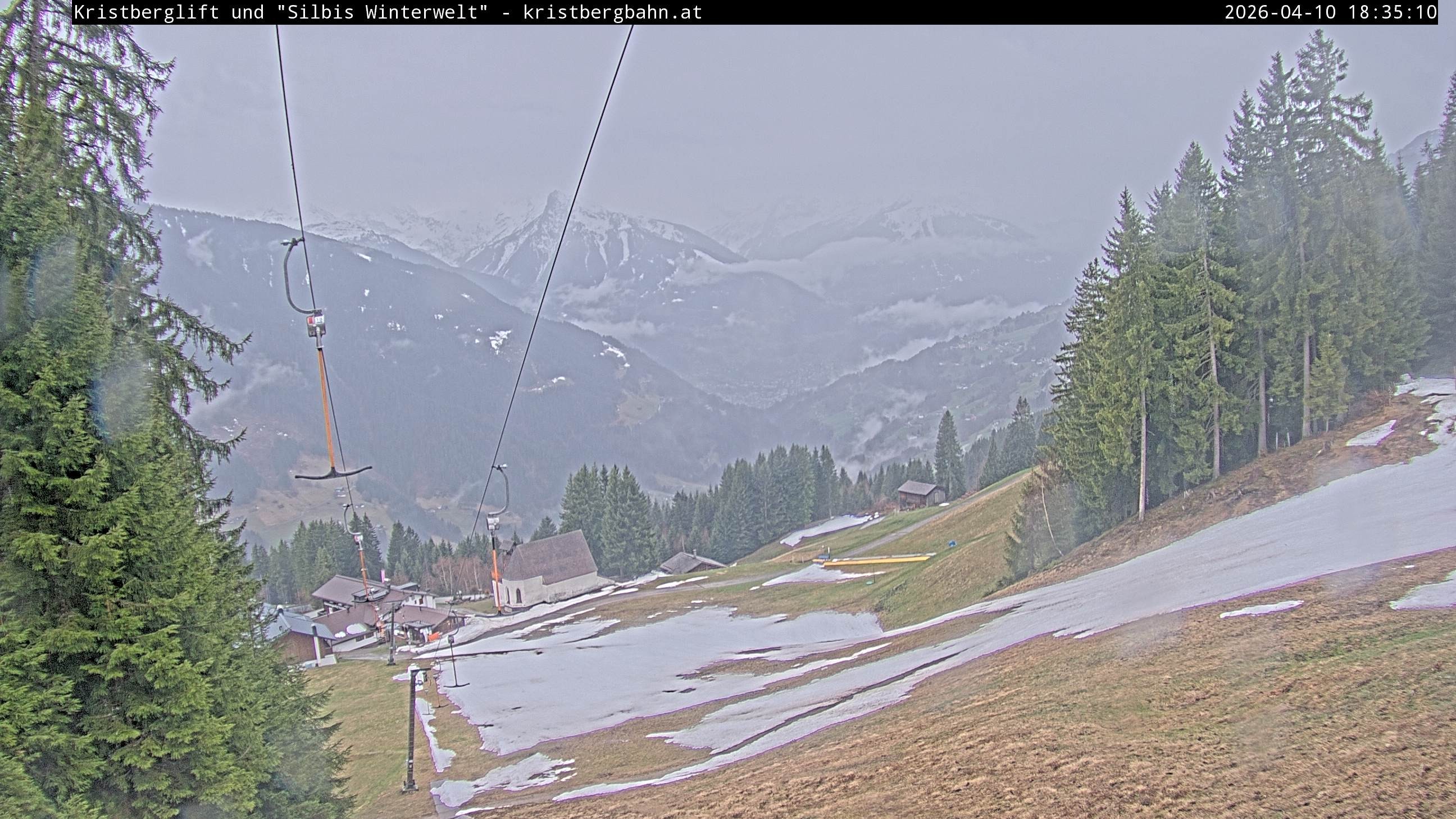 The webcam shows the view at Kristberglift and slope in ski resort Silbertal-Kristberg, Montafon. One also can spot the restaurant "Panoramagasthof Kristberg" and St. Agatha chapel, as well as Verwall-and Rätikon mountain chain.