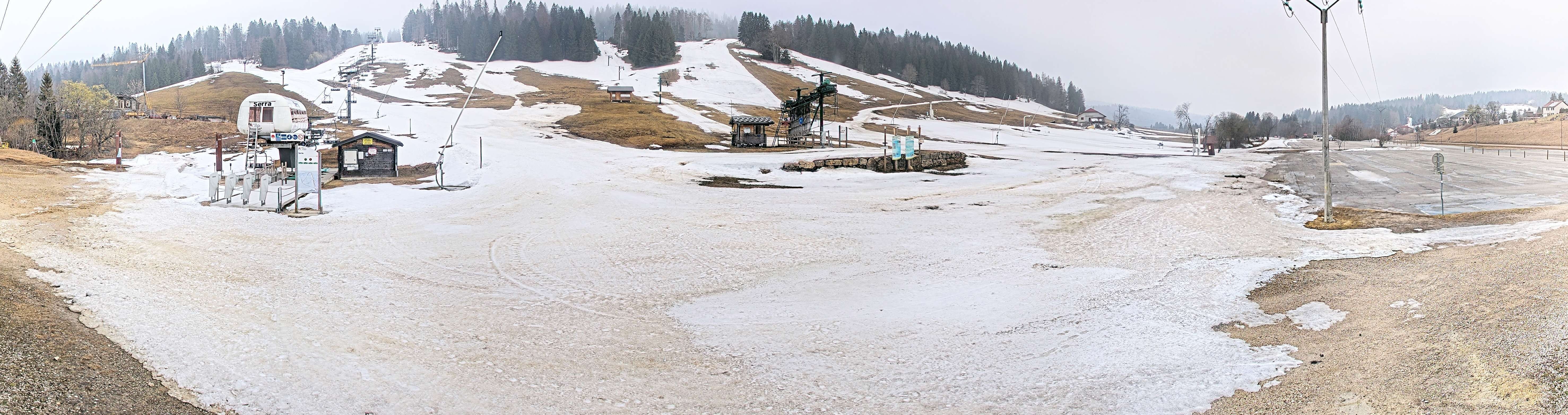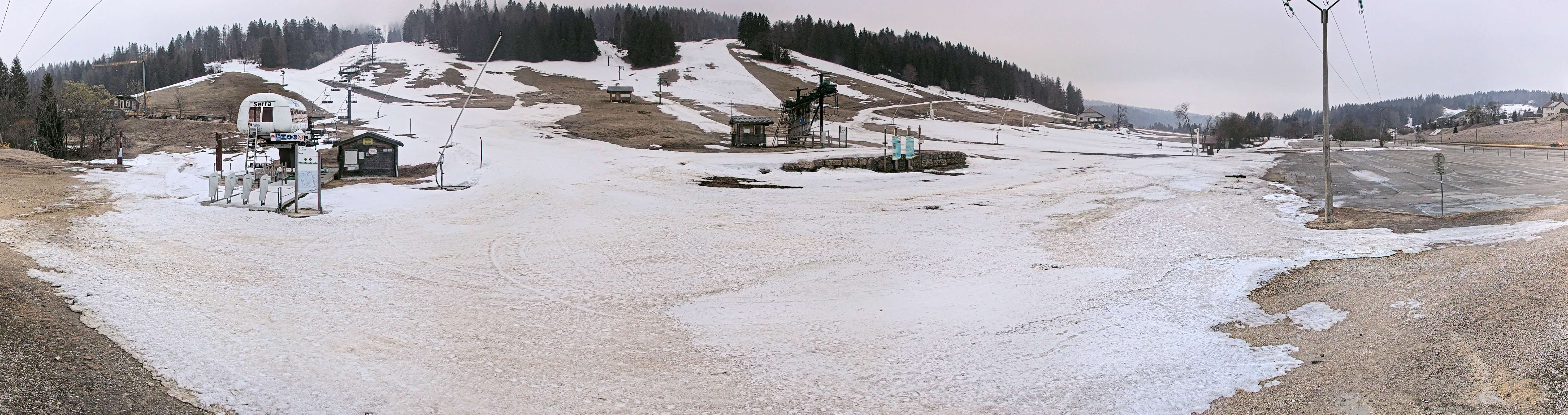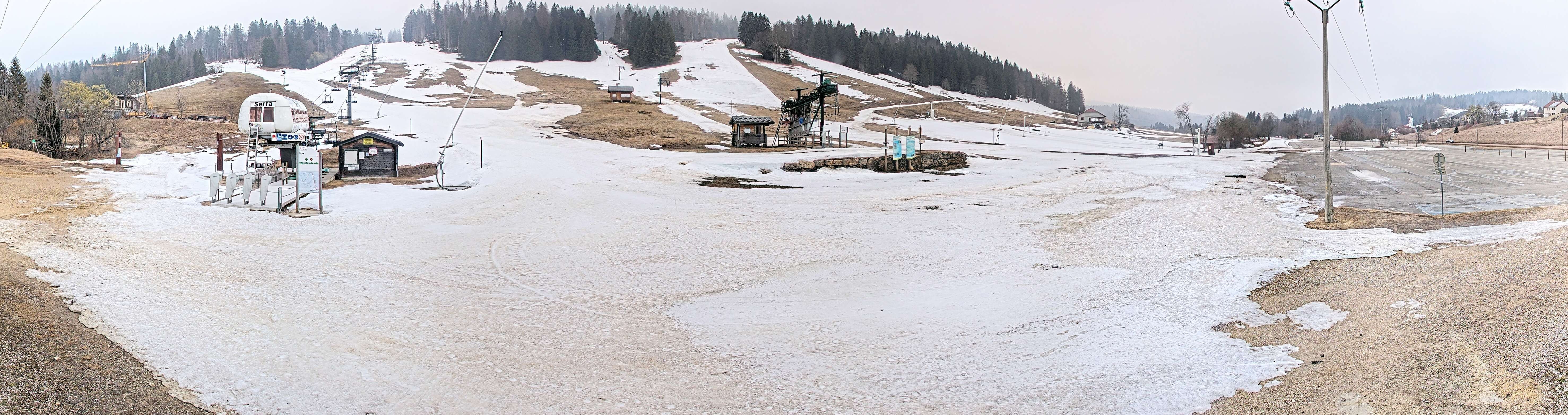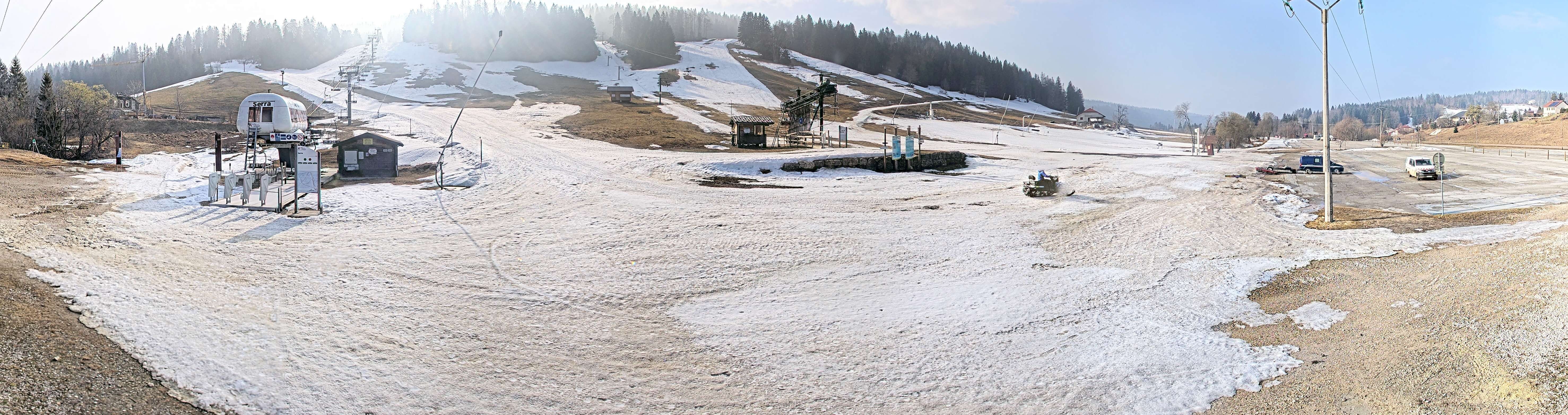 The webcam shows base station of lifts at Massif de la Serra in french region of Jura, Franche-Comté.