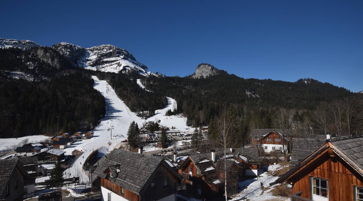 The camera looks from the Hagan Lodge near Altaussee to the 6-seater chairlift Sandling-Jet and the kids' area in the Loser ski resort.