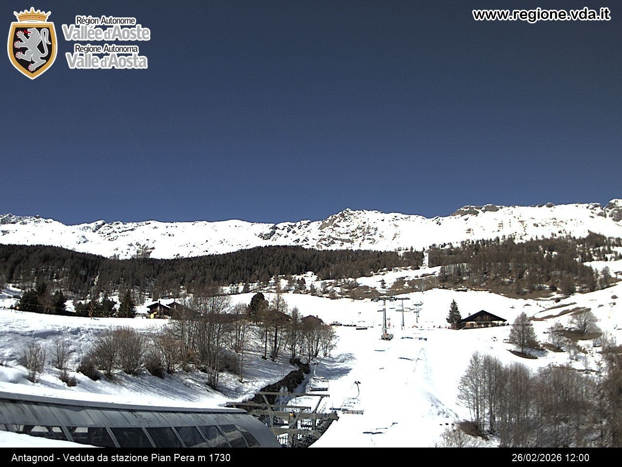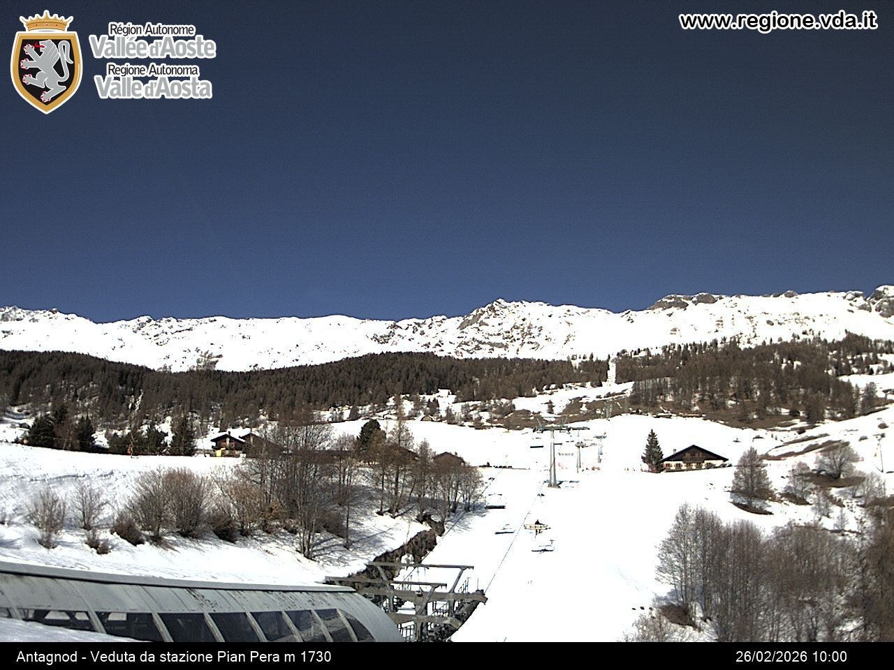 The webcam is located at the base station of the Pian Pera chair lift at Antagnod in the ski area Monterosa Ski.