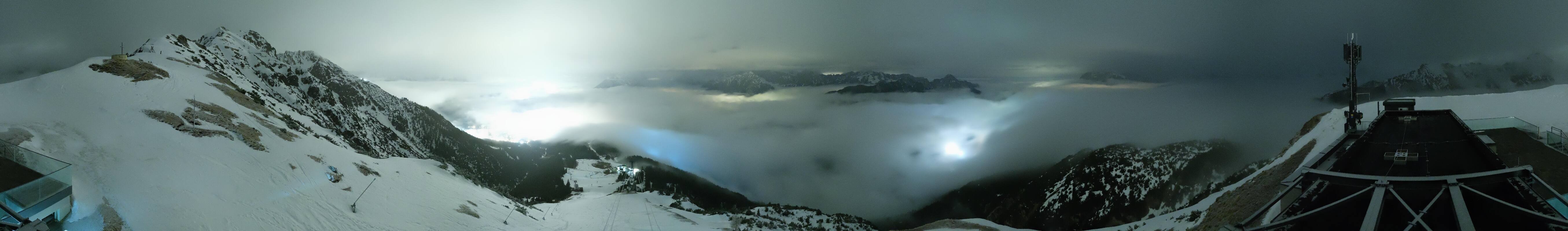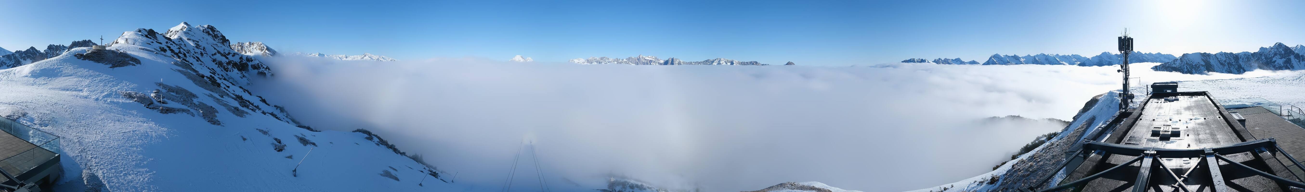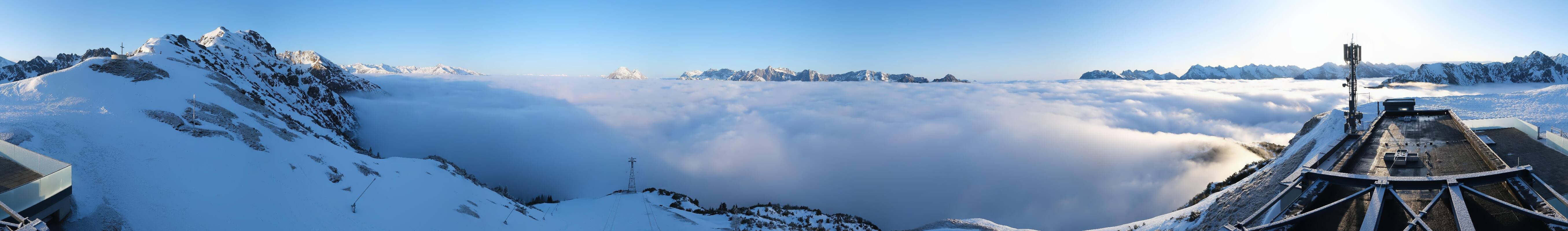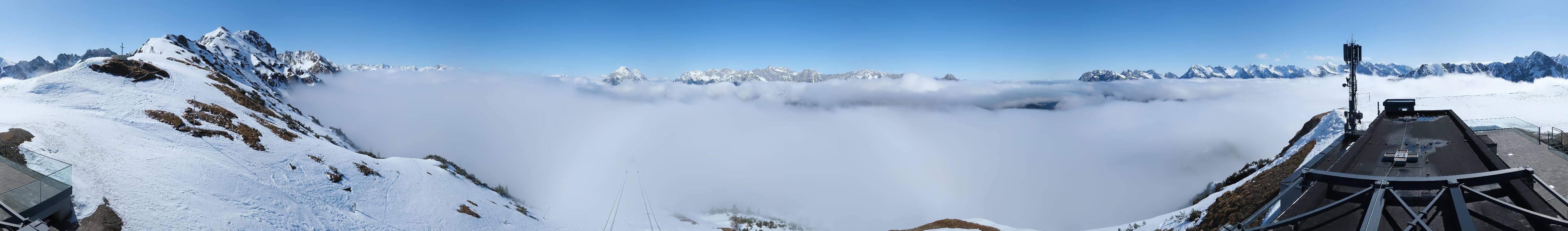 Enjoy the panoramic view from the top station at Seefelder Joch in the Rosshütte ski area down into the valley to Seefeld in Tyrol. In addition to the Seefelder Jochbahn, you can also see the Jochlift and the Rosshütten-Express chairlift.