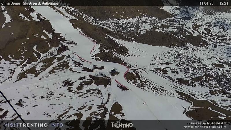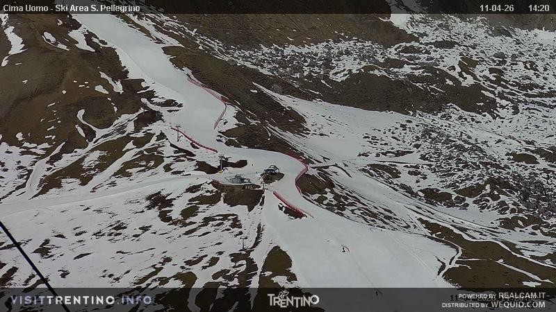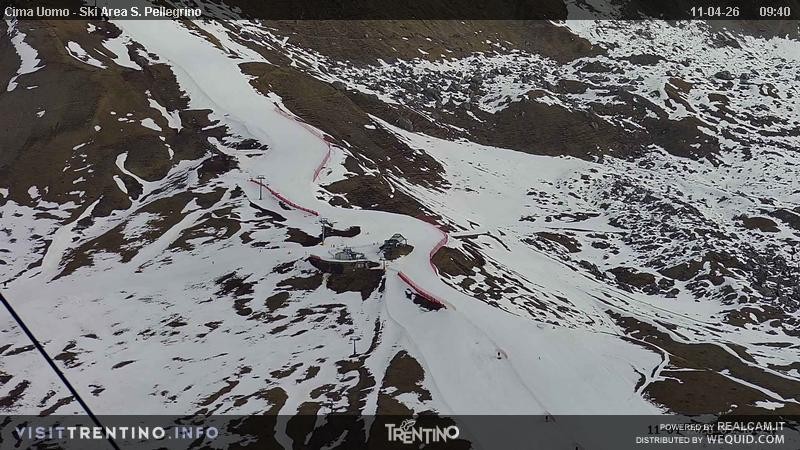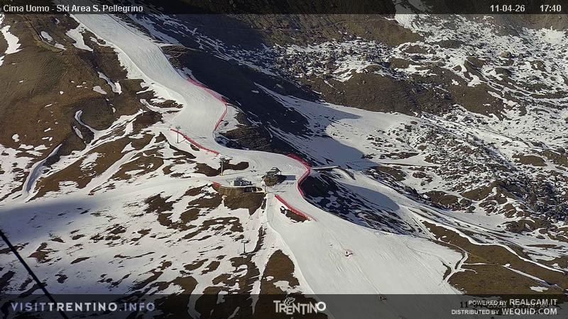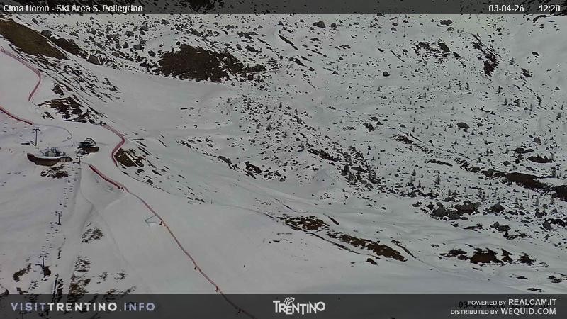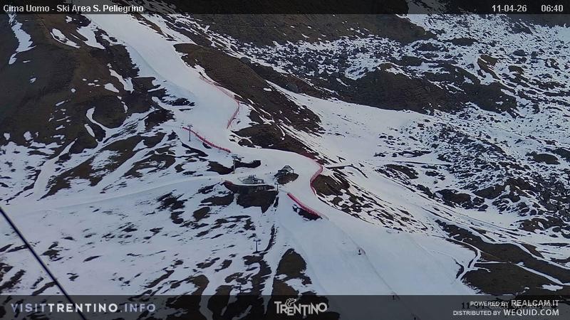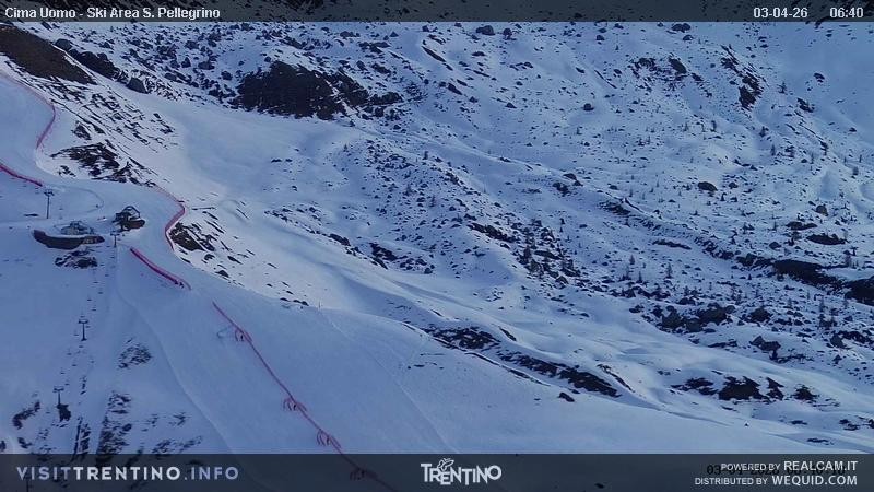 View from Col Margherita towards slopes and lifts of San Pellegrino Pass in italian Valley Fassa. From the pass, one can spot the peaks of Costabella an Cima Uomo.