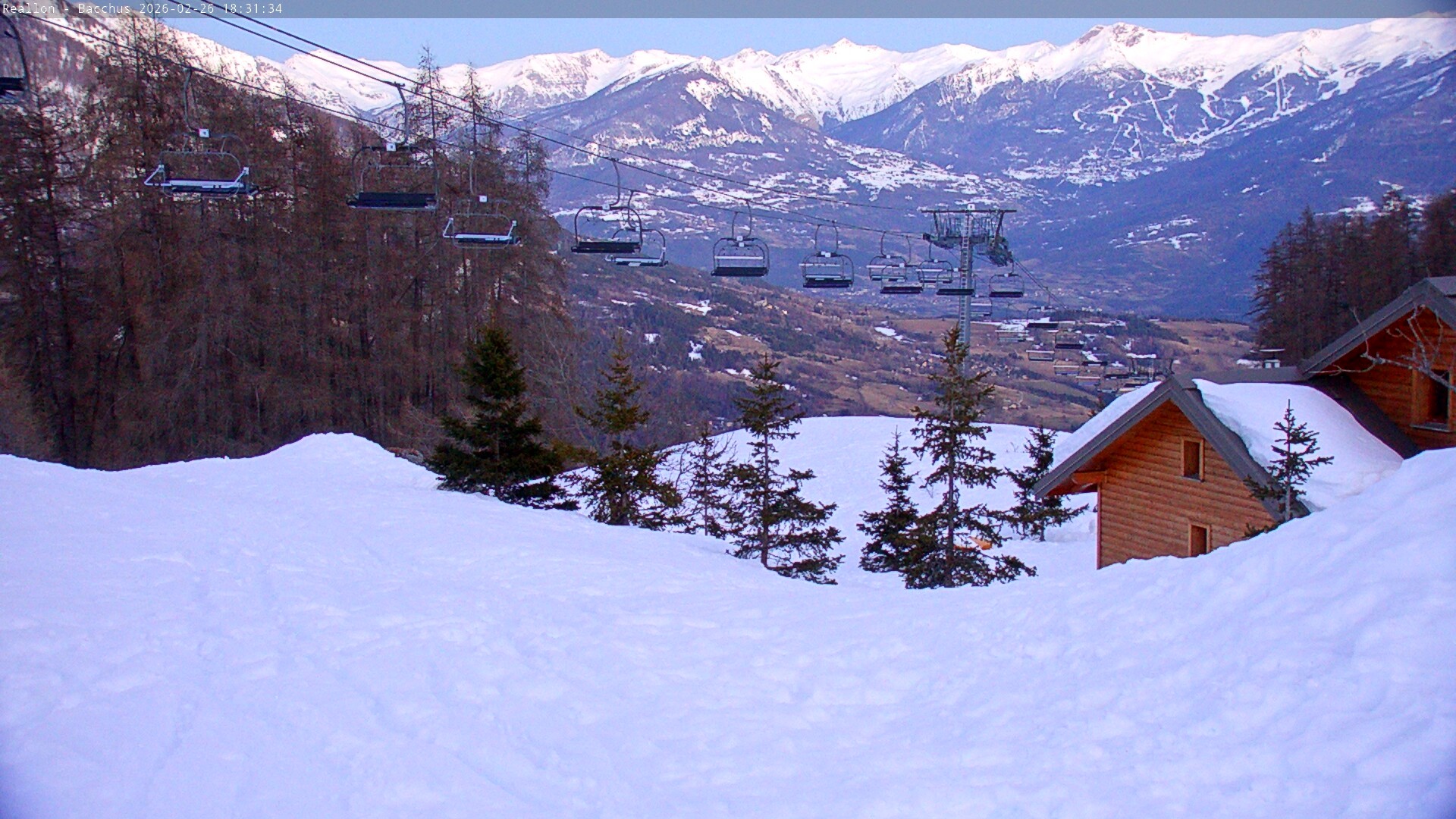 Archived webcam image showing Mountain station of the Chabrières chair lift on 26 Feb 2026 at 18:16 Latest
