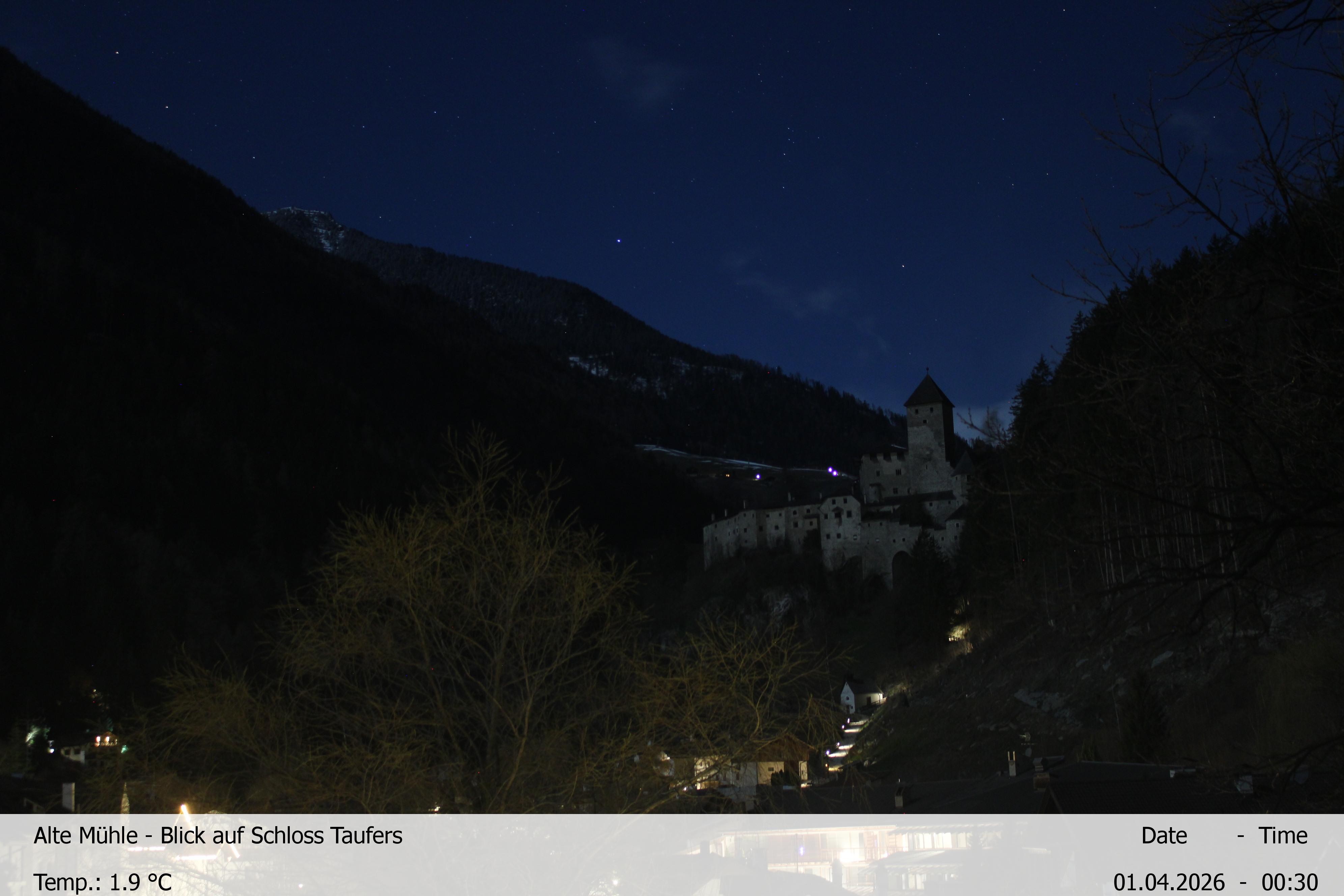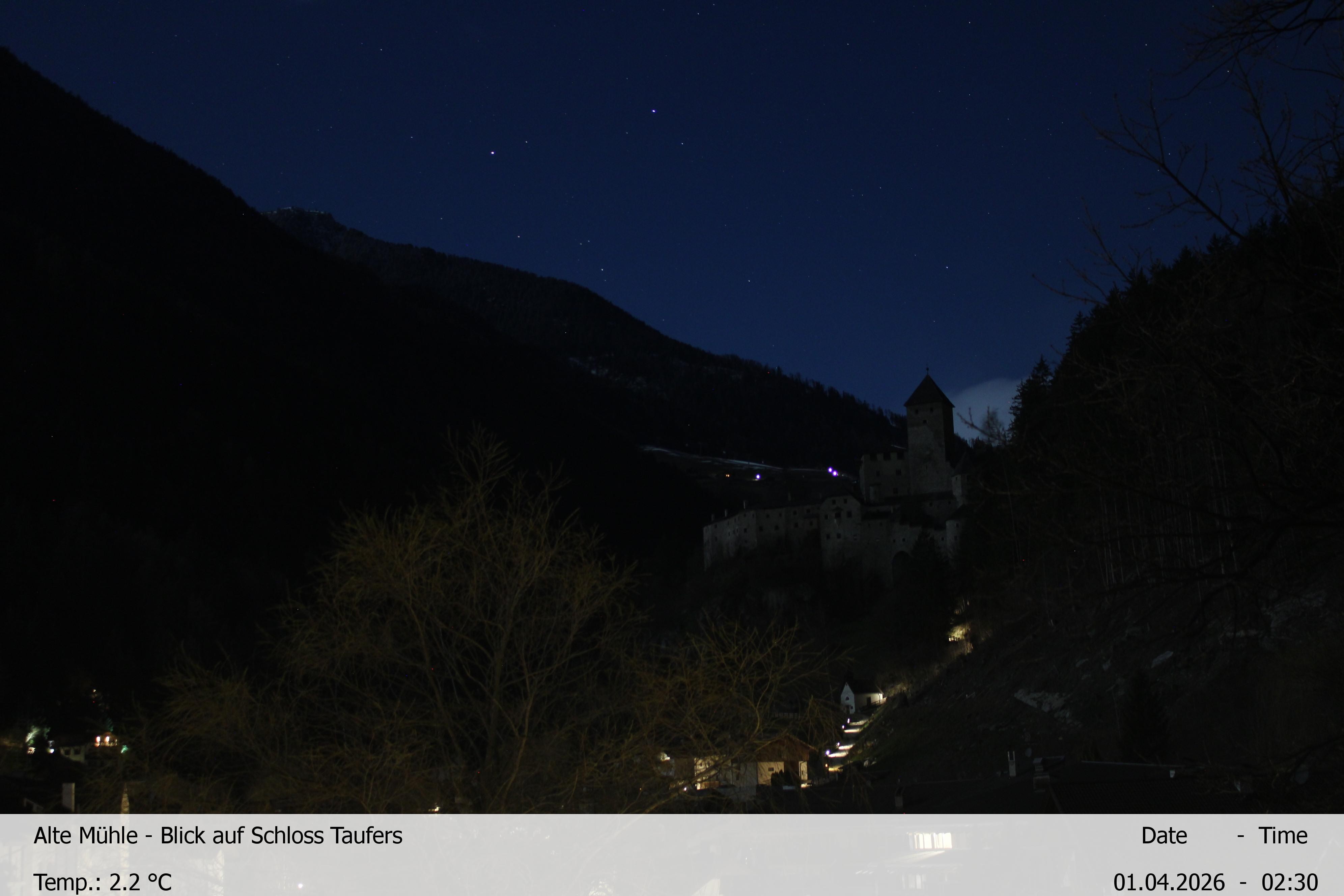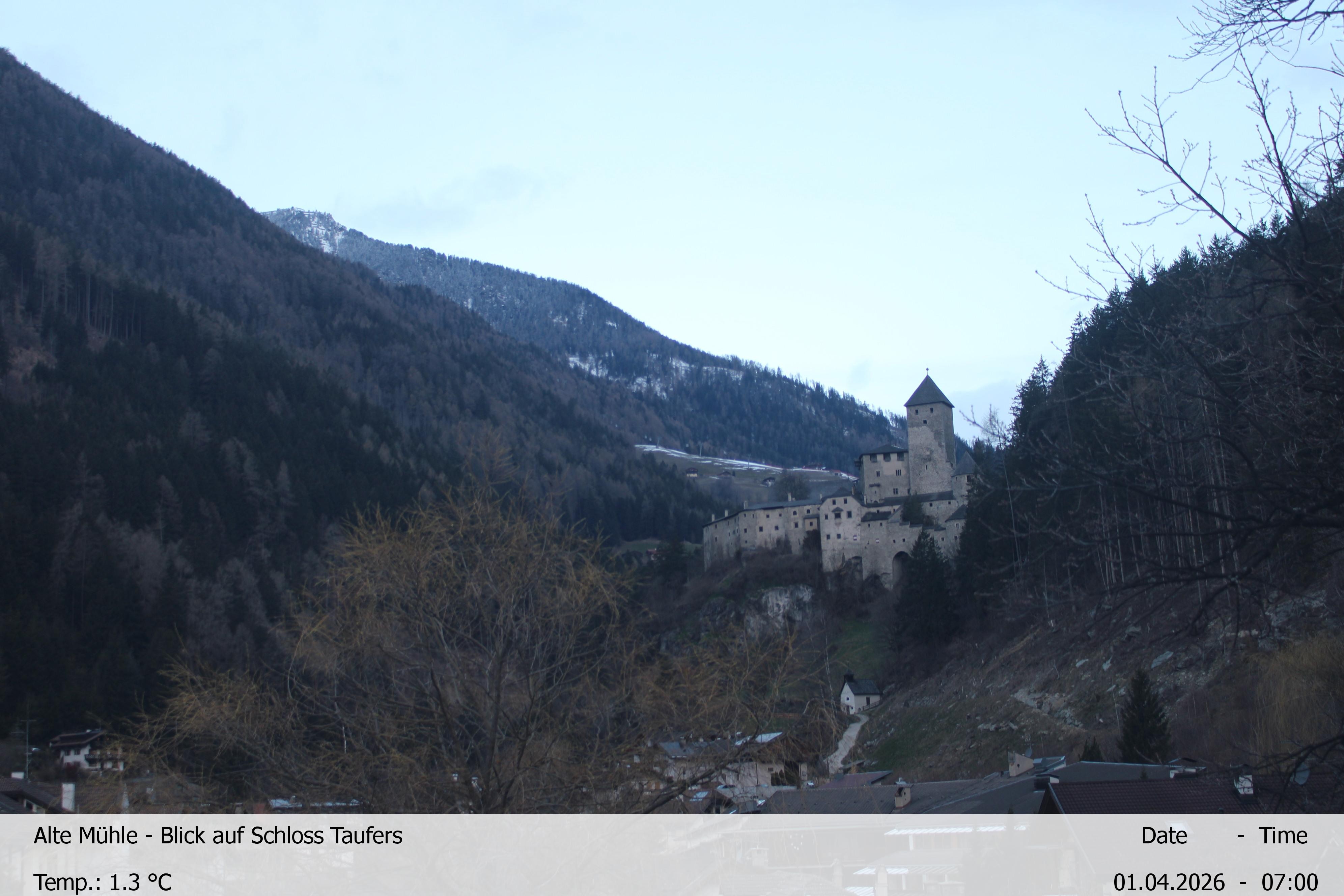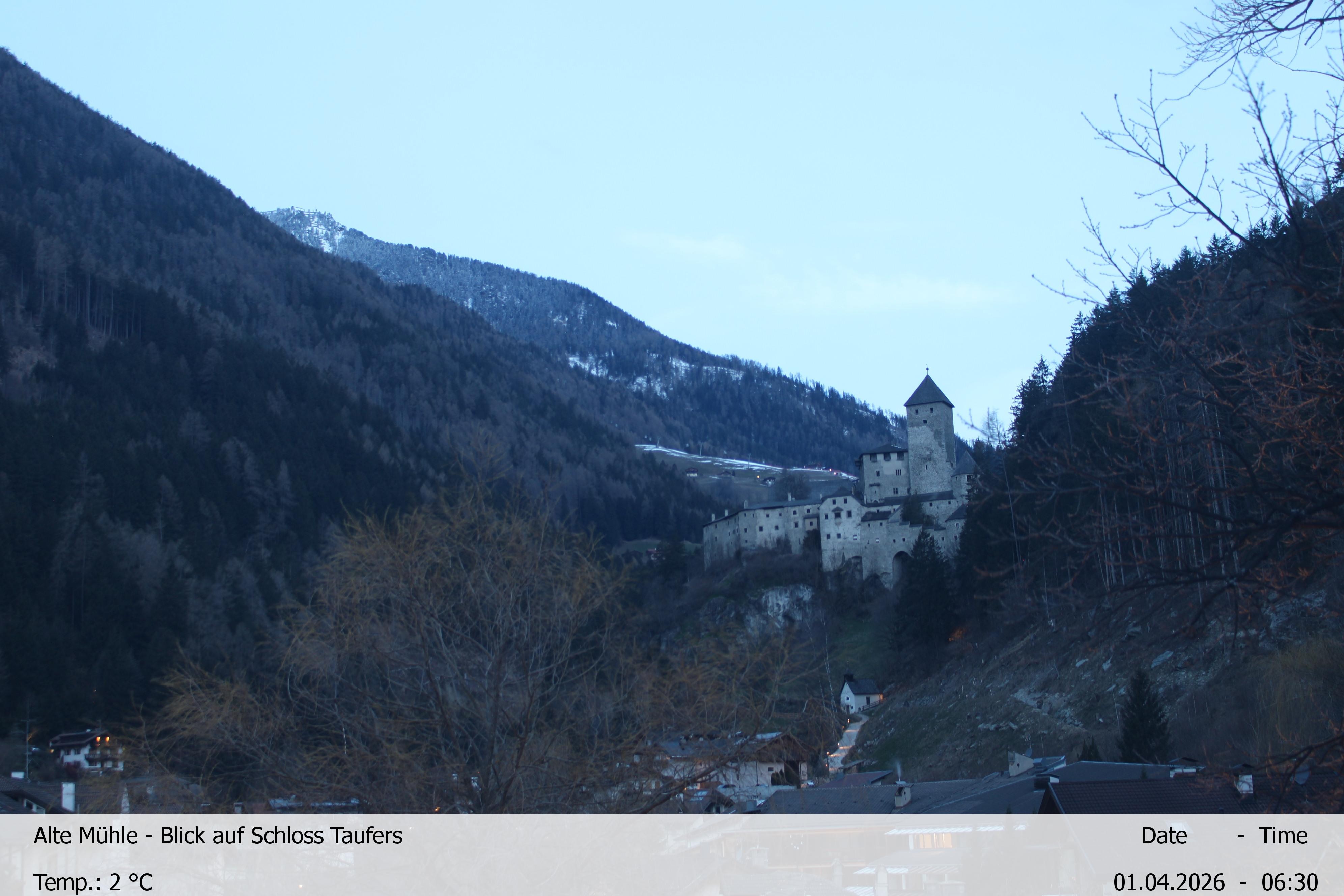 Archived webcam image showing View towards castle Taufers in South Tyrol on 1 Apr 2026 at 02:00 01:00