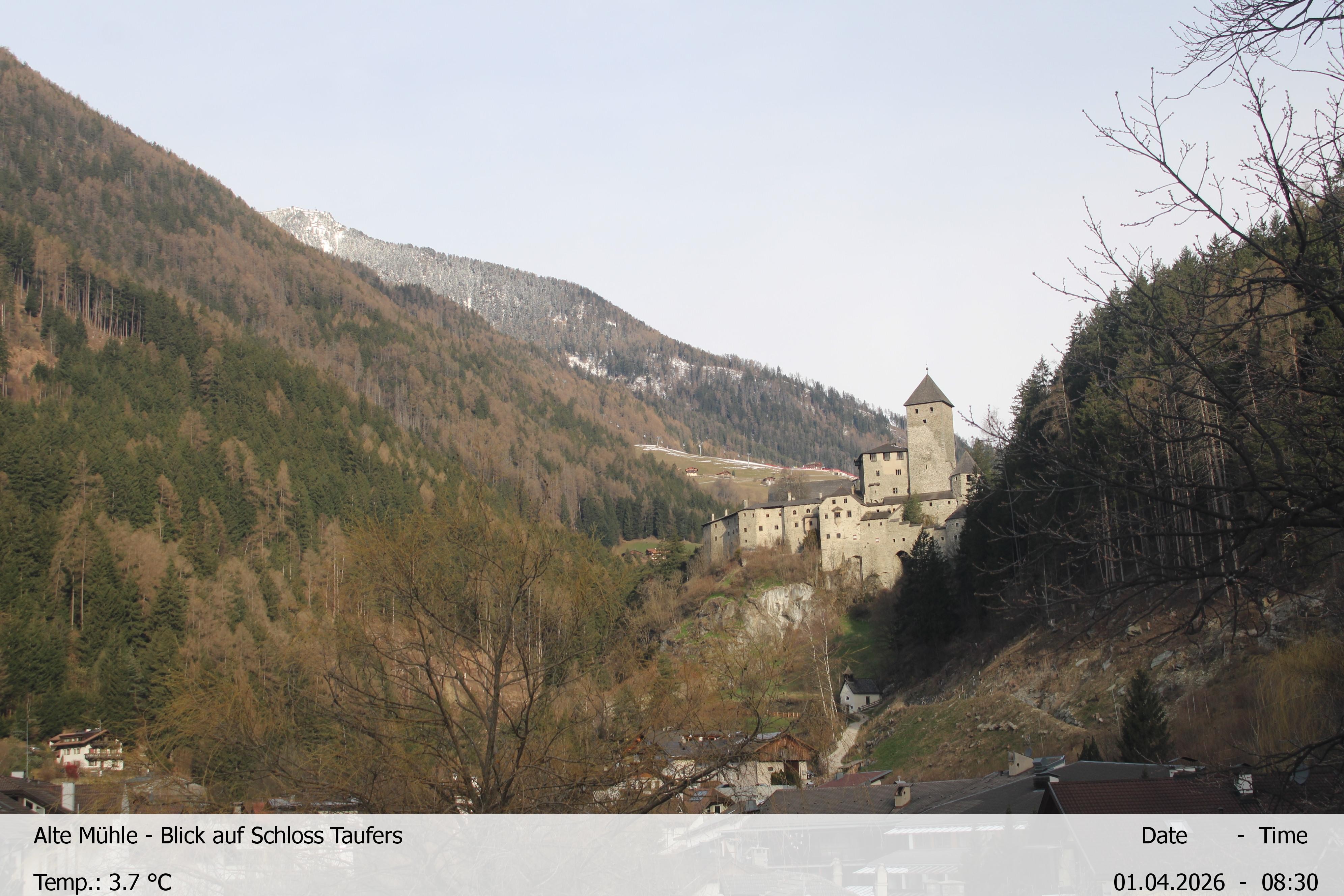 Archived webcam image showing View towards castle Taufers in South Tyrol on 1 Apr 2026 at 08:00 07:00