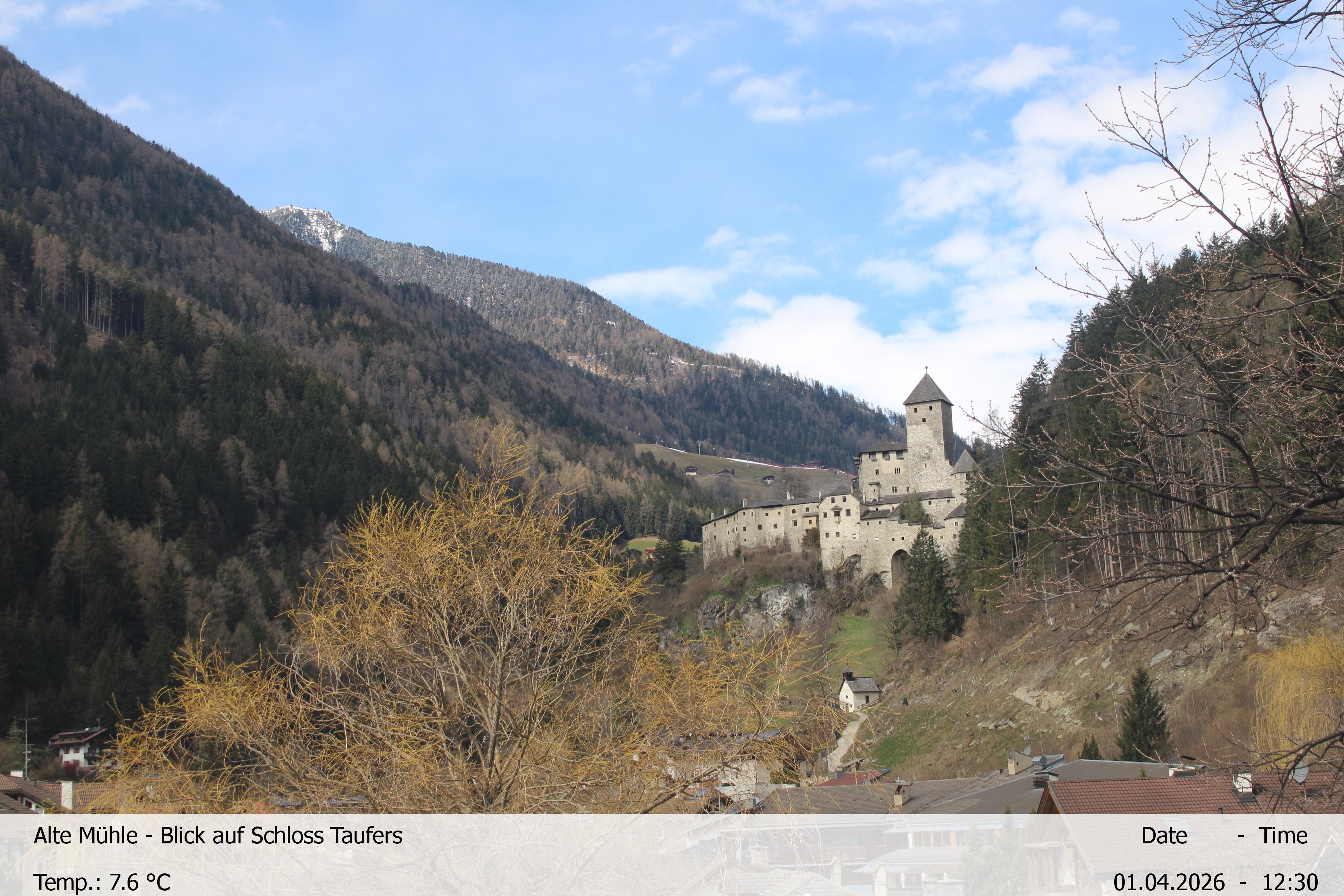 Archived webcam image showing View towards castle Taufers in South Tyrol on 1 Apr 2026 at 12:00 Latest