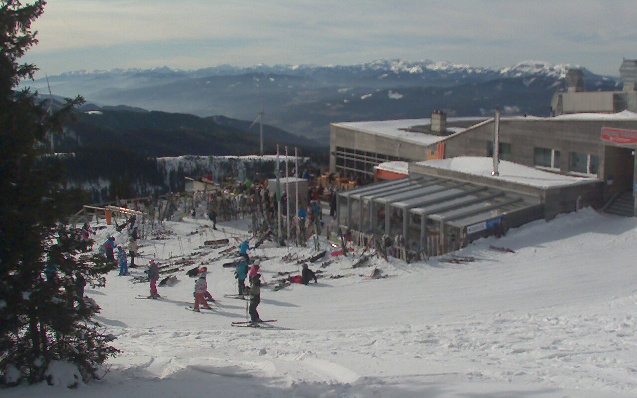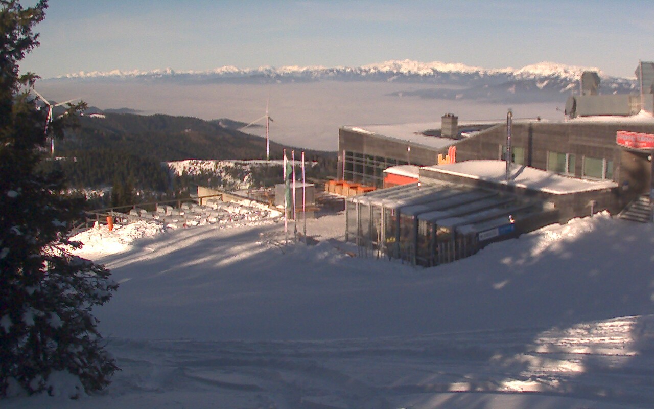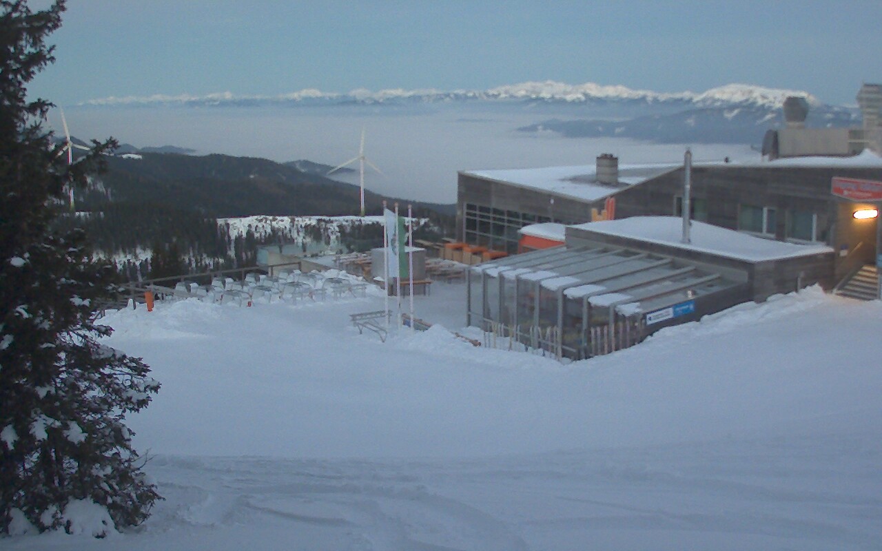 Outlook at the panoramic restaurant W11 at the top station of the lift Weißenelfbahn