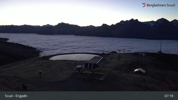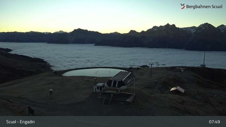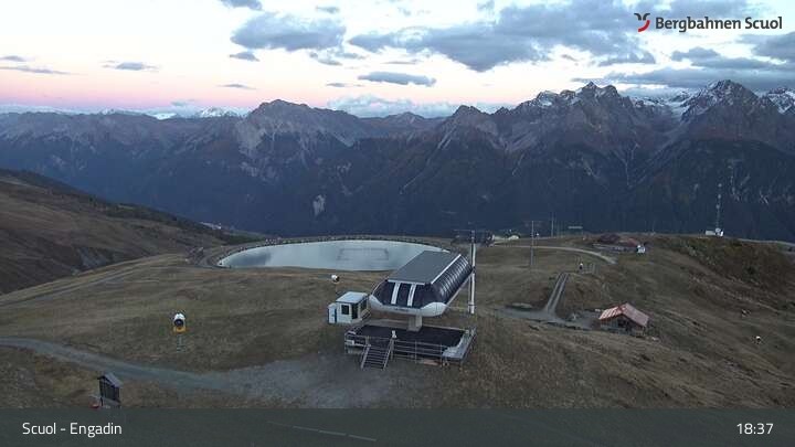 View from mountain "Schlivera" towards the top station of the chair lift Naluns in the ski area Scuol.