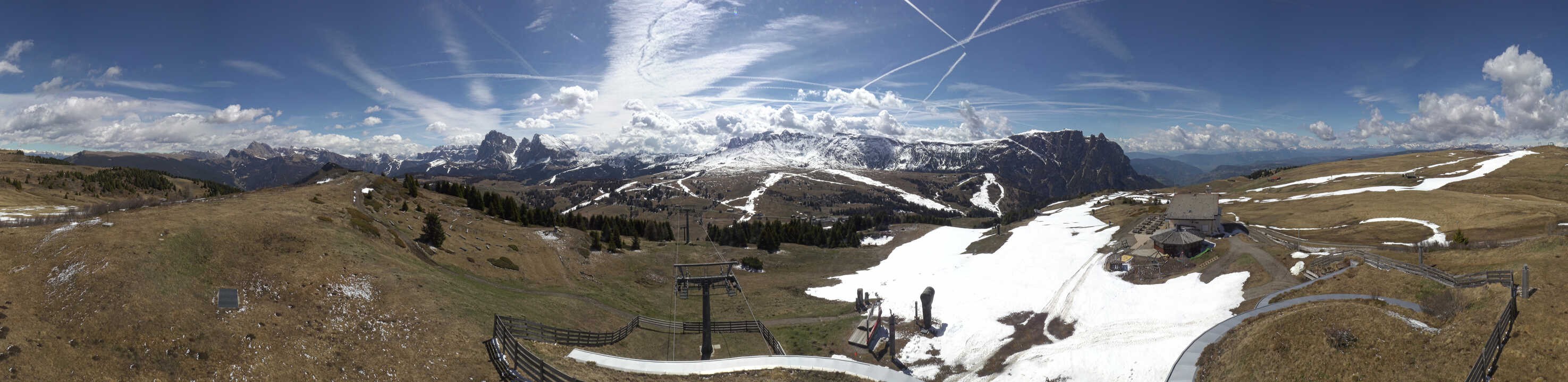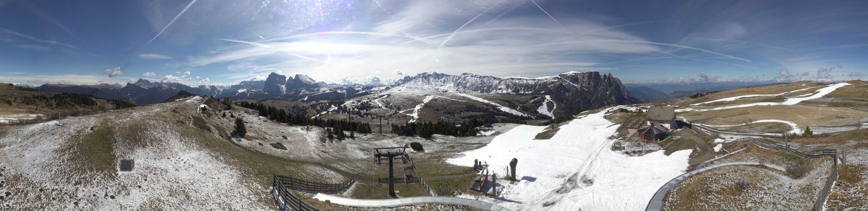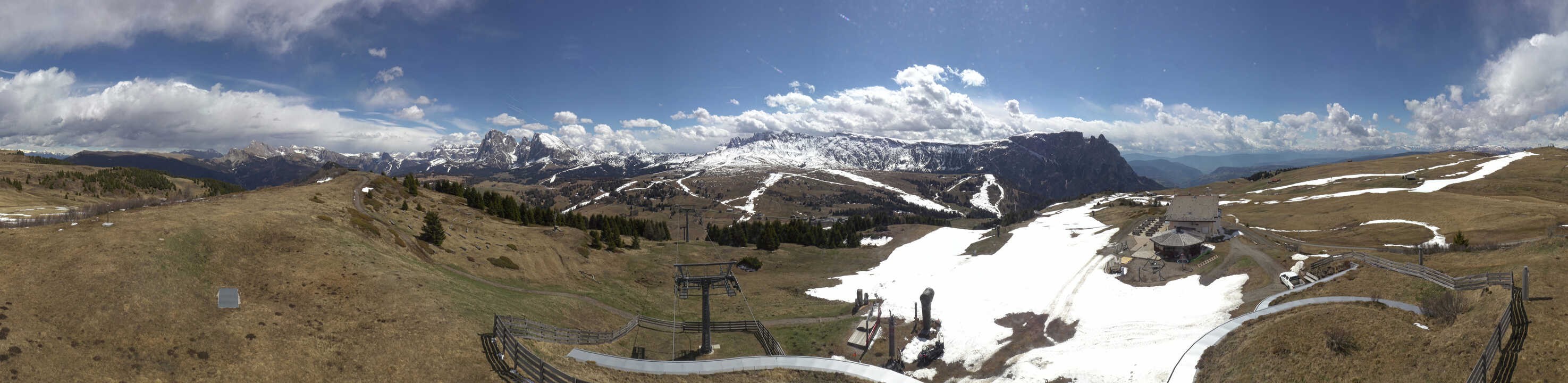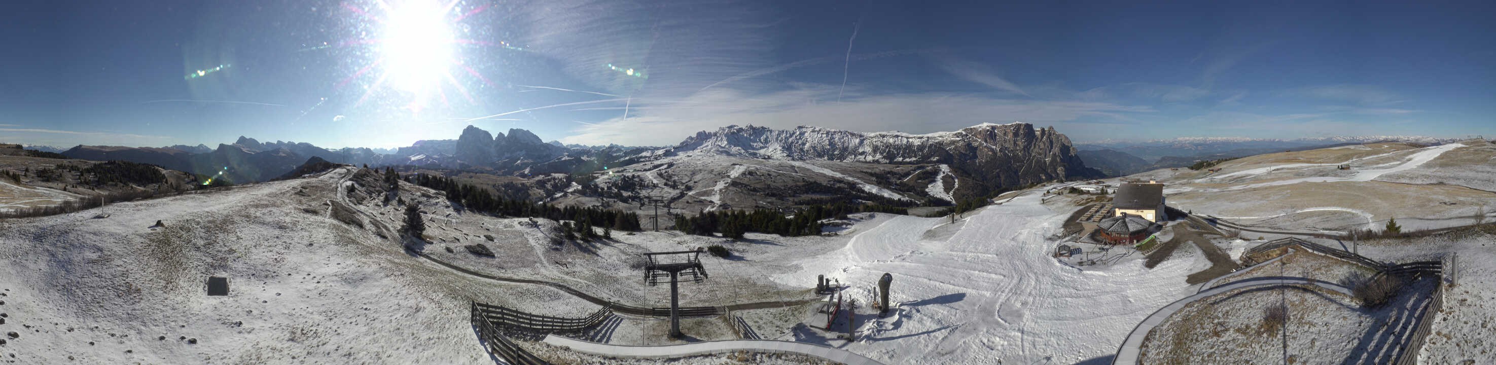 Here you can see the panorama of the Alpe di Siusi with the Sella Group, the Puez-Odle Group and the Gardena. On the right side of the picture is also the mountain restaurant Puflatsch, on the left you can see the cable car.