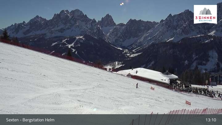 Archived webcam image showing Sextner Dolomites Skiing Mountain Helm on 26 Feb 2026 at 13:15 12:00