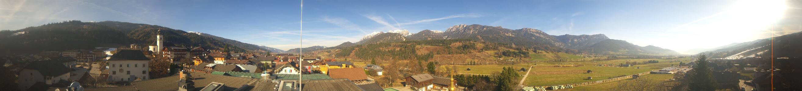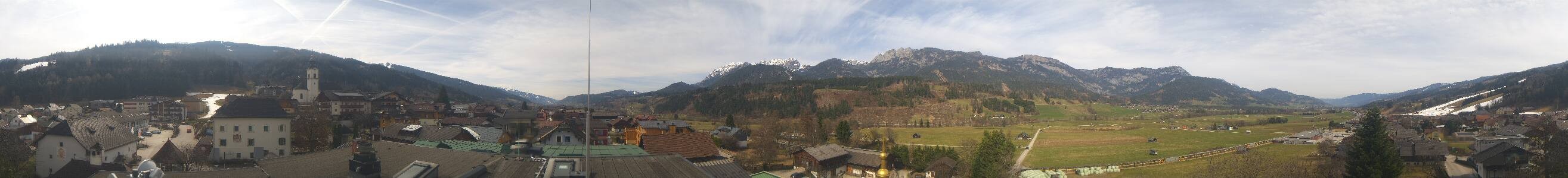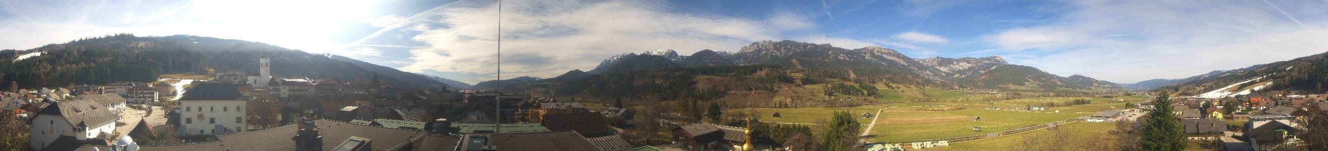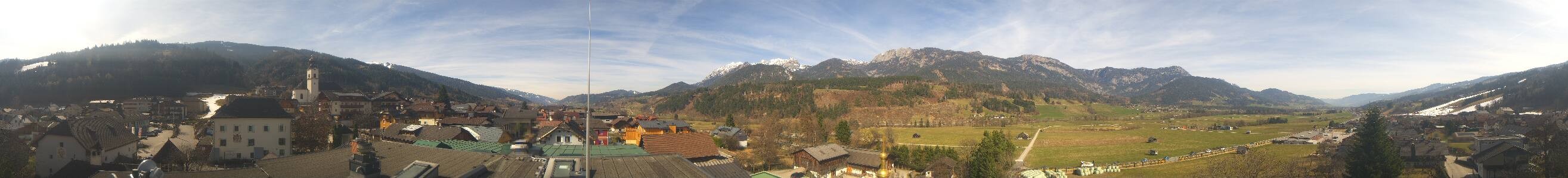 The panoramic camera opens the view towards the village of Haus im Ennstal in Styria. With good weather conditions the summits of the following mountains are visible in the background: Stoderzinken (2,048 m), Kammspitz (2,139 m), Hauser Kaibling (2,015 m), Planai (1,906 m) and Luserwand (2,135 m).