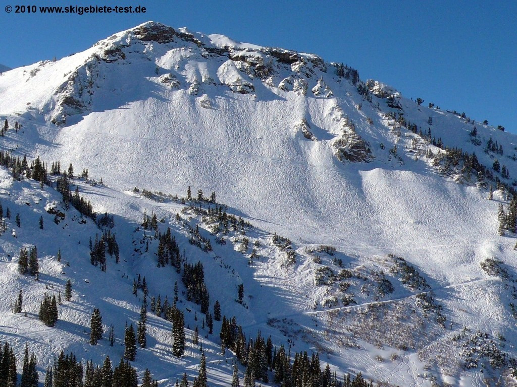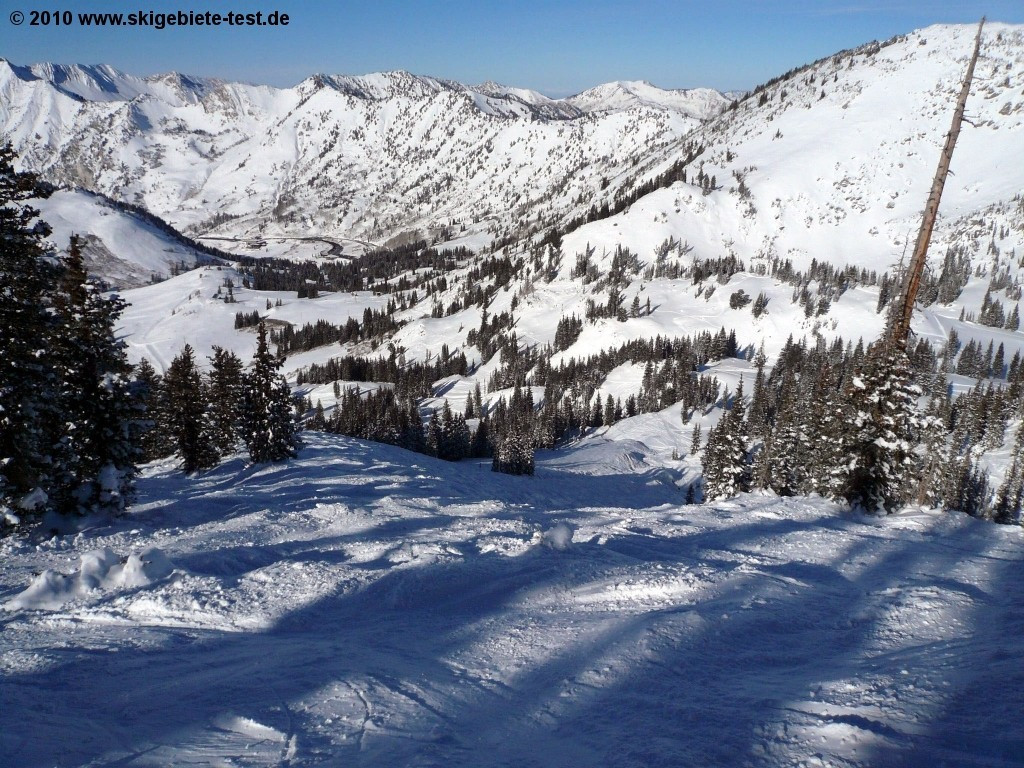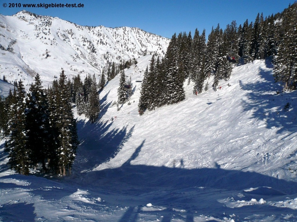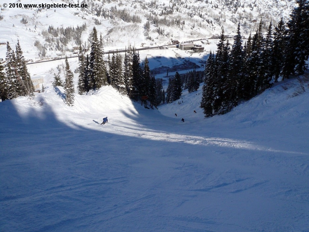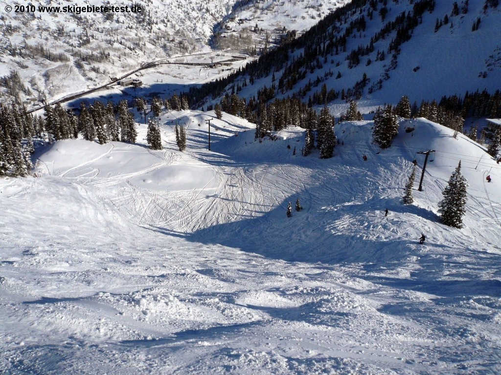 Alta is known beyond Utahs frontiers for being a challenging ski resort. And we found Alta to live up to its reputation. Especially the ungroomed terrain in “West Rustler” and “East Greeley” leaves nothing to be desired for powder-junkies that don’t shy away from wooded terrain. Very demanding terrain can be found also at the “Wildcat Chair” (only exception is trail 96 “Aggie`s Alley”). Especially the tail- parts of the trails are very steep and lead skiers through dense forests and over ledges. Those looking for even more challenge should purchase the Alta-Snowbird ticket in order to also experience the “Double Diamond Runs” in Snowbird. The only downer is a missing slalom or giant slalom training track – however that did not keep us from awarding Alta with our highest award possible in the expert category!