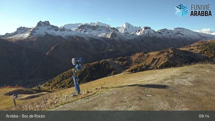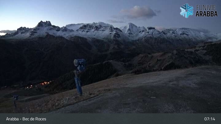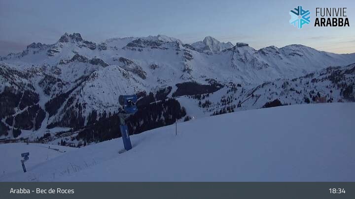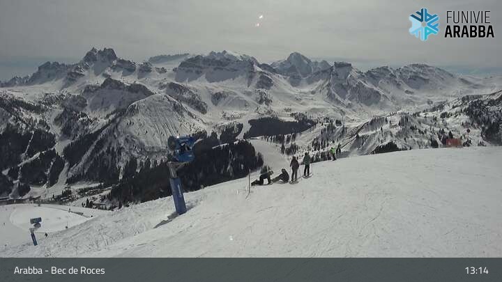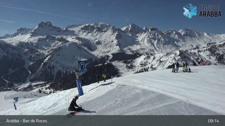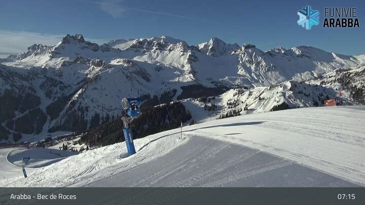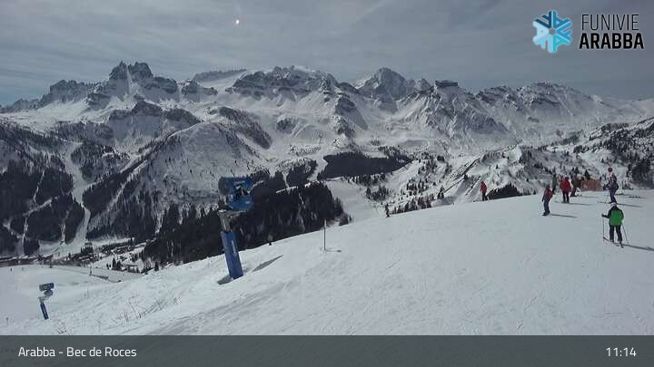 The webcam is located at the top station of the chairlift Arabba-Monte Burz in the ski resort of Arabba. You can see the mountain restaurant Rifugio Burz and the slopes at Le Pale chairlift.