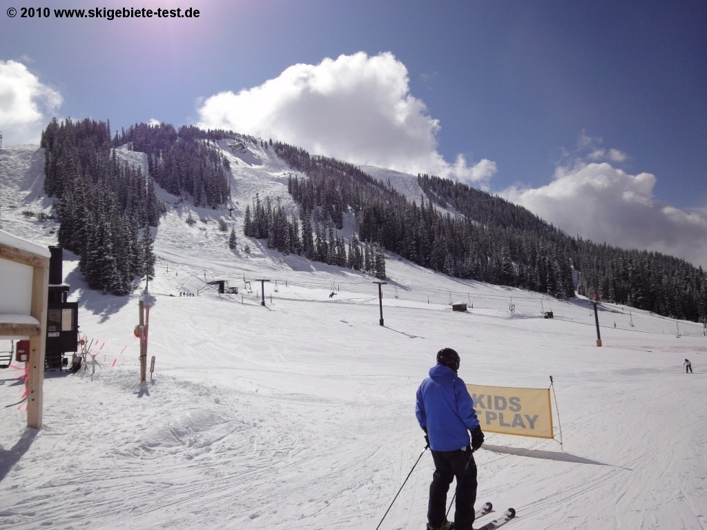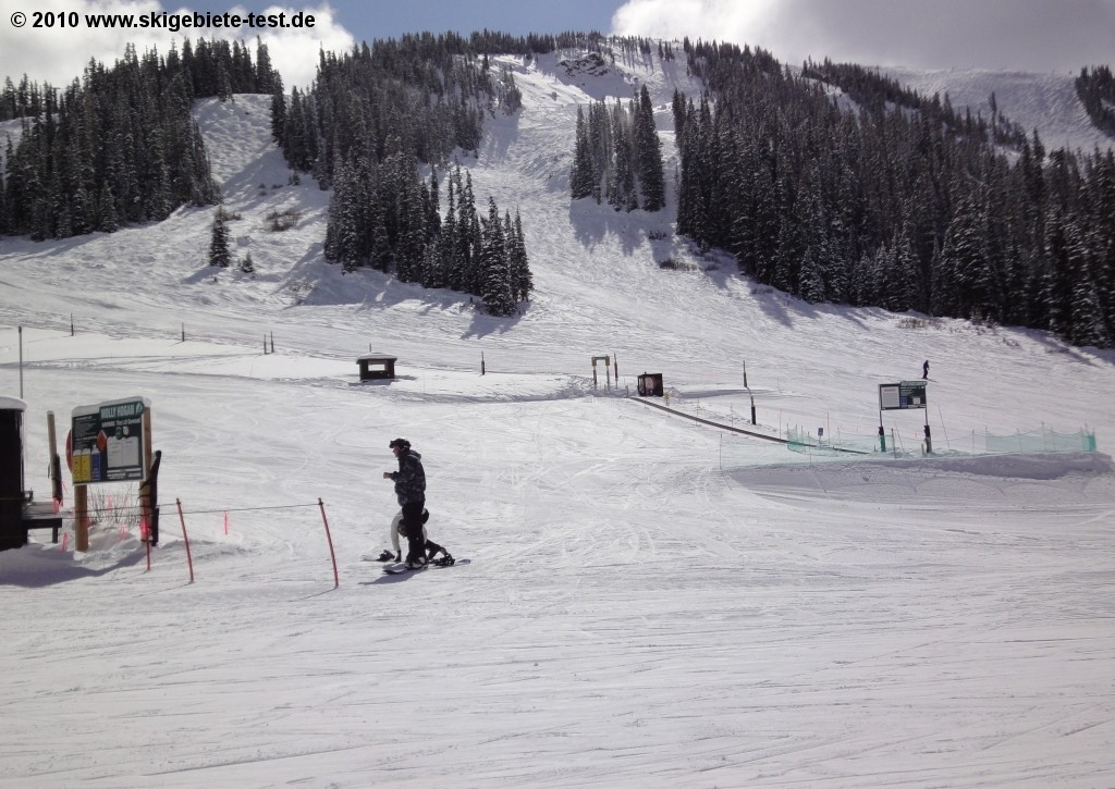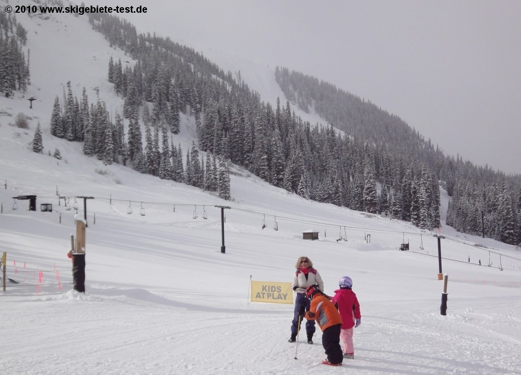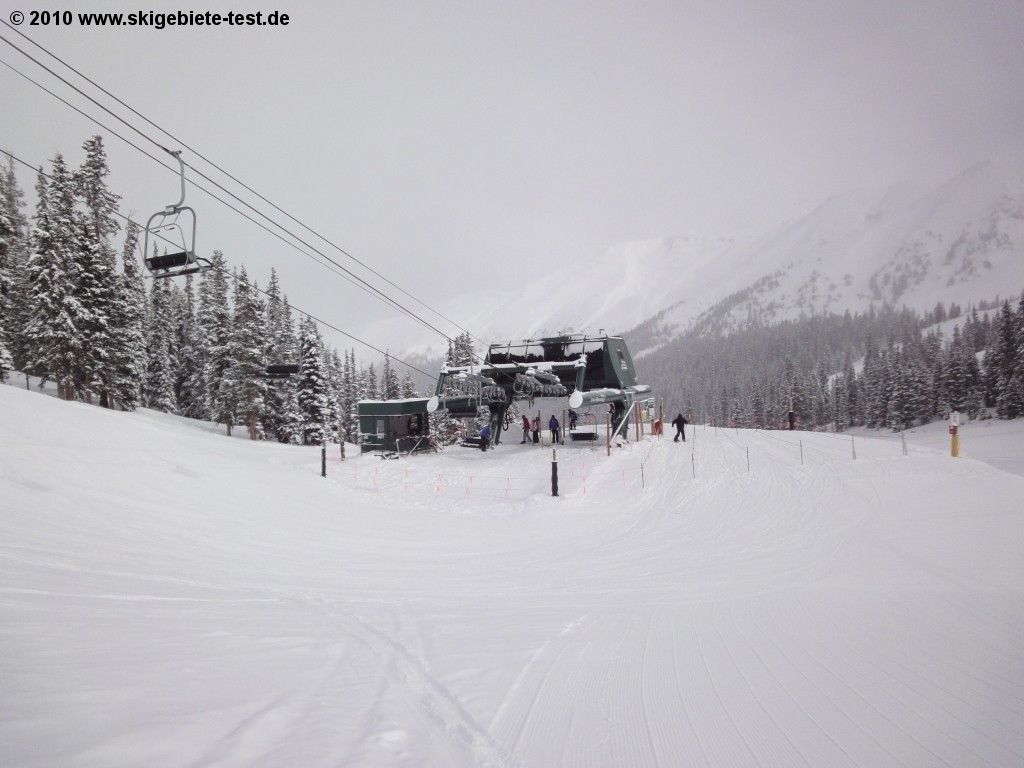 Arapahoe Basin is often advertised in American ski magazines as one of the most challenging ski areas in North America. And we can definitely confirm this claim. For families with small children, the selection of suitable trails is disproportionately smaller. Directly at the base, the Molly Hogan lift and a magic carpet lift access an approx. 300 meter long bunny slope where kids can practice their first strides on the snow under the supervision of either their parents or their ski instructors. The ski school is located in the Snow Sports building at the base. But after the kids have had some time to practice, they will unfortunately not have much of a selection of beginner trails higher up the mountain (see Test Category “Beginners”). Sundance and Wrangler are the only two beginners’ trails leading back from the top terminal of the Exhibition lift to the base. Once your kids are able to take on some slightly more difficult slopes, we recommend the Lenawee Mountain runs. But with children, the black diamond runs on Pallavicini should be avoided at all costs.