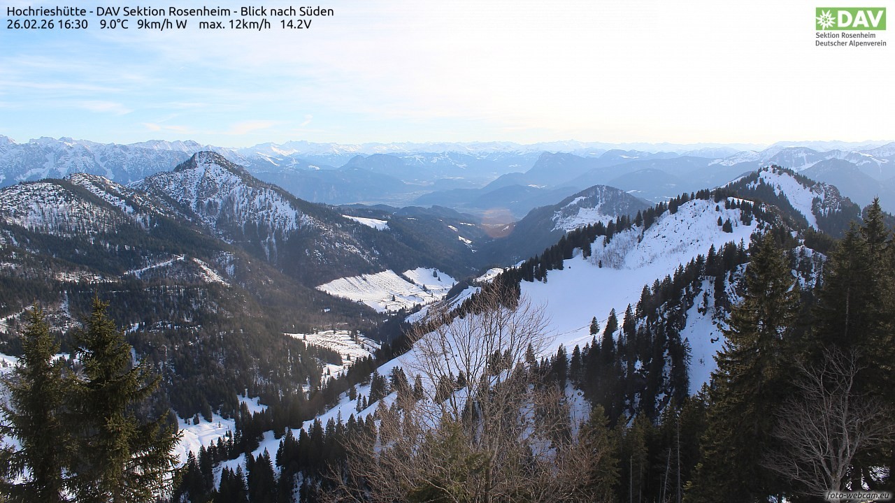 The webcam is located on a tree below the Hochrieshütte on the summit of the Hochries in the area Samerberg, south of Rosenheim. In the distance Kufstein can be seen in the middle, on the left there is the Spitzstein and in the background there is the Kaisergebirge.