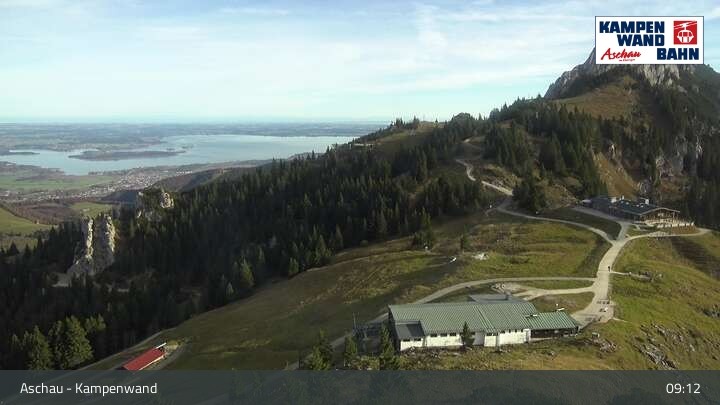 Panoramic view from the top station of Kampenwandbahn towards the alp SonnenAlm and lift Roßleiten