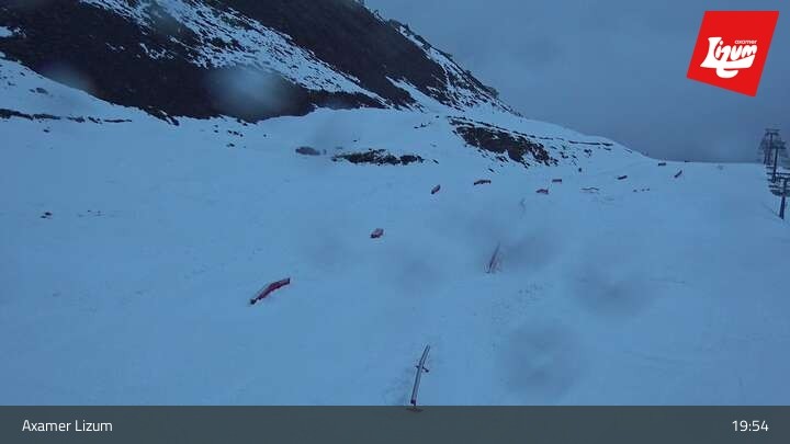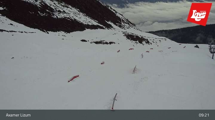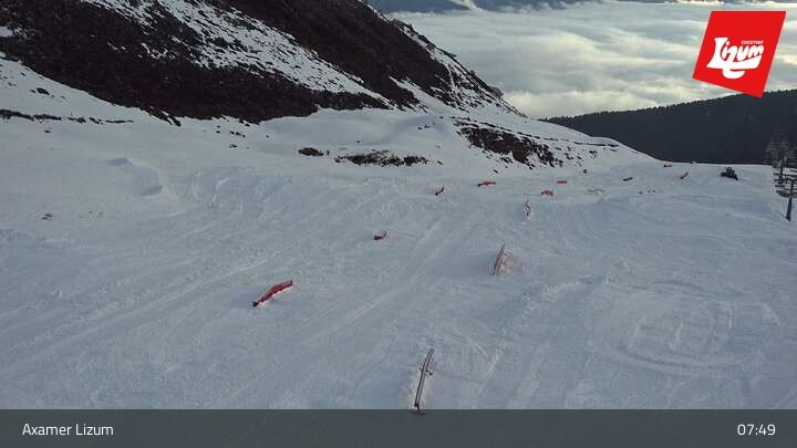 The camera looks from the top station of the 4-seater chairlift Karleitenlift onto the red slope no. 5 in the Axamer Lizum ski area. This is also where the snow park is located in winter.