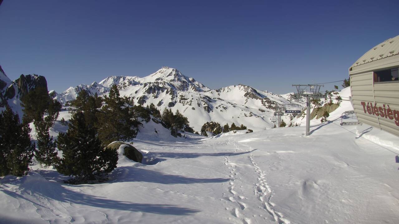 Located at 2,250m above sea level the webcam is looking down from the top station of Pourteilh chair lift in ski resort Grand Tourmalet, France.