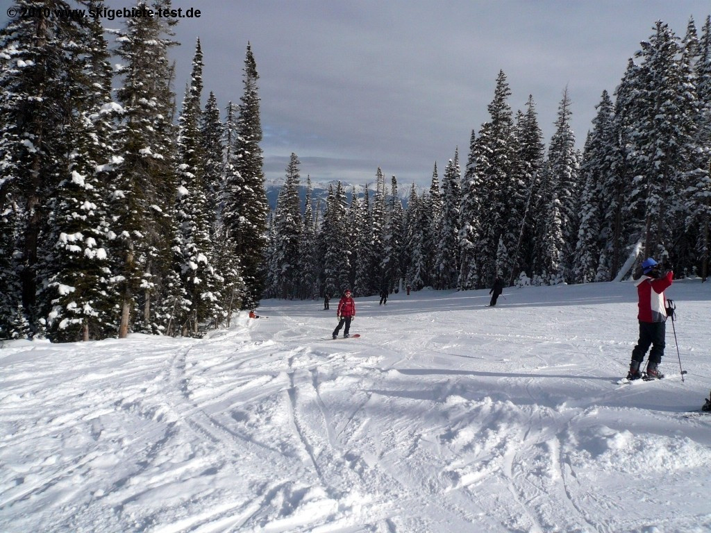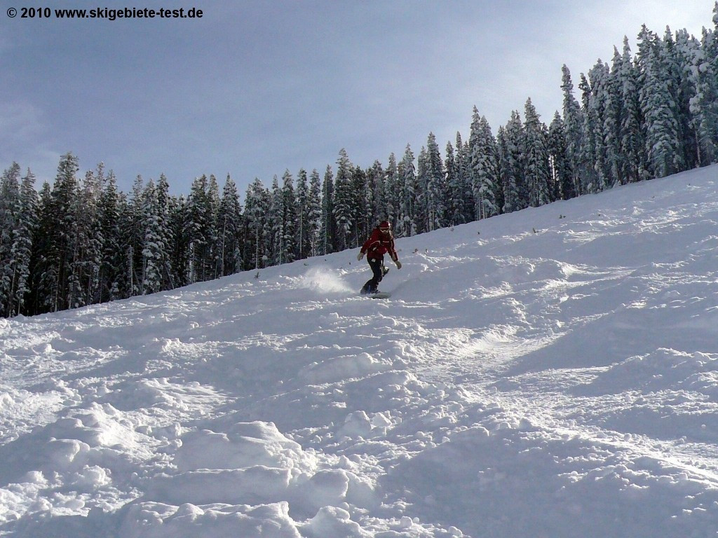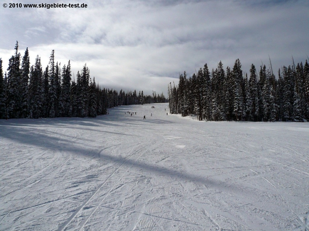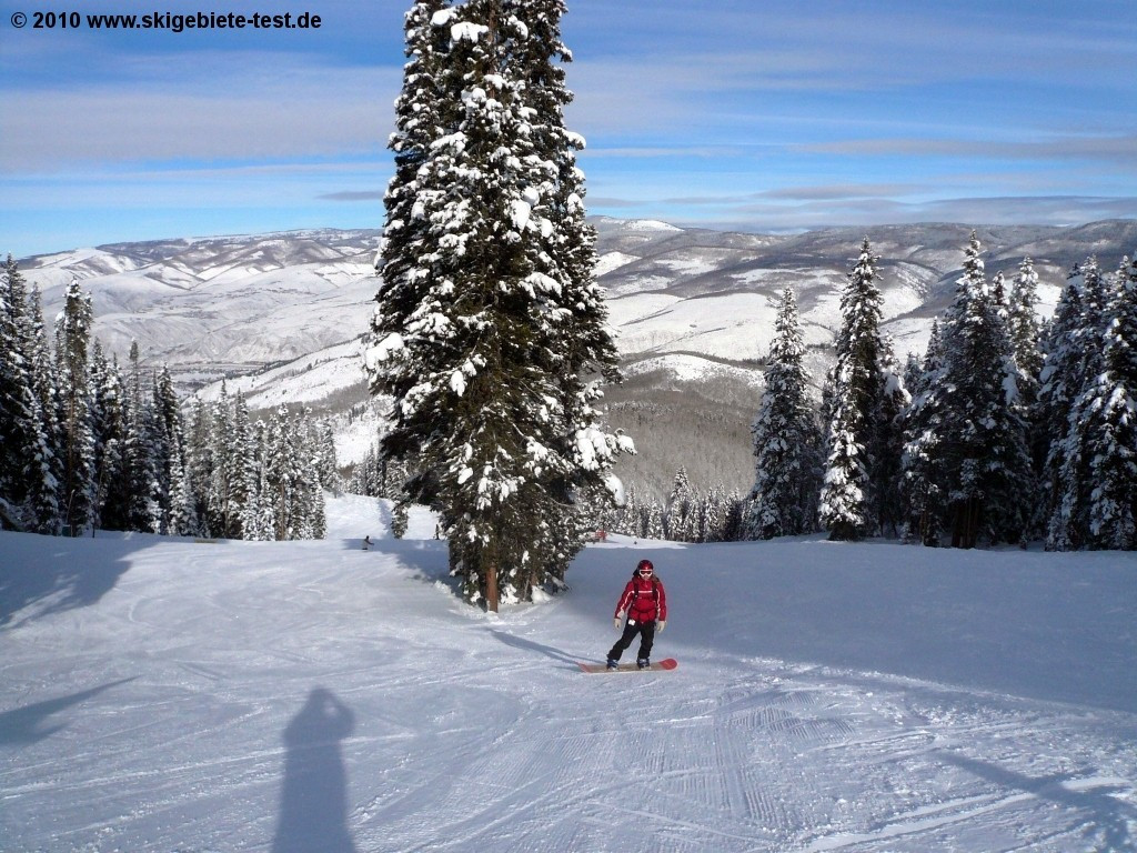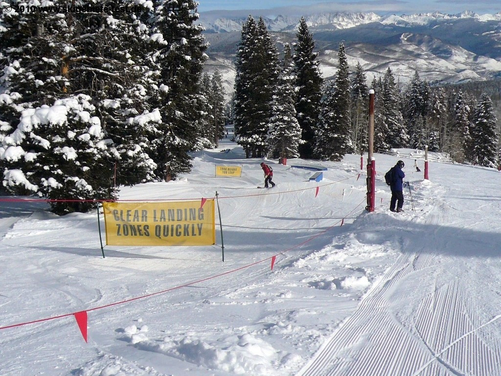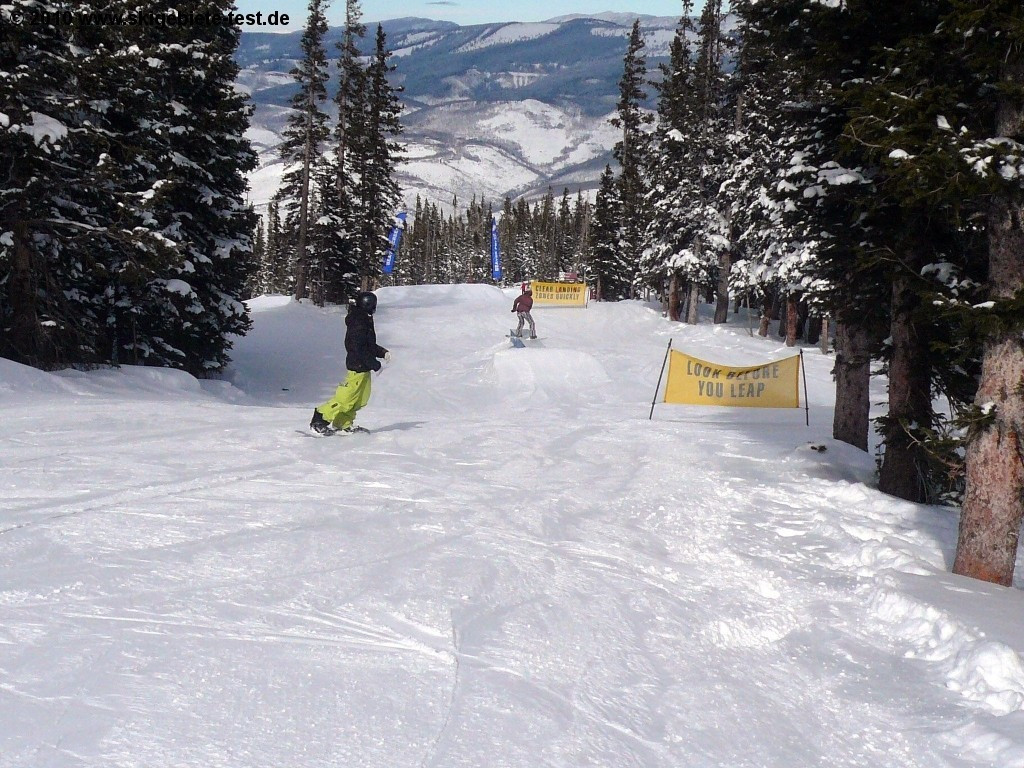 The terrain parks and the halfpipe are not quite as gigantic as in nearby Vail, however Snowboarders are still well catered to in Beaver Creek. “Park 101” is a rather small terrain park featuring easier obstacles, thus is the perfect place for all those that are not too experienced in the “Air & Style” department. The proximate “Zoom Room” focuses on intermediate boarders and free-skiers. Both parks are located close to the “Cinch Express” lifts (see trail map). The largest terrain-park in Beaver Creek, where also the half-pipe is located, is the “Moonshine” terrain-park at the “Bootleg” trail and can be accessed via the “Centennial Express”. Very skilled boarders that prefer ungroomed terrain should venture into the grounds between the “Centennial Express” and the “Birds of Prey Express”. Novice Boarders find excellent novice-facilities and terrain at the Beaver Creek Village base or can explore the numerous easy trails in the Arrowhead subarea (details see beginner category).