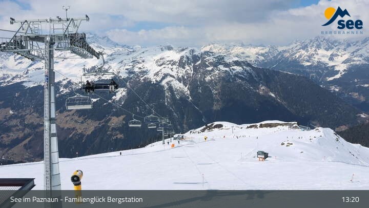Archiviertes Webcam Bild: Bergbahnen See: Familienglück Bergstation am 22.03.2026 um 13:13 Uhr 13:00