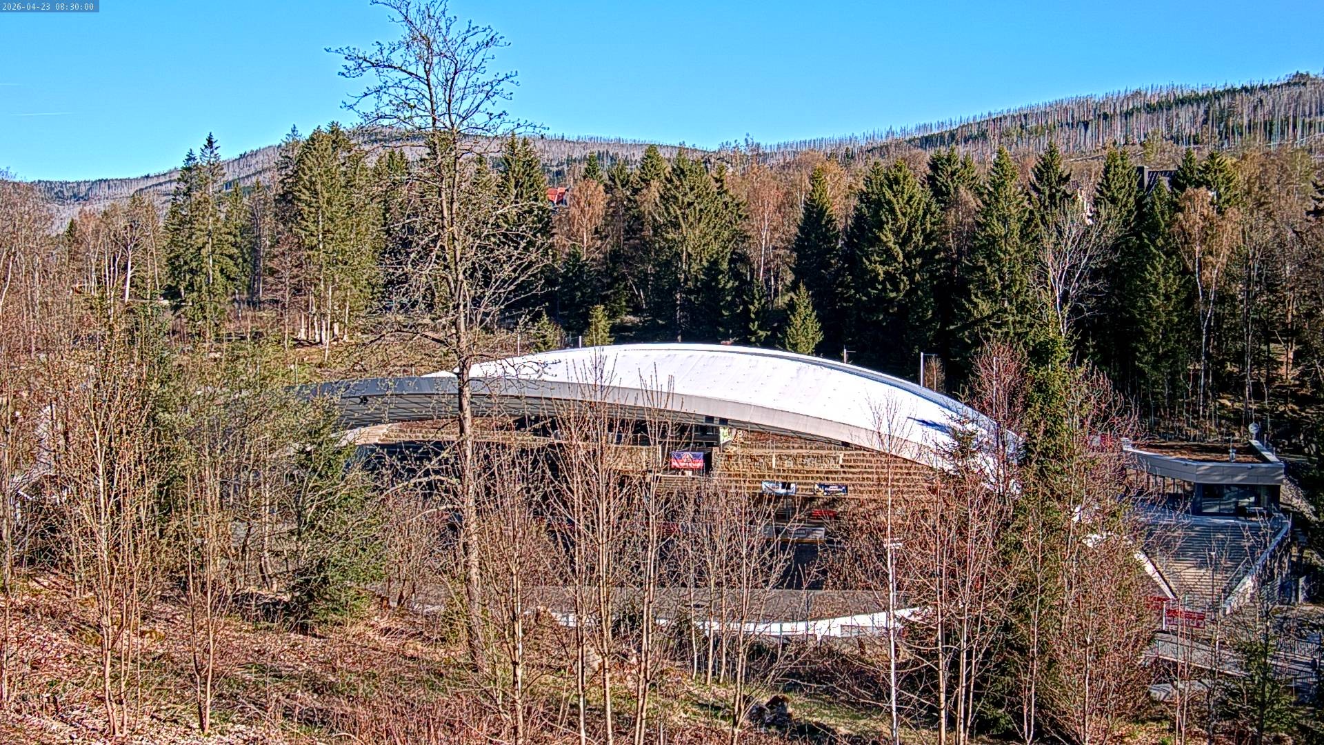 The webcam shows the view of the multifunctional arena in Schierke. The Schierker Feuerstein Arena has a very futuristic roof.