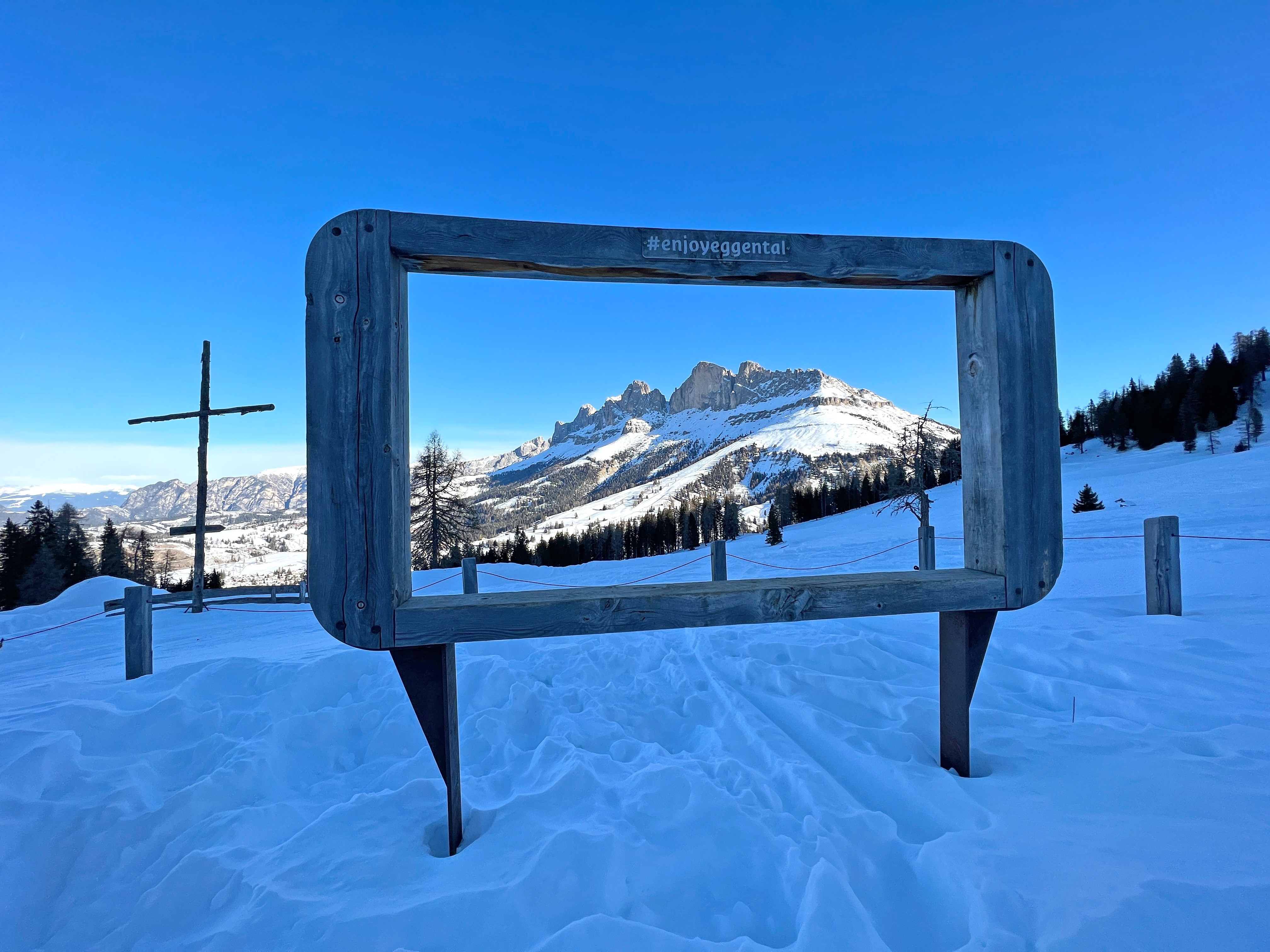 A small detour that is definitely worthwhile for a great photo is located on the red slope 55 at the Pra di Tori lift. Here you come to the photo point Eggentaler Bergkino a bit off the trail.