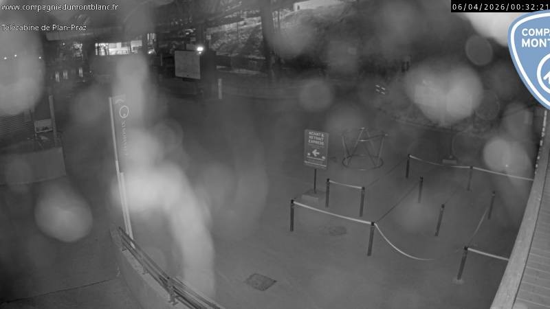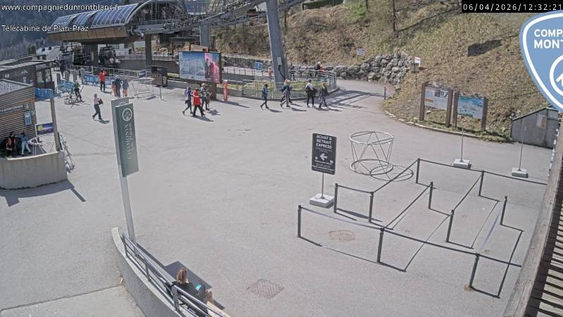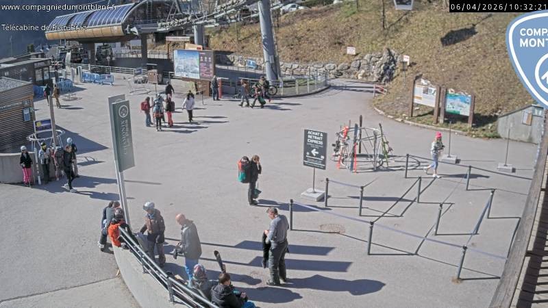The webcam shows the base station of the gondola Plan Praz in the ski area Charmonix Brévent-Flégère.