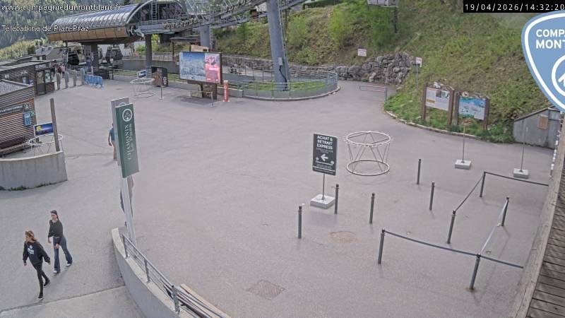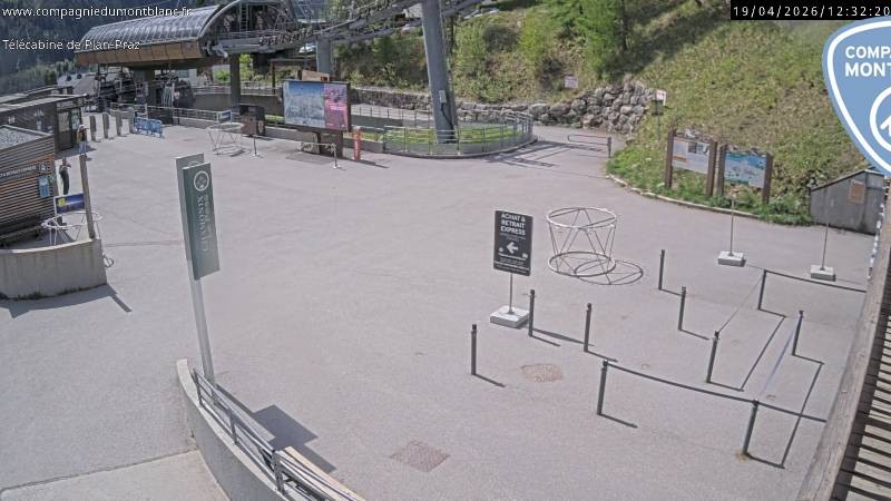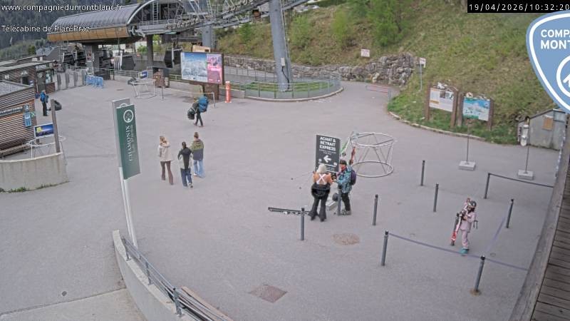 The webcam shows the base station of the gondola Plan Praz in the ski area Charmonix Brévent-Flégère.