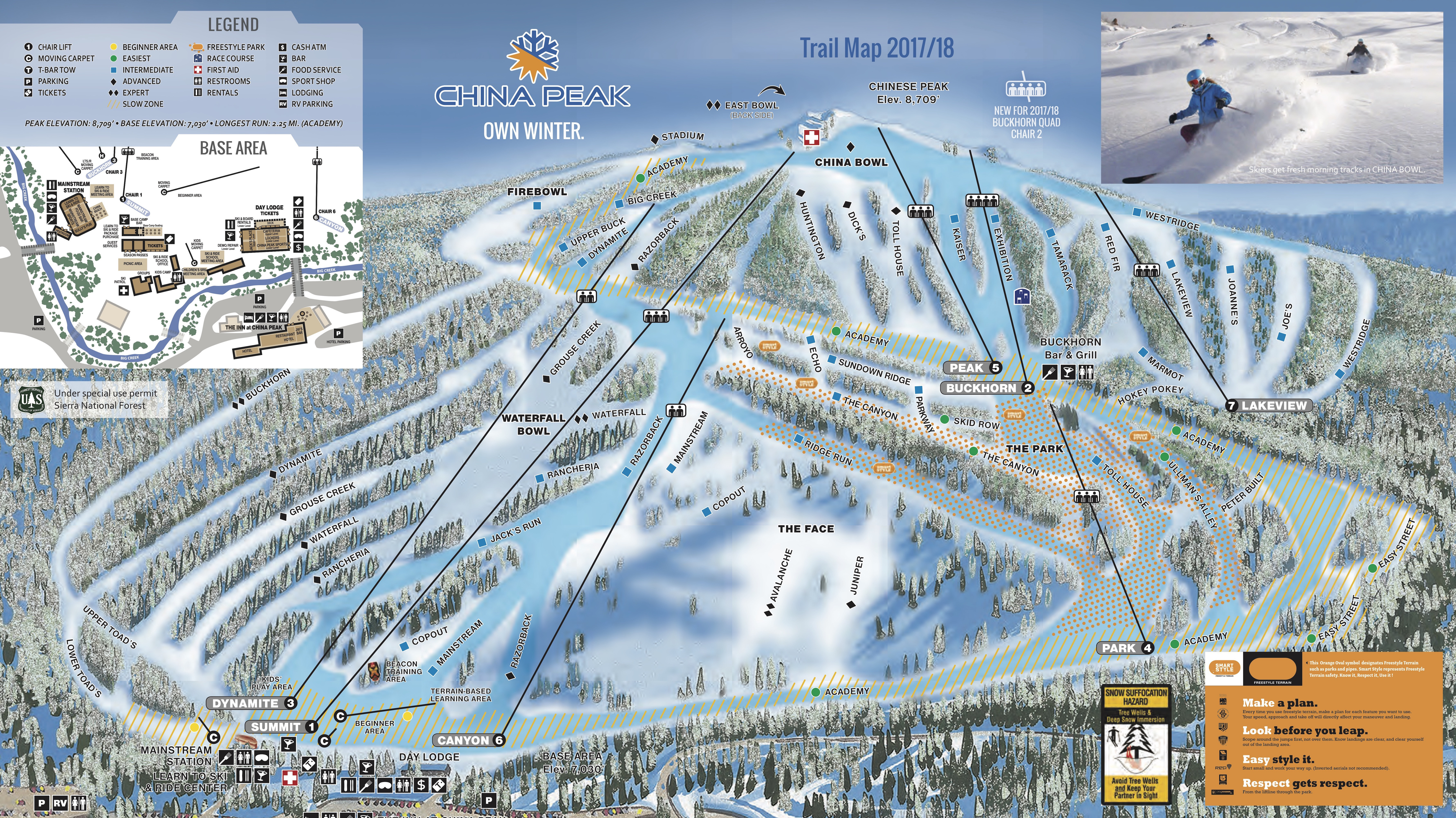 China Peak was founded in 1959 under the name of China Peak. However, it was named Sierra Summit after is was sold in 1981. Yet, now it got its name back and you will still find all the greatness you already know and even a little bit more. With an elevation of 2650 meters and a terrain of 182 hectares you will find everything you expect from a real mountain resort.